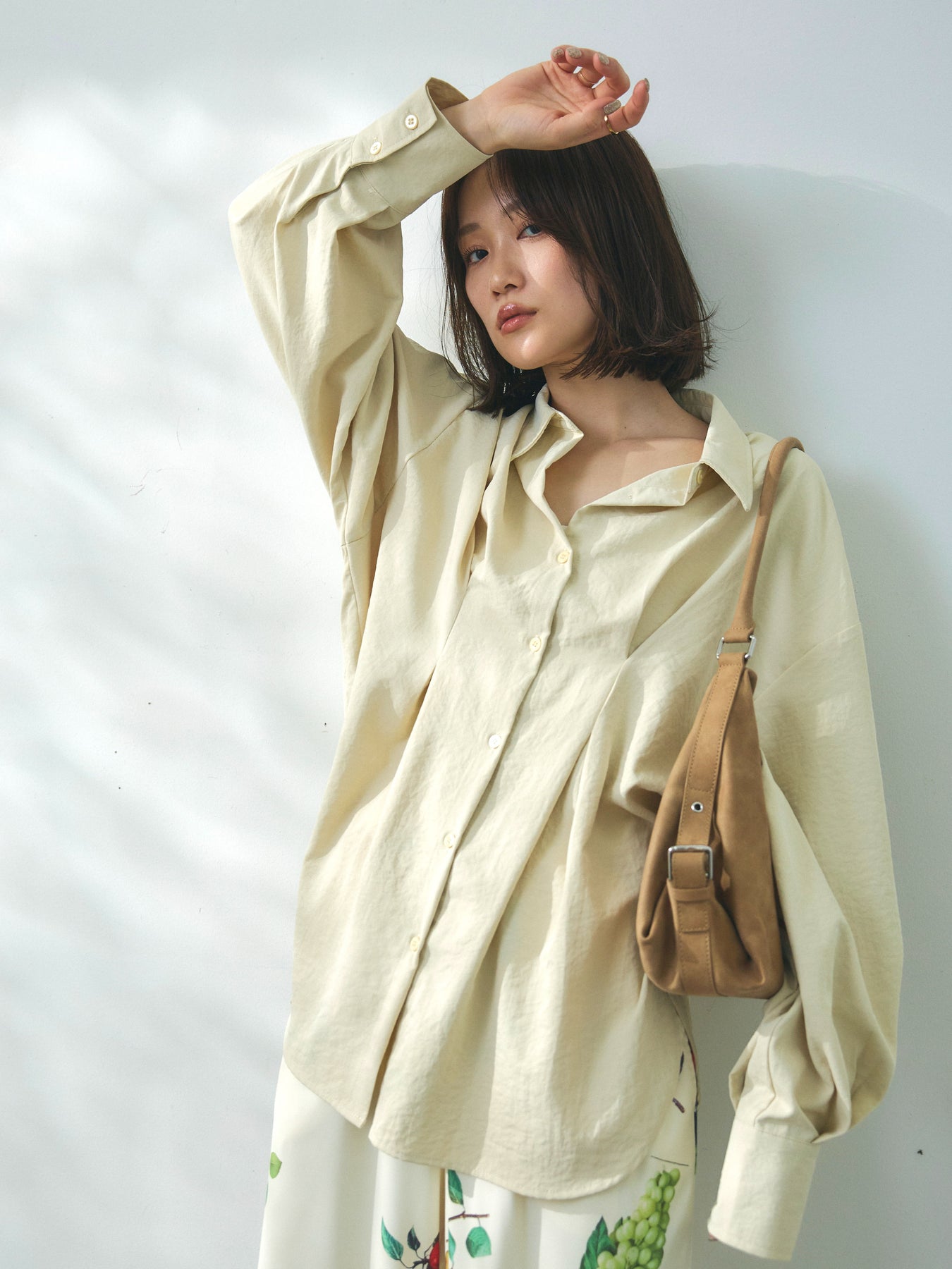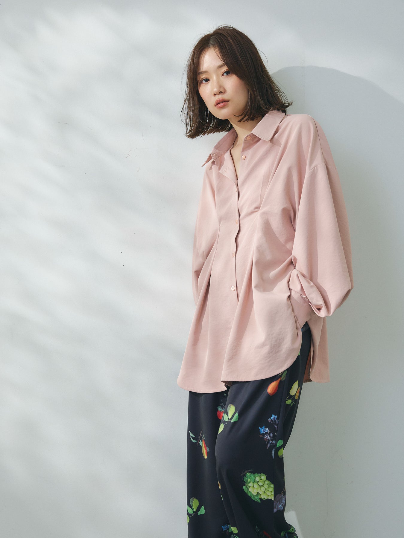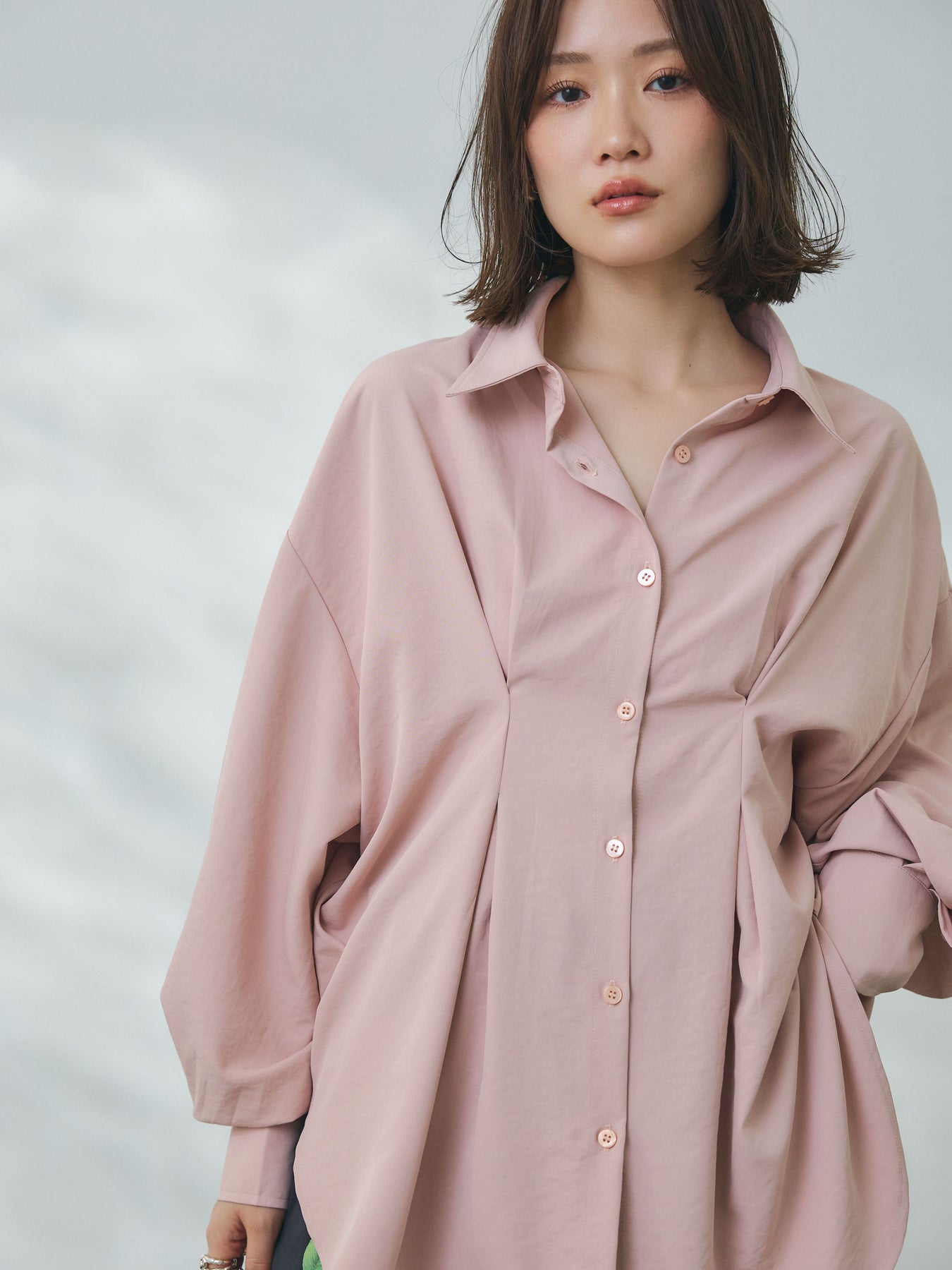 ウエスト部分に施されたタックデザインが立体的なシルエットを生み出すシャツ。程よいハリと落ち感を兼ね備えた合繊素材を使用し、きれいめな印象と軽やかな着心地を両立しています。フロントはシンプルなシャツデザインながら、ウエストのドレープがさりげないアクセントとなり、1枚でスタイリングに動きをプラス。ゆとりのあるシルエットでリラックス感がありつつも、メリハリのあるバランスに仕上がっています。パンツにもスカートにも合わせやすく、デイリーからきれいめなシーンまで幅広く活躍する一着です。 ※ボトムス、キャミソール(インナー)以外の商品は一律でインナーは付属していません。