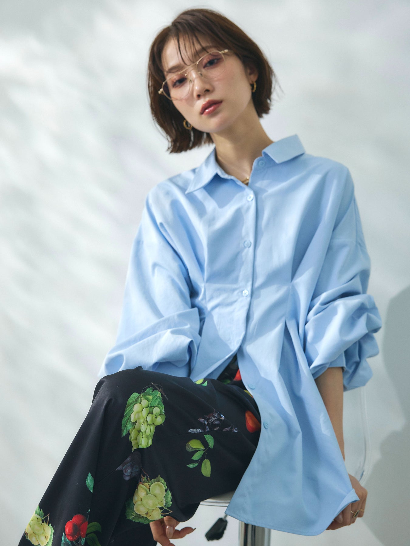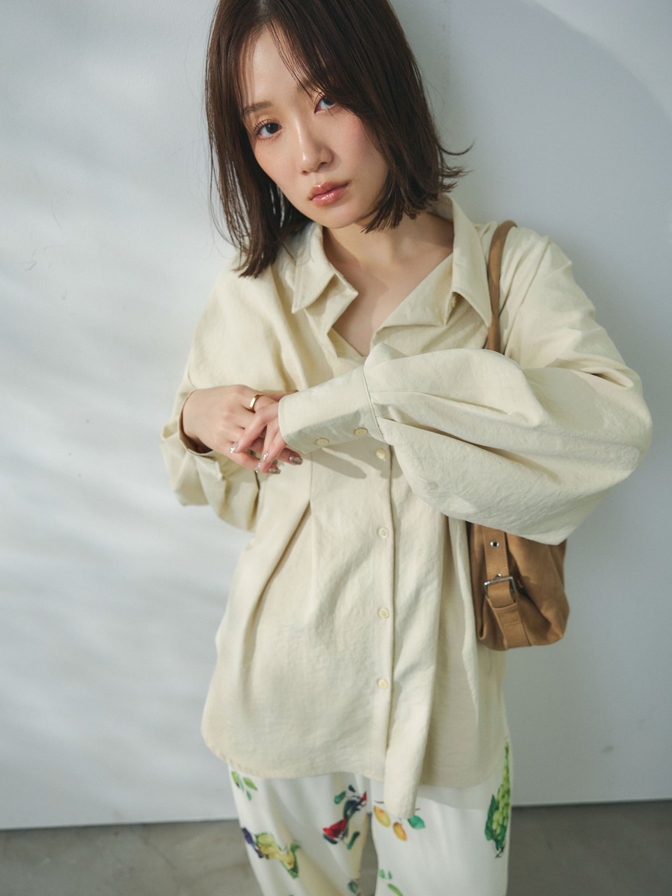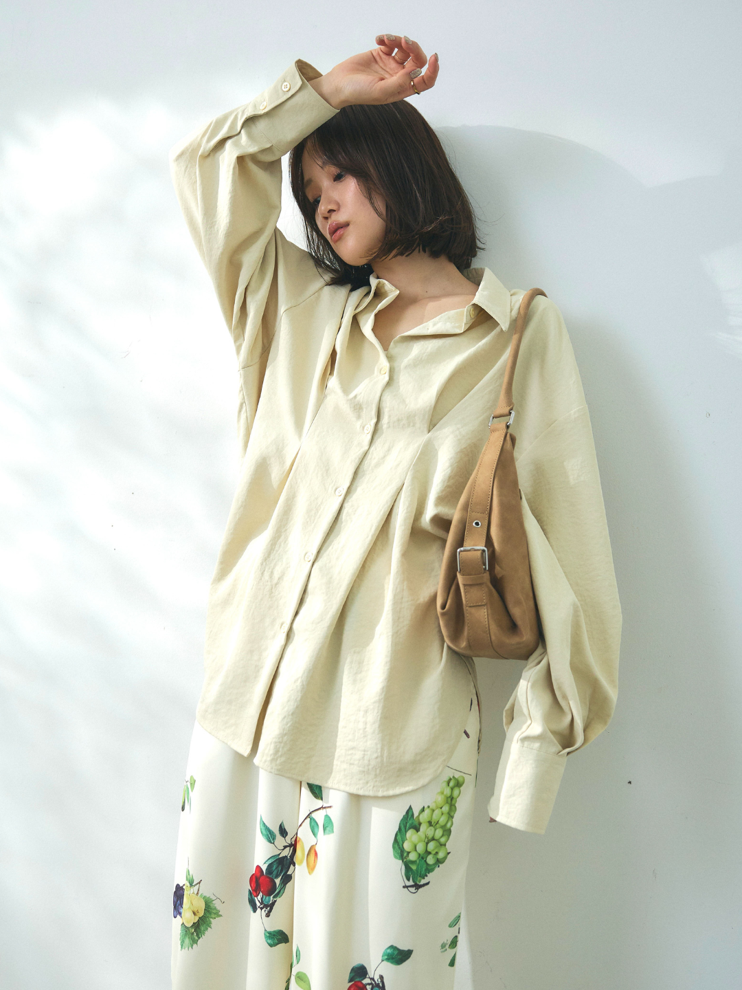 ウエスト部分に施されたタックデザインが立体的なシルエットを生み出すシャツ。程よいハリと落ち感を兼ね備えた合繊素材を使用し、きれいめな印象と軽やかな着心地を両立しています。フロントはシンプルなシャツデザインながら、ウエストのドレープがさりげないアクセントとなり、1枚でスタイリングに動きをプラス。ゆとりのあるシルエットでリラックス感がありつつも、メリハリのあるバランスに仕上がっています。パンツにもスカートにも合わせやすく、デイリーからきれいめなシーンまで幅広く活躍する一着です。 ※ボトムス、キャミソール(インナー)以外の商品は一律でインナーは付属していません。