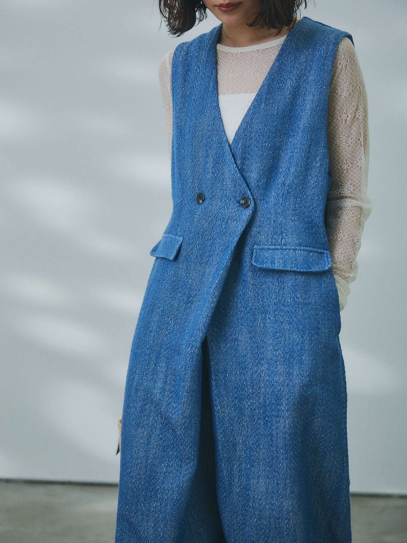 デニムのような風合いとヘリンボーンの織り柄が魅力のサロペット。カジュアルすぎない上品な素材感で、大人っぽいスタイリングにも取り入れやすい一着に仕上げています。深めのVネックデザインとすっきりとした縦のラインがバランスよく、レイヤードスタイルでも重たくならず軽やかな印象に。程よくゆとりのあるシルエットで体のラインを拾いにくく、リラックス感のある着心地も魅力です。インナーを変えることでシーズンレスに着用でき、デイリーからお出かけまで幅広いシーンで活躍するアイテムです。 ※ボトムス、キャミソール(インナー)以外の商品は一律でインナーは付属していません。