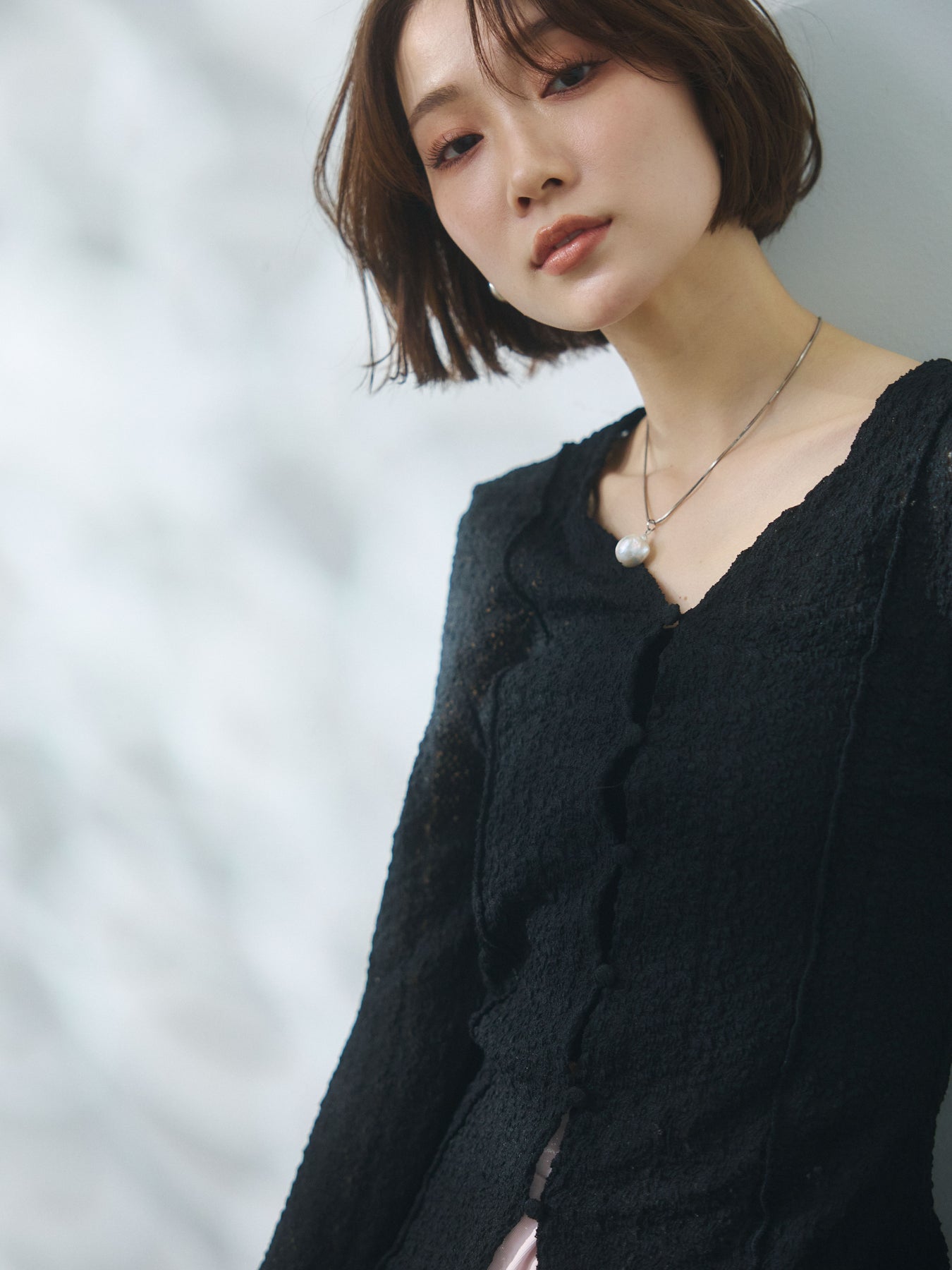 繊細なレース素材にストレッチ性を加えた、着心地の良いカーディガン。ボディに程よくフィットするシルエットが女性らしいラインを引き立てつつ、伸縮性のある生地でストレスフリーに着用いただけます。フロントのボタンデザインとVネックラインがすっきりとした印象を与え、1枚でもバランスよく着こなせる一着。袖口に向かって広がるさりげないフレアデザインが手元に動きをプラスし、スタイリングに柔らかなニュアンスを添えます。トップスとしても羽織りとしても活躍し、デイリーからきれいめなシーンまで幅広く取り入れやすいアイテムです。 ※ボトムス、キャミソール(インナー)以外の商品は一律でインナーは付属していません。