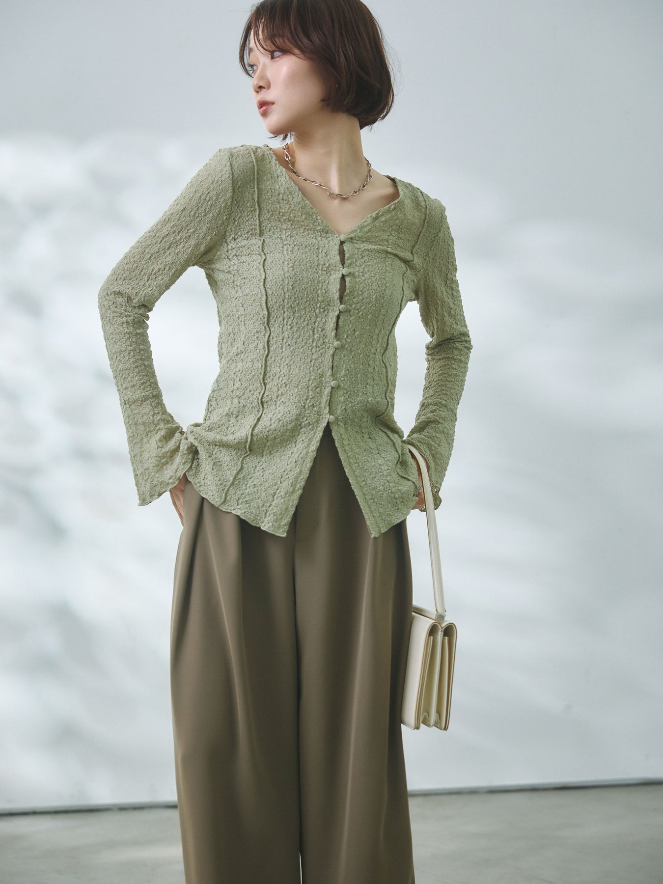 【Allure】[SET]ストレッチレースカーディガン+エステルツイルタックワイドパンツ(2set)