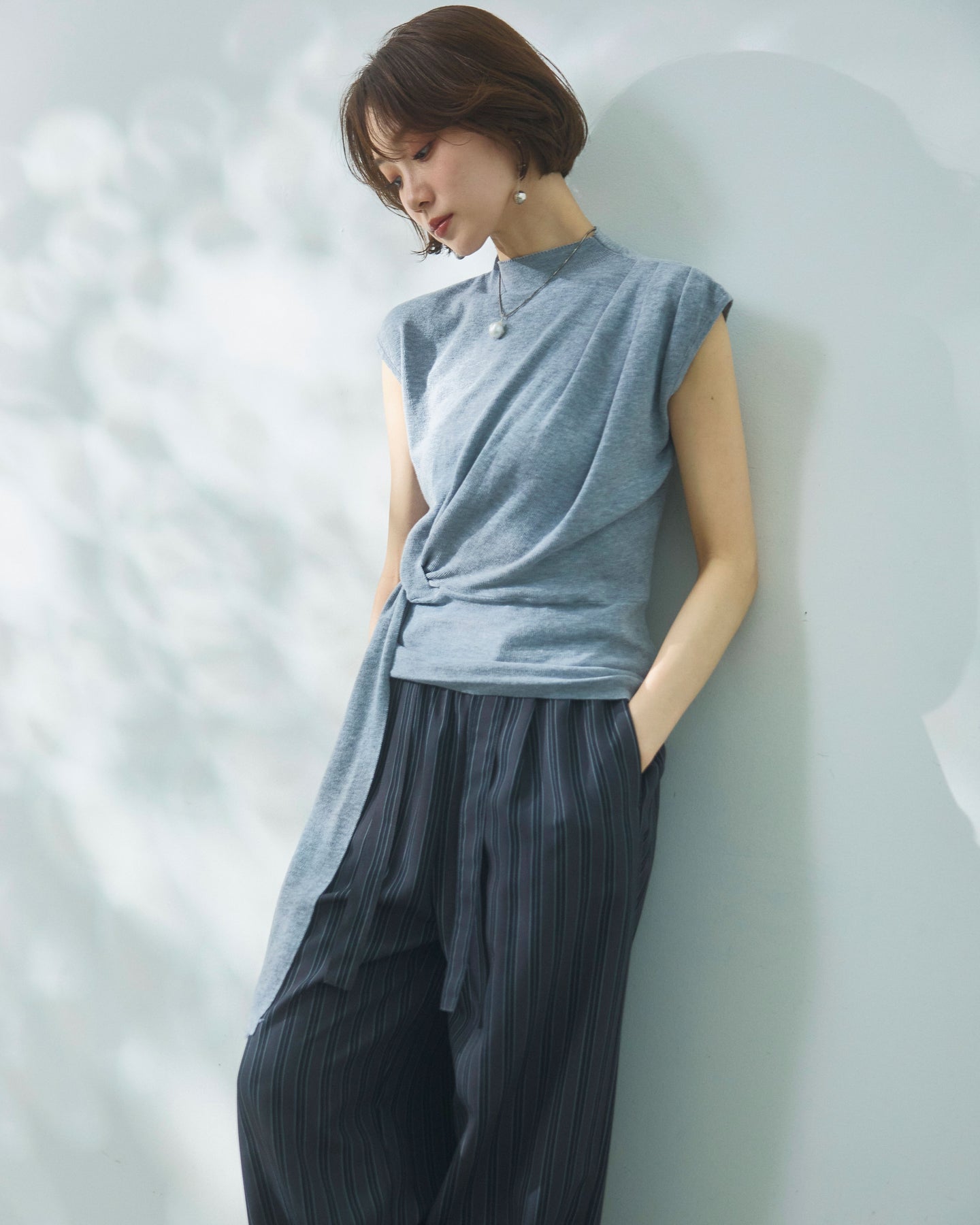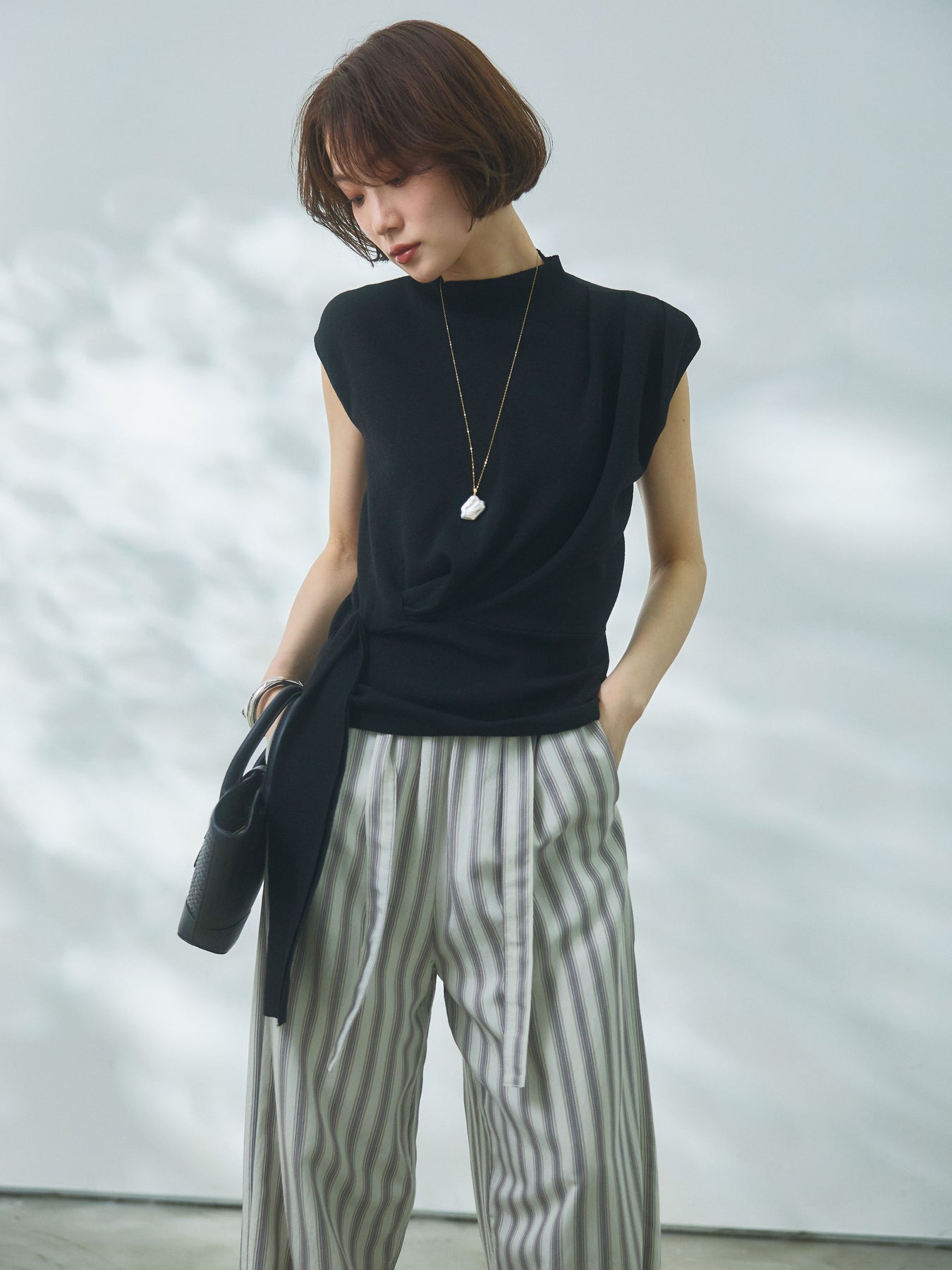 サイドに施されたベルトデザインが印象的なノースリーブニットトップス。ボトルネックが上品な雰囲気を演出し、すっきりとしたシルエットで洗練された印象に仕上げています。ウエスト部分のベルトディテールが立体感を生み、自然なドレープとメリハリのあるラインを演出。程よくフィットする柔らかなニット素材で着心地も良く、デイリーに取り入れやすい一着です。パンツにもスカートにも合わせやすく、シンプルなスタイリングにアクセントを加える、着映え力の高いアイテムです。 ※ボトムス、キャミソール(インナー)以外の商品は一律でインナーは付属していません。
