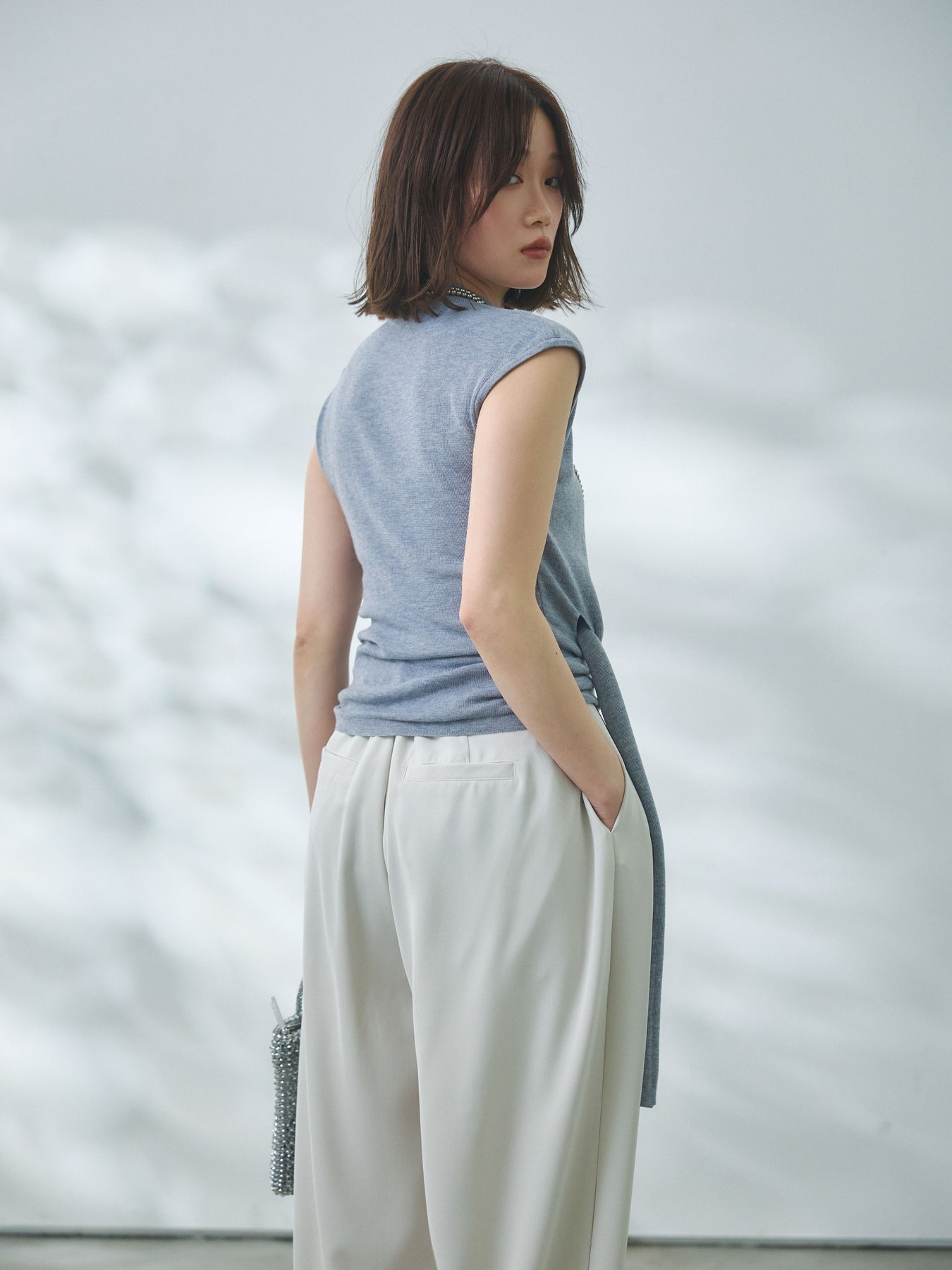 ◆ [予約]サイドベルトボトルネックノースリーブニットトップス