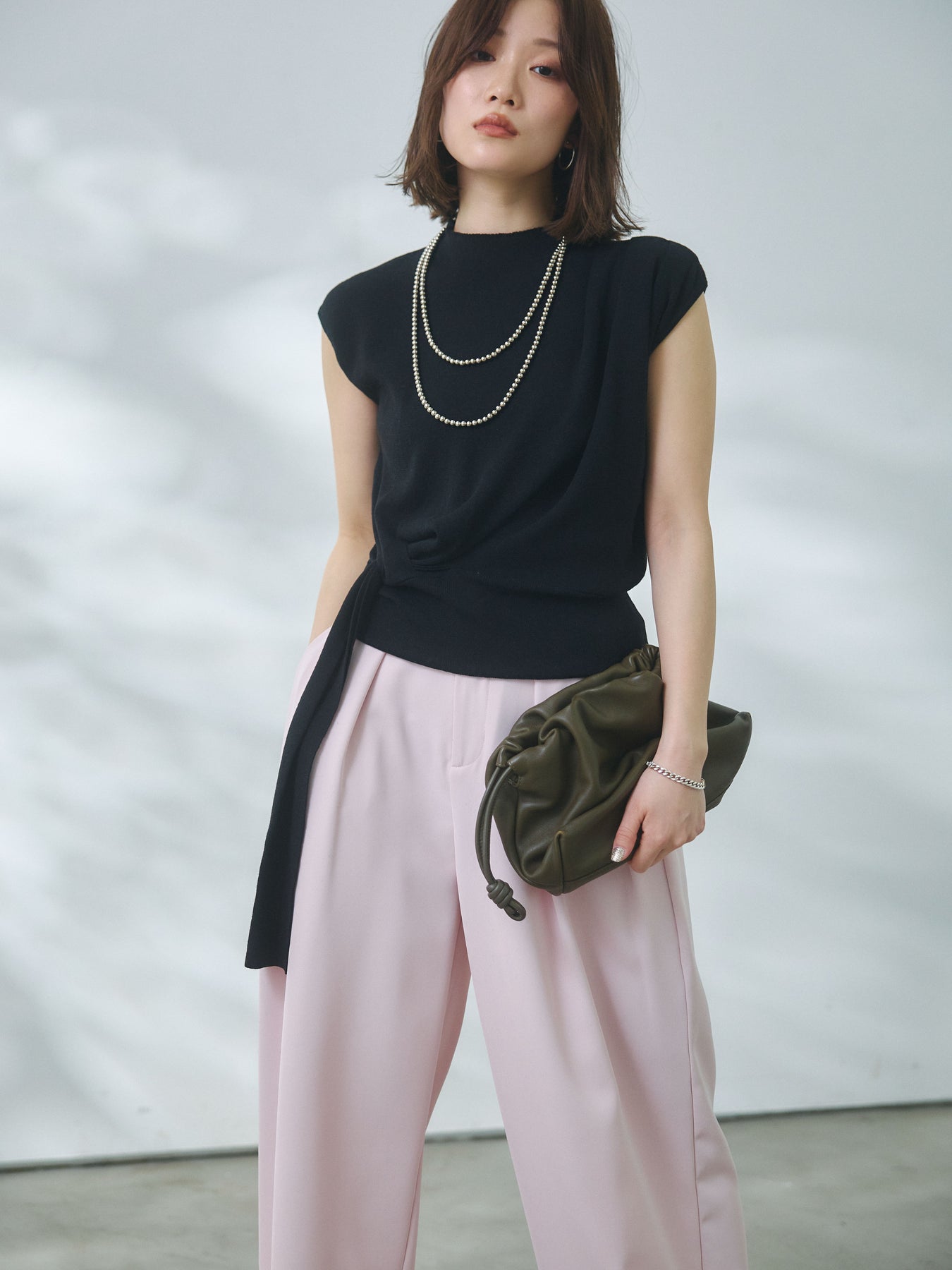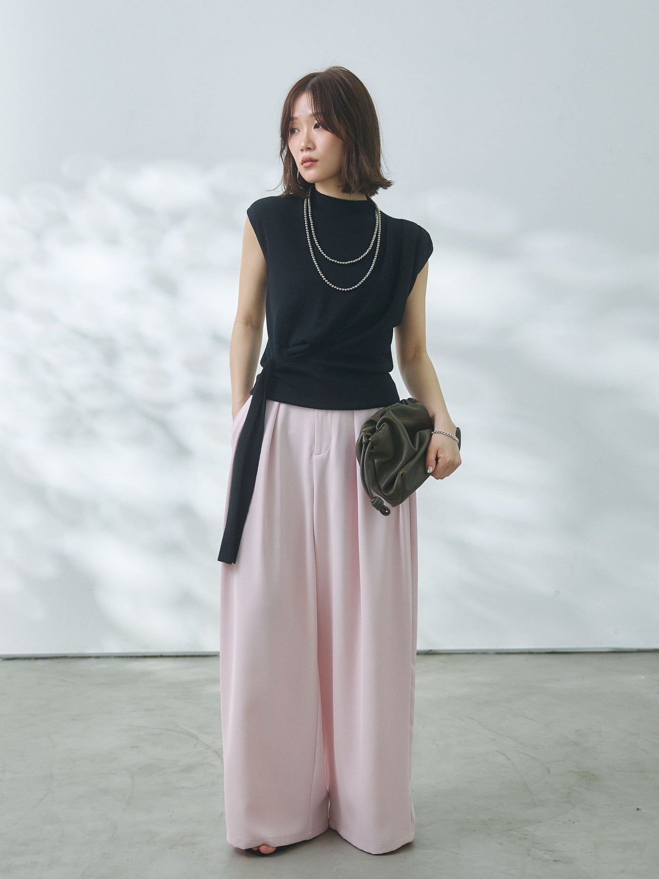 【Allure】[SET]サイドベルトボトルネックノースリーブニットトップス+エステルツイルタックワイドパンツ(2set)
