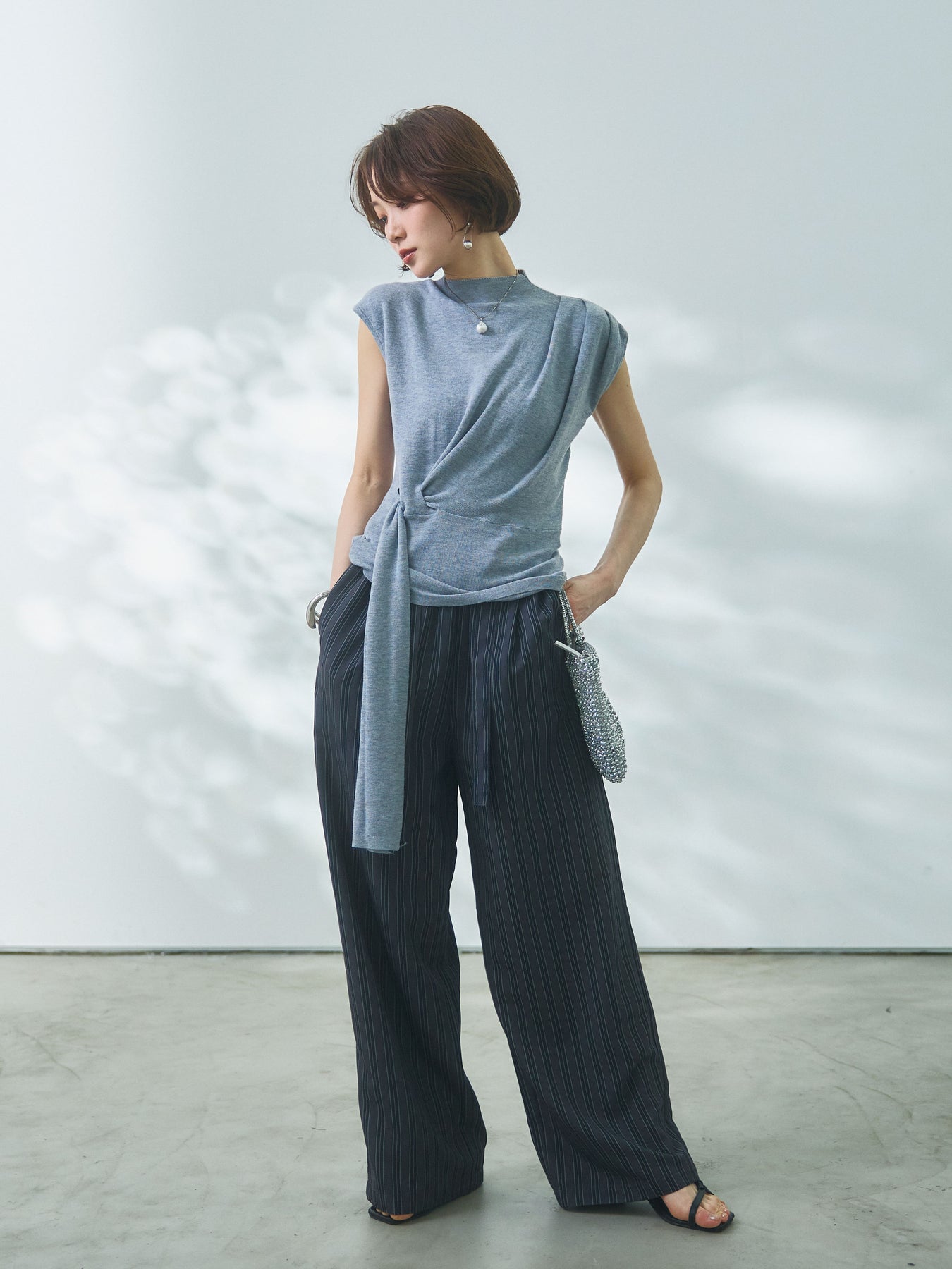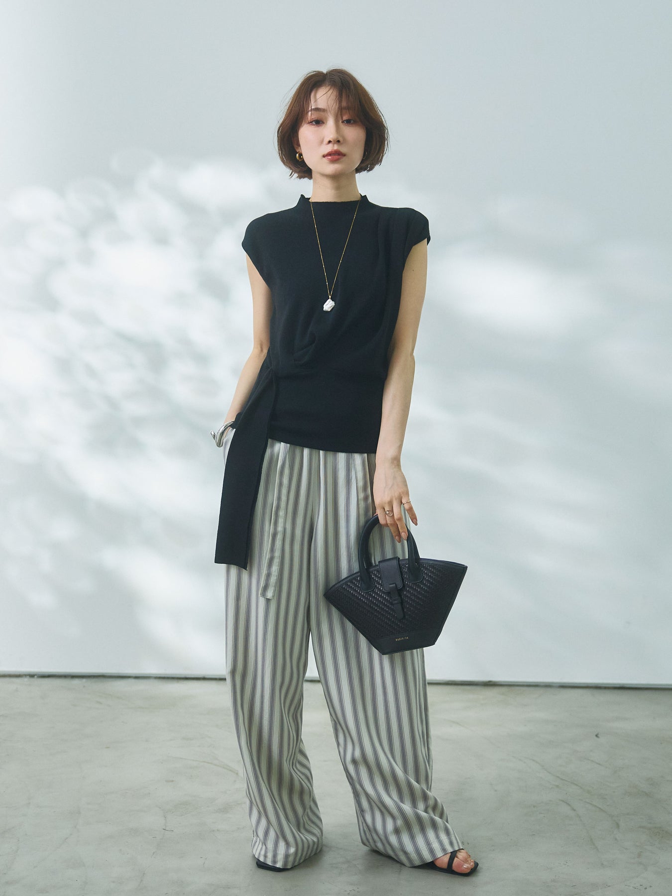 【Allure】[SET]サイドベルトボトルネックノースリーブニットトップス+ストライプイージーパンツ(2set)