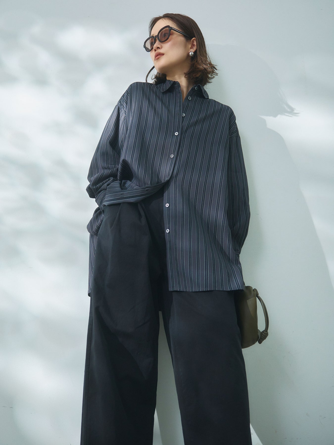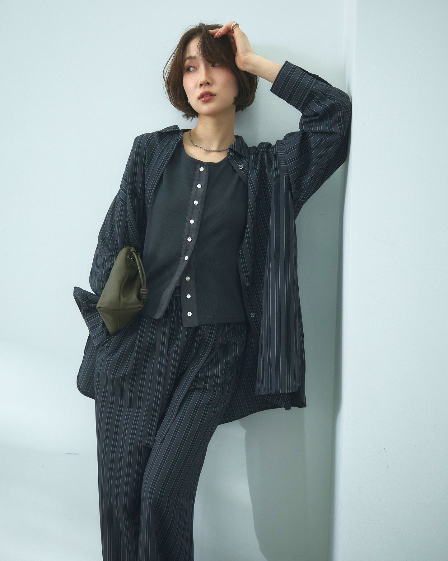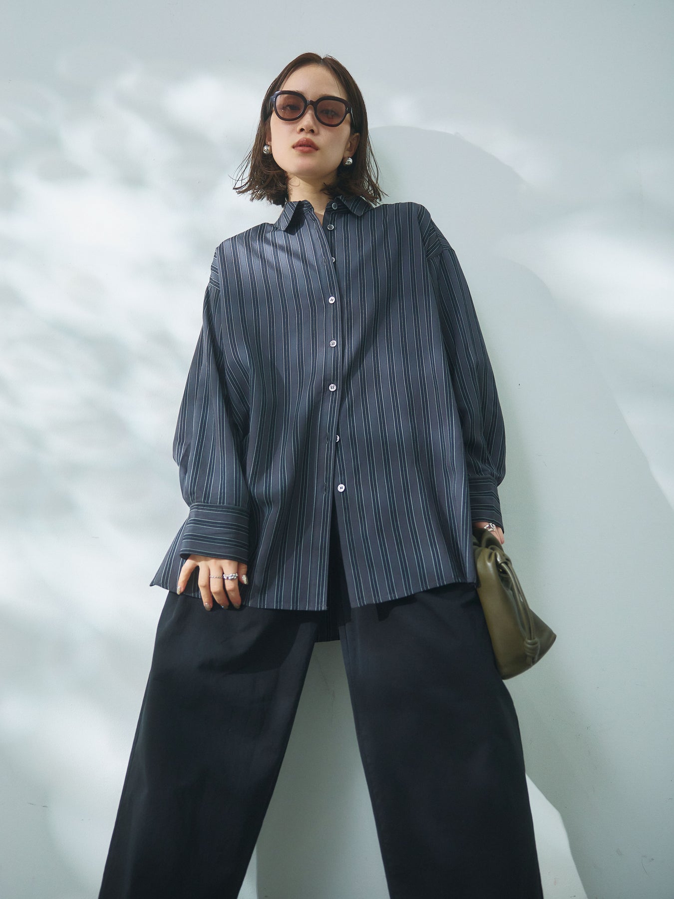 縦ラインを強調するストライプ柄が印象的なオーバーシャツ。程よくゆとりのあるシルエットが抜け感を演出し、さらっと羽織るだけでこなれたスタイリングが完成します。軽やかな素材感で着心地も良く、デイリーに取り入れやすい一着。ヒップにかかる丈感で体のラインを拾いにくく、バランスよく着用できるのも魅力です。前を閉じてトップスとしてはもちろん、羽織りとしても活躍し、同素材のボトムスと合わせたセットアップ風の着こなしもおすすめ。カジュアルからきれいめまで幅広いスタイリングに対応するアイテムです。 ※ボトムス、キャミソール(インナー)以外の商品は一律でインナーは付属していません。
