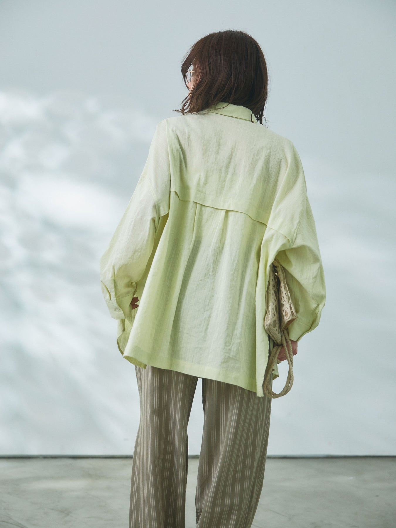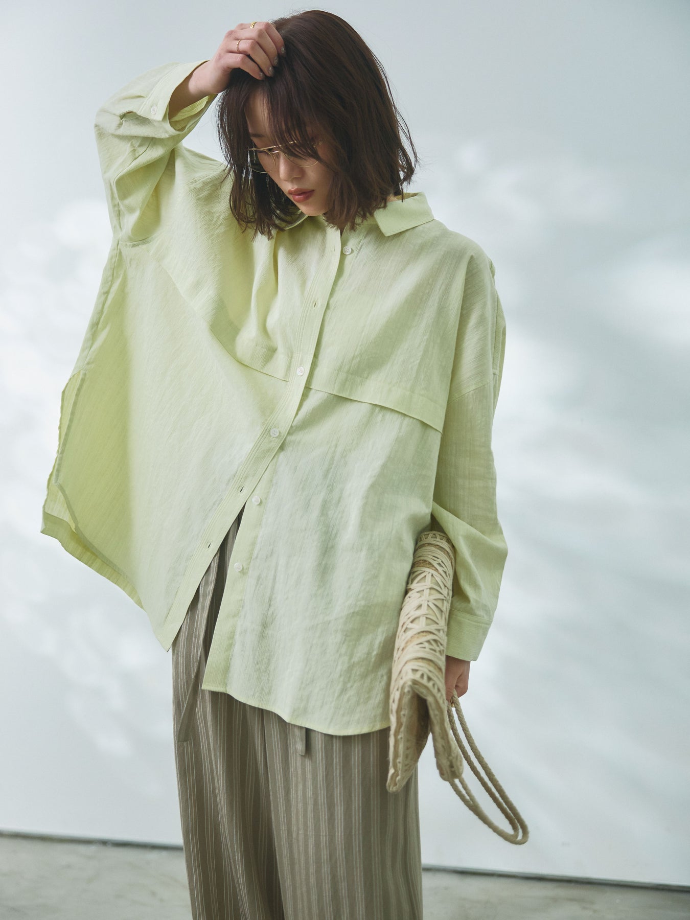 軽やかなスラブ素材が春らしい抜け感を演出するワイドシャツ。ナチュラルな表情のある生地感がスタイリングに柔らかな雰囲気をプラスし、さらっと羽織るだけでこなれた印象に仕上がります。ゆとりのあるワイドシルエットでリラックスして着用でき、体のラインを拾いにくいのも魅力。程よい透け感が軽やかさを引き立て、インナーとのレイヤードも楽しめる一着です。ボタンを閉じてトップスとしてはもちろん、羽織りとしても活躍し、デイリーからお出かけまで幅広いシーンに対応するアイテムです。 ※ボトムス、キャミソール(インナー)以外の商品は一律でインナーは付属していません。