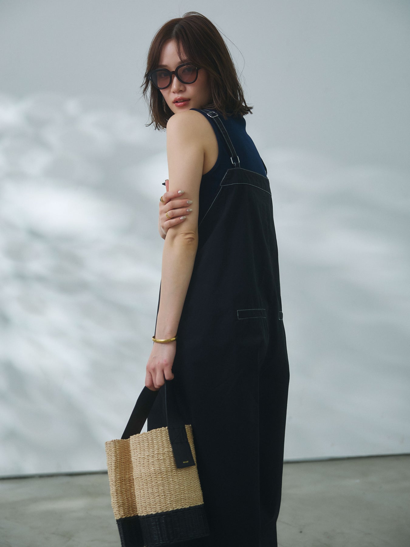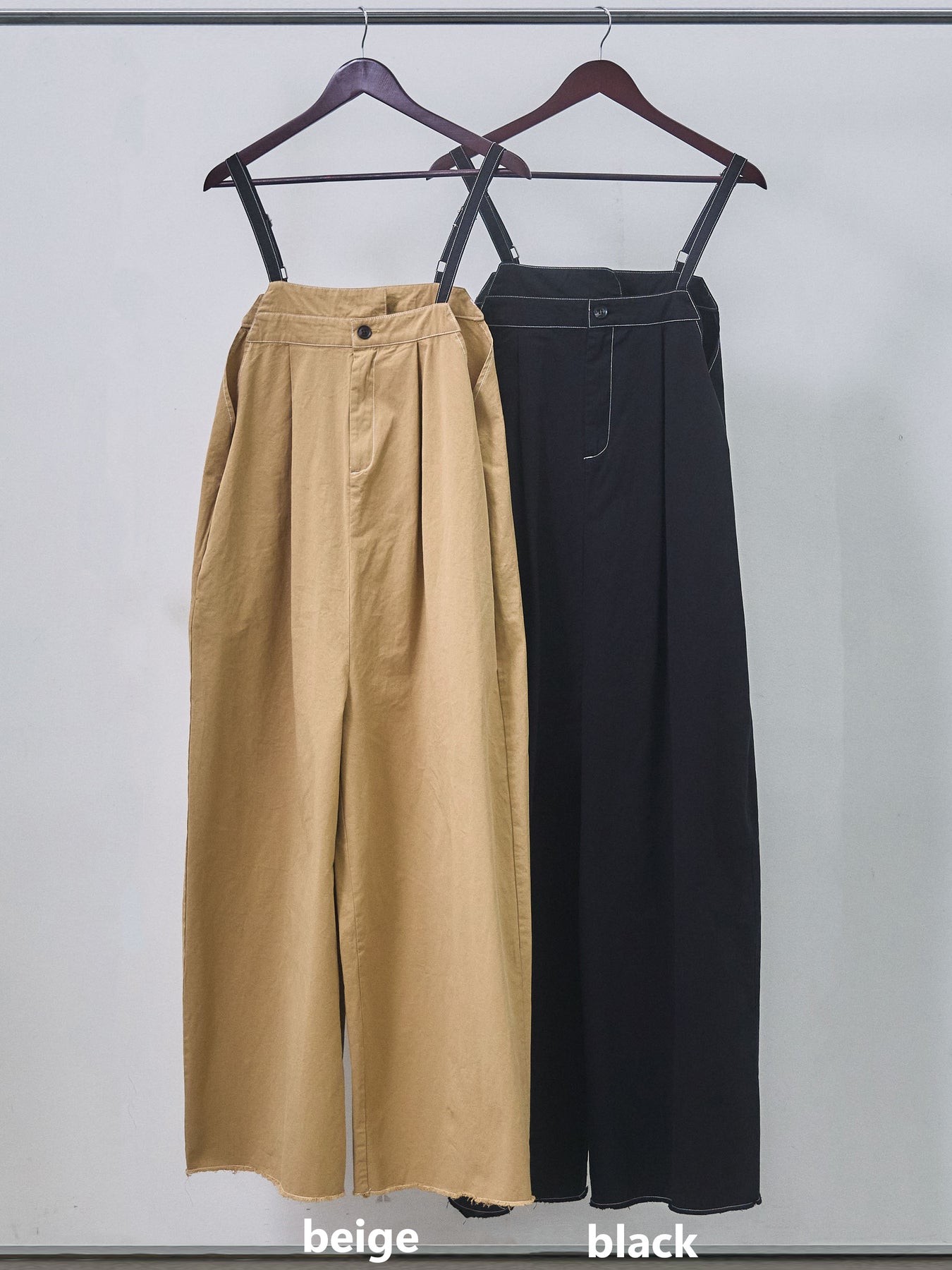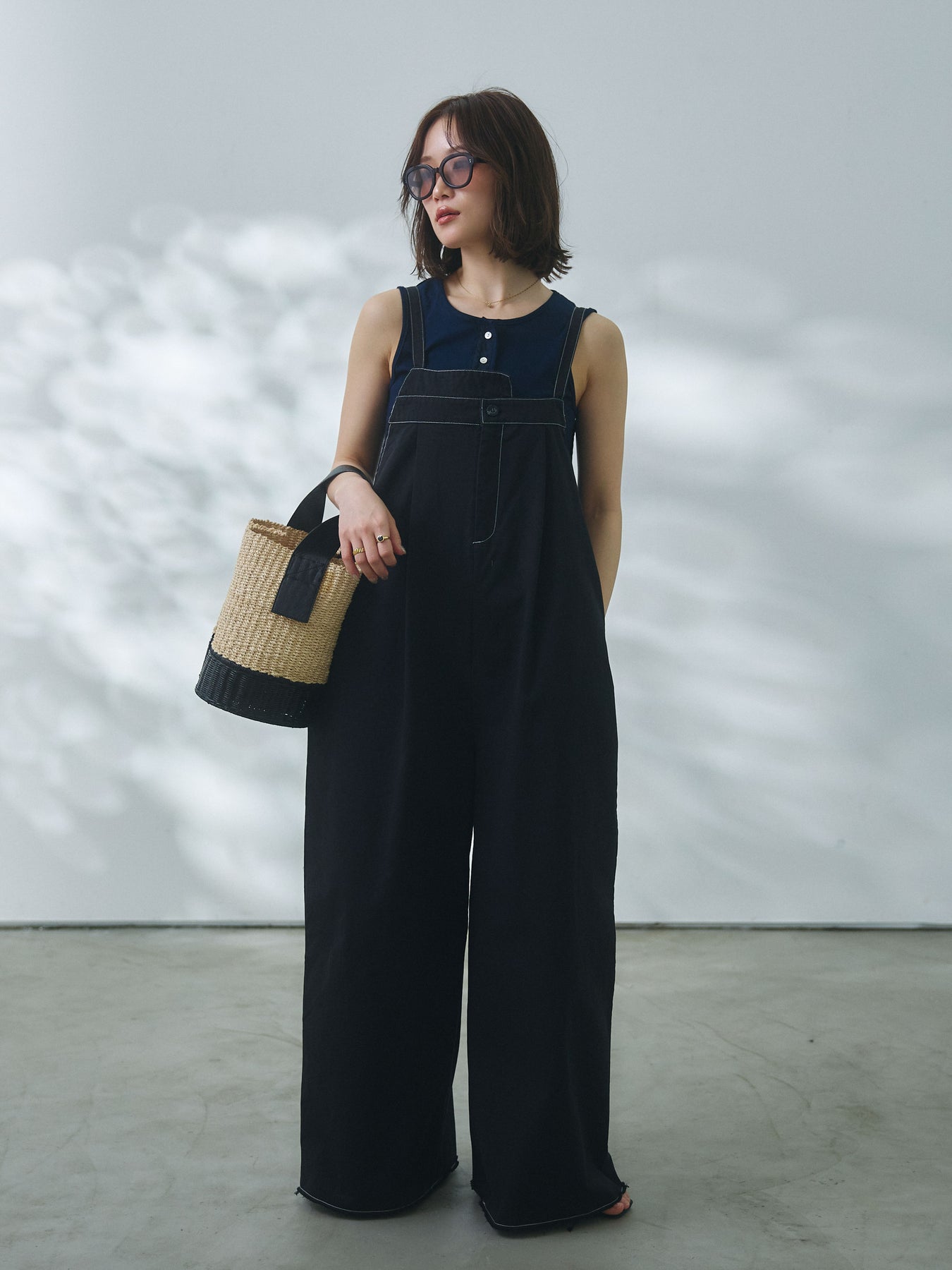 【Allure】[SET]カットオフコットンツイル配色ステッチサロペット+フロントボタンテレコリブタンクトップ(2set)