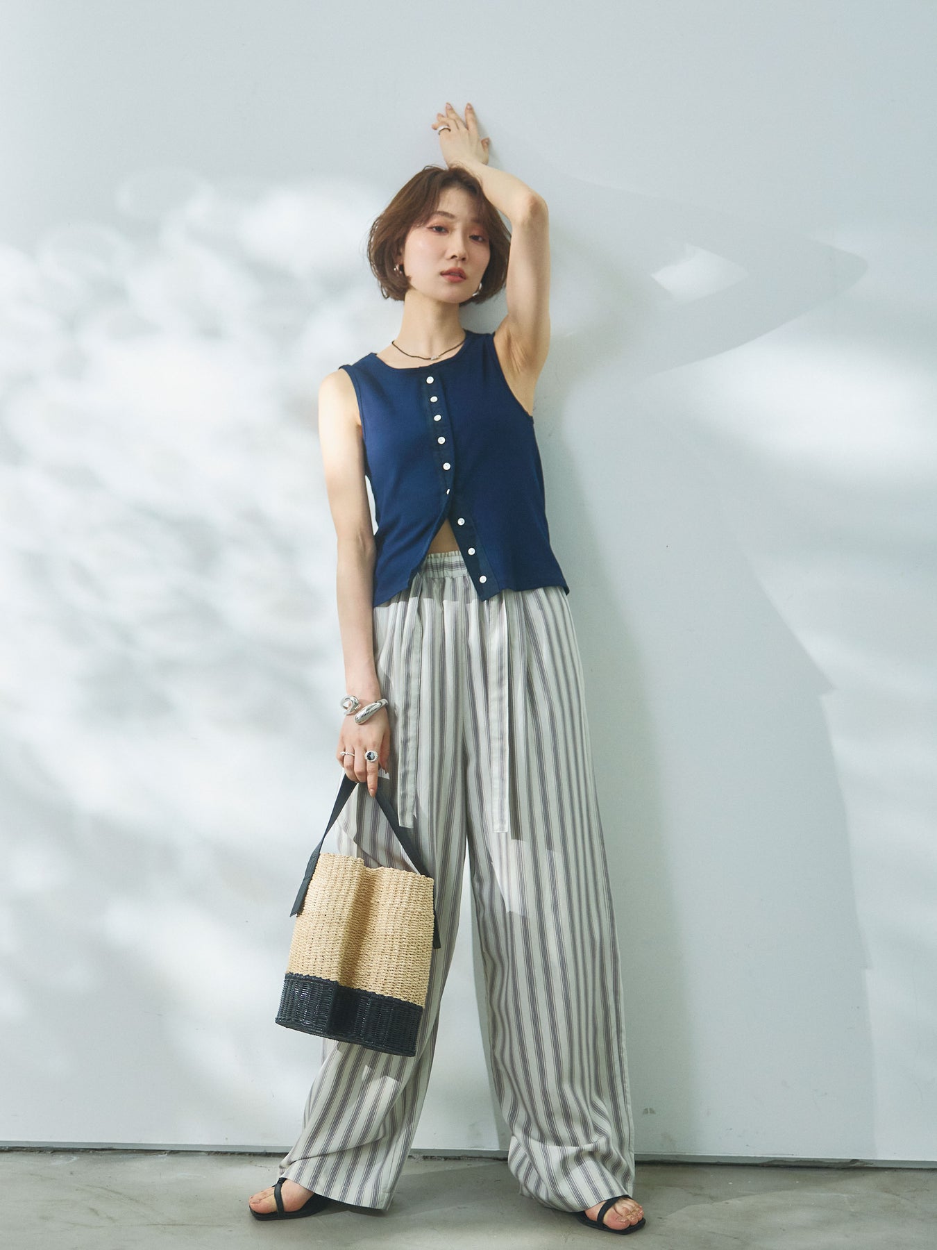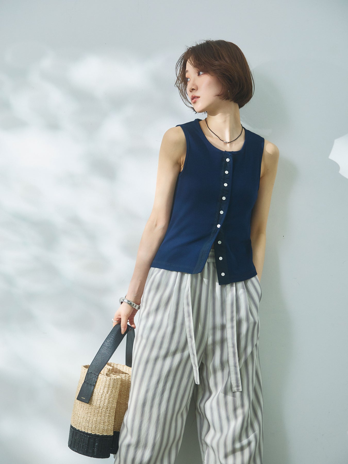 フロントボタンデザインがアクセントになったテレコリブタンクトップ。縦ラインを強調するリブ編みがすっきりとしたシルエットを演出し、ボディに程よくフィットしながら女性らしいラインを引き立てます。フロントのボタンディテールがシンプルな中に表情をプラスし、1枚でも着映えするデザインに。コンパクトな丈感でバランスが取りやすく、ハイウエストのボトムスとも相性良く着用いただけます。柔らかな素材で着心地も良く、デイリーからレイヤードスタイルまで幅広く活躍する一着です。 ※ボトムス、キャミソール(インナー)以外の商品は一律でインナーは付属していません。