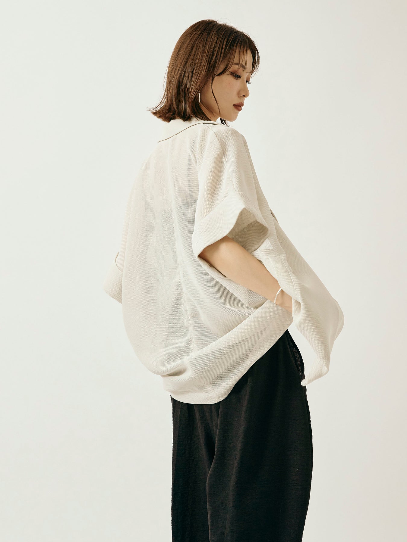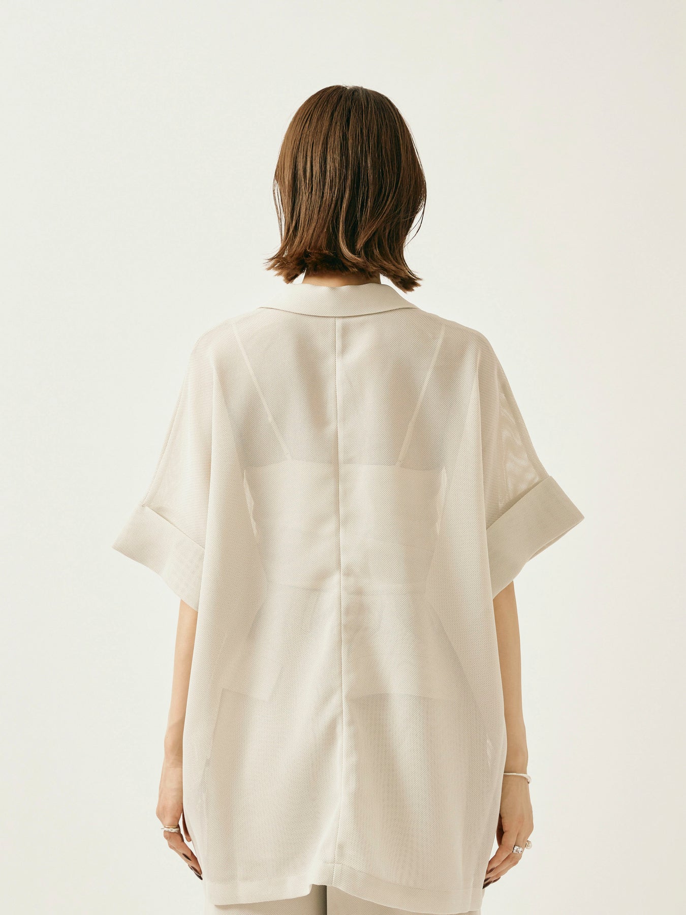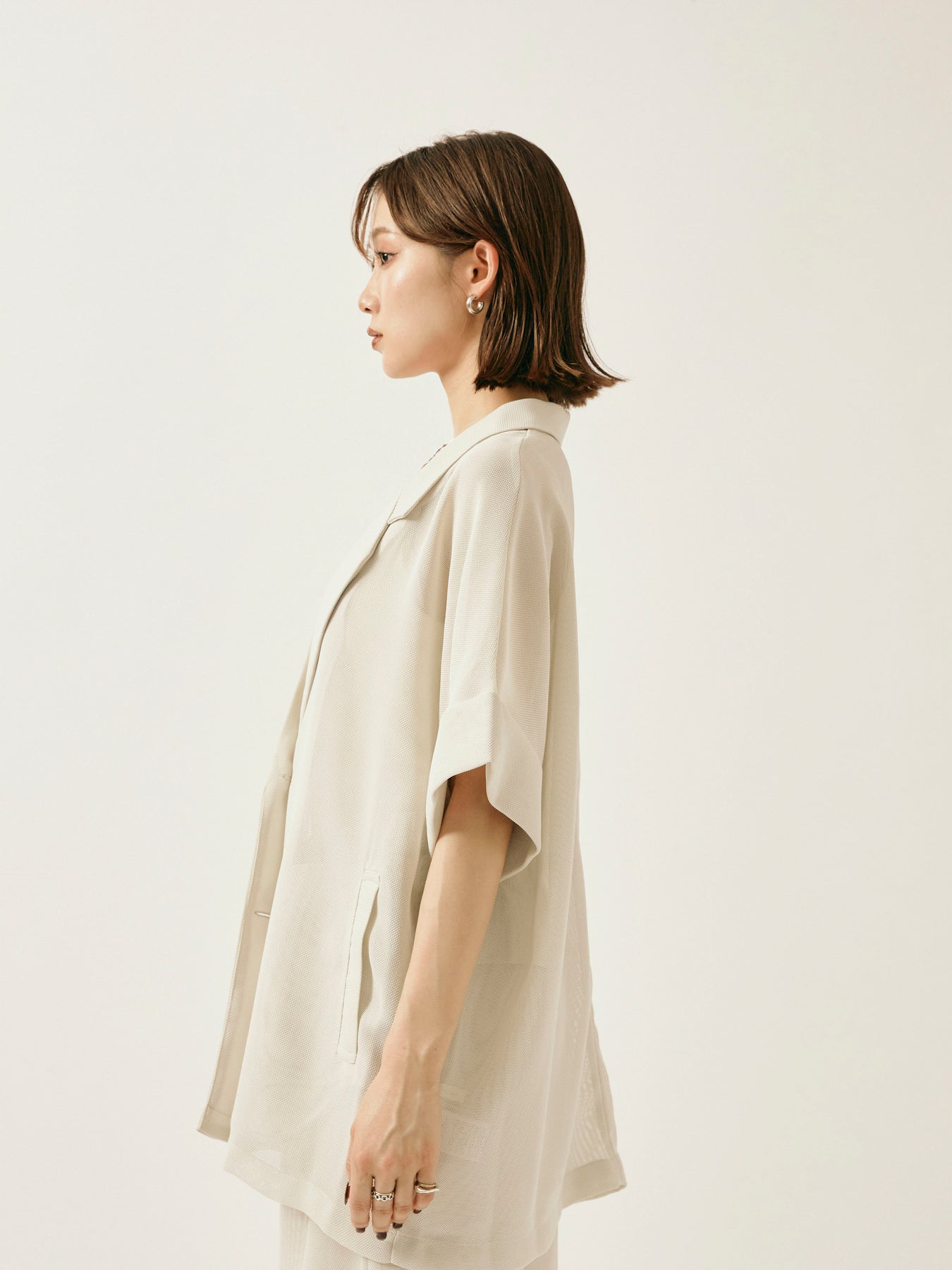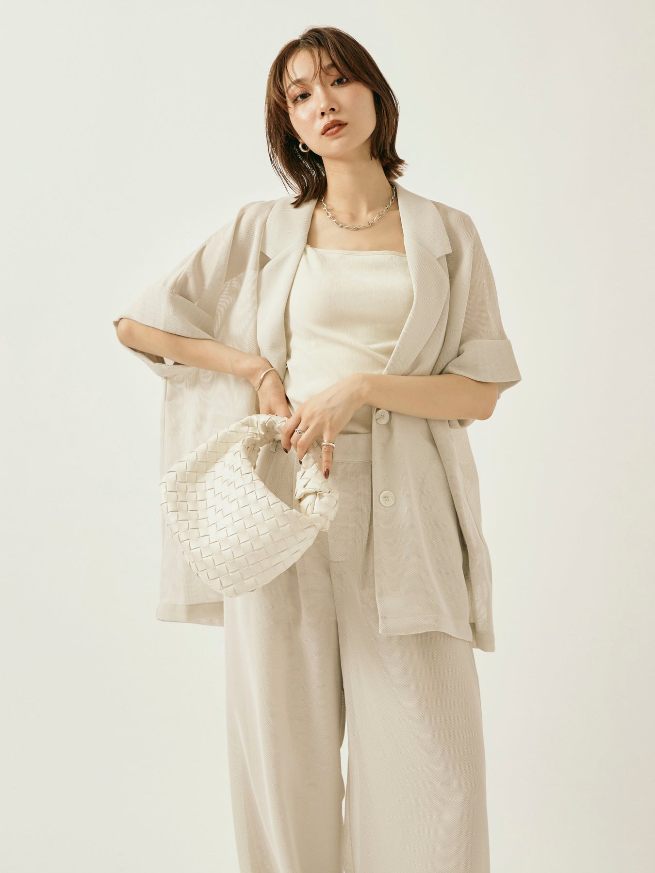 抜け感とクールさを兼ね備えた、メッシュ素材のテーラードジャケット。 ハーフスリーブ&シアーな透け感が、軽やかで夏らしい印象に仕上げてくれます。 テーラードのきちんと感がありながらも、リラクシーなシルエットでこなれ感を演出。 Tシャツやキャミソールとのレイヤードはもちろん、ワンピースの羽織としてもおすすめ。 さらっと羽織るだけで、旬のスタイリングが完成するアイテムです。 ※ボトムス、キャミソール(インナー)以外の商品は一律でインナーは付属していません。