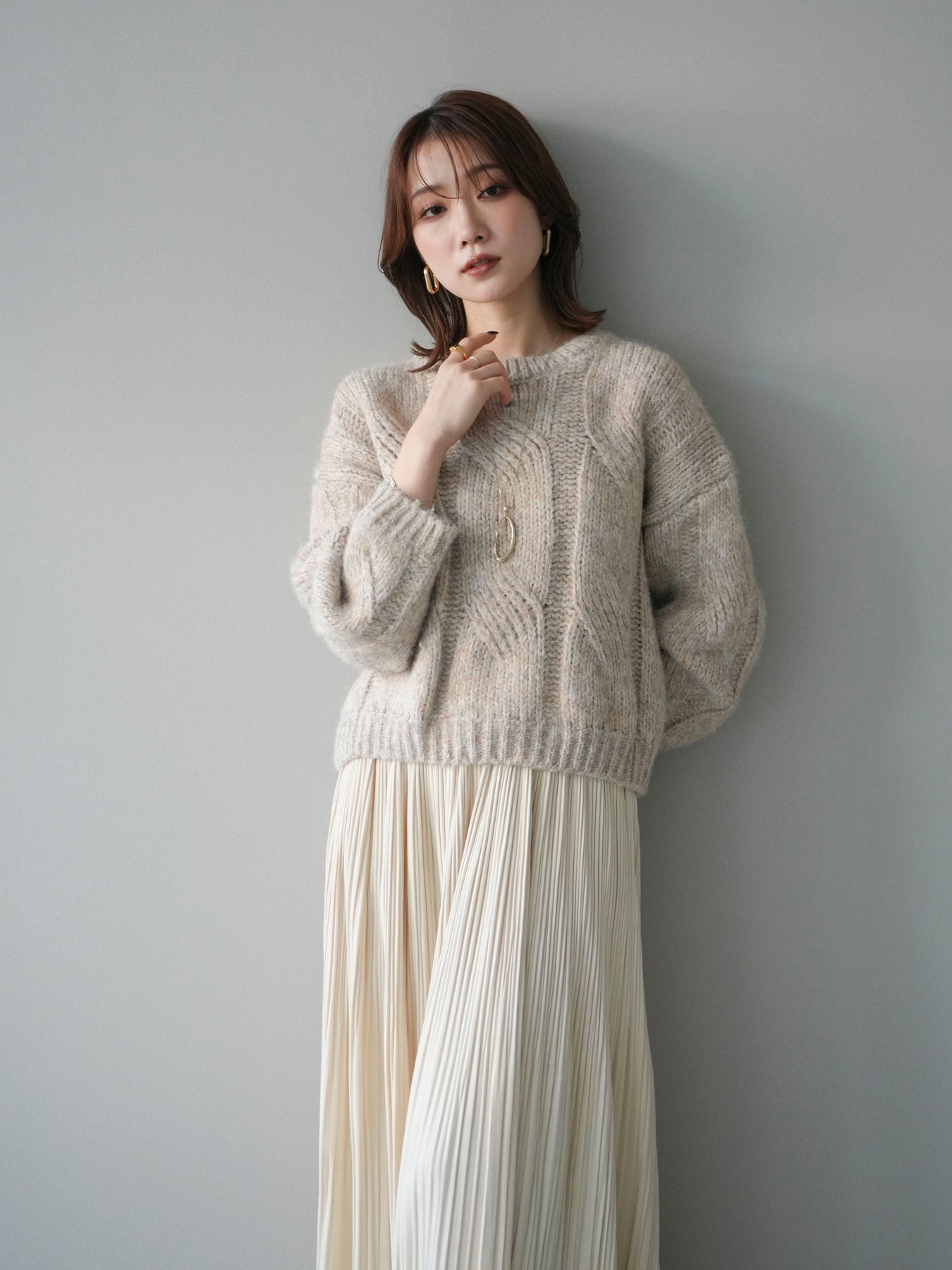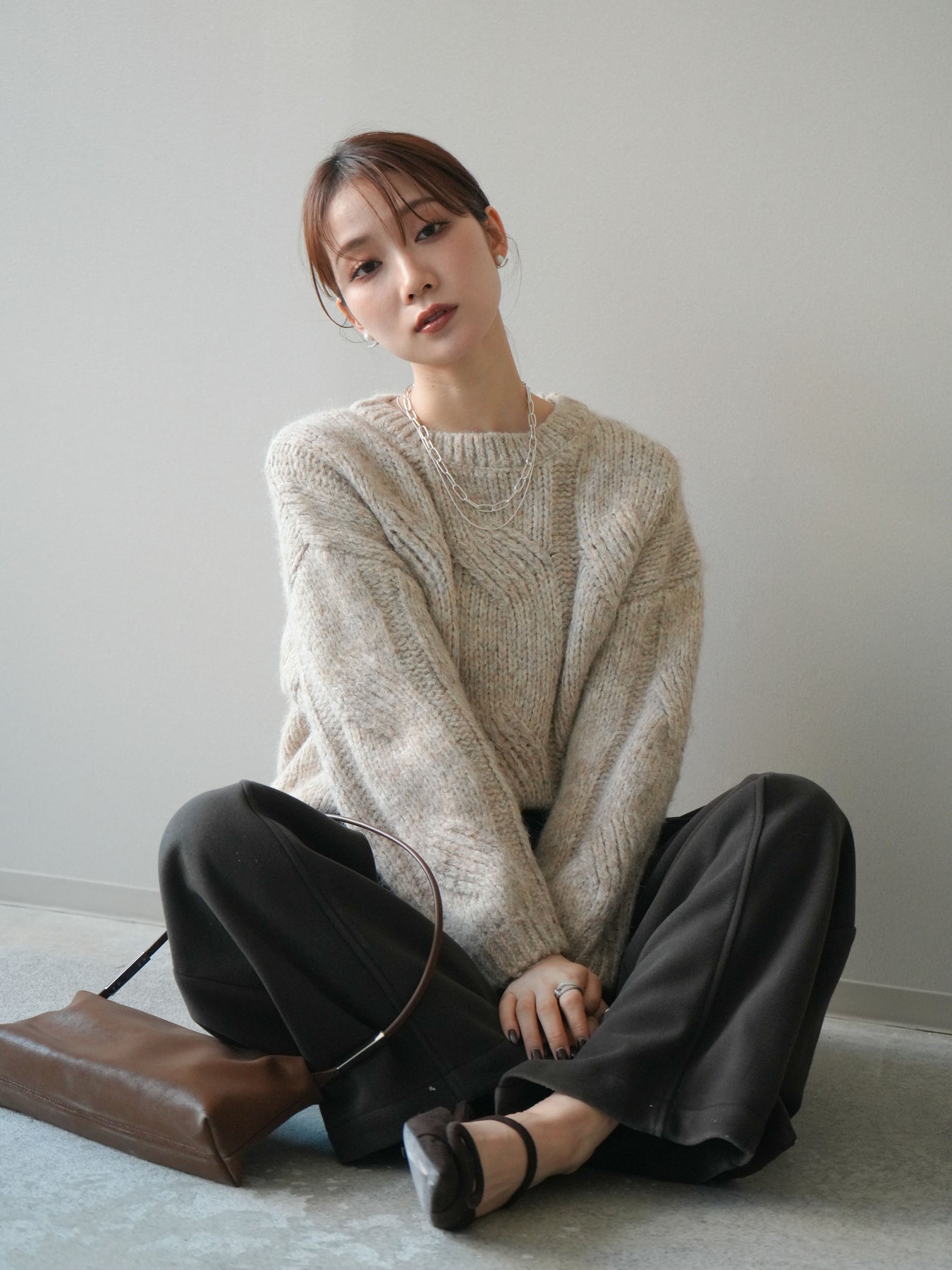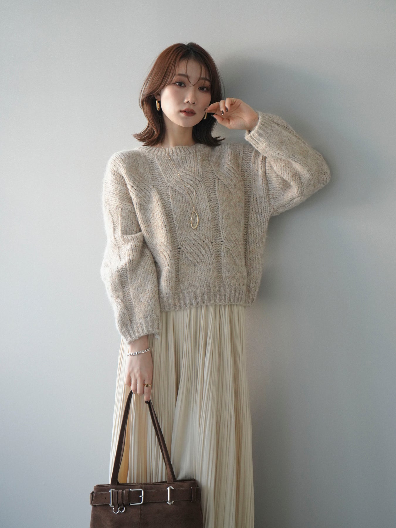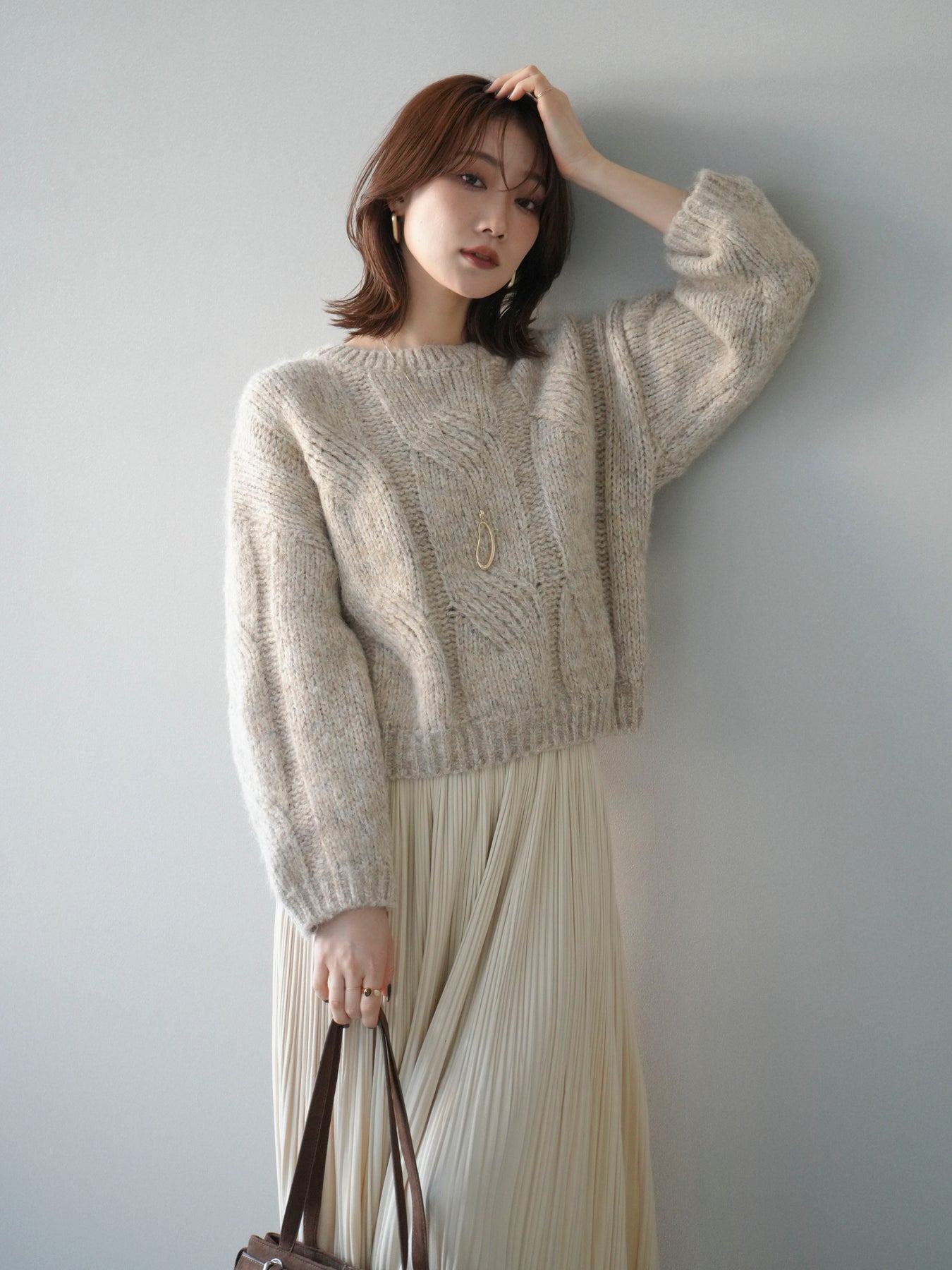 太めのケーブル編みとミックスヤーンが織りなす立体感が魅力のニットプルオーバー。ざっくりとした編地ながら重たく見えず、柔らかな風合いが季節らしい温もりを感じさせます。ワイドシルエットでゆったりと着られ、抜け感がありながらもルーズすぎない絶妙なバランスに。デニムやスカートなど幅広いボトムスと合わせやすく、1枚で主役になる存在感のあるアイテムです。 ※ボトムス、キャミソール(インナー)以外の商品は一律でインナーは付属していません。