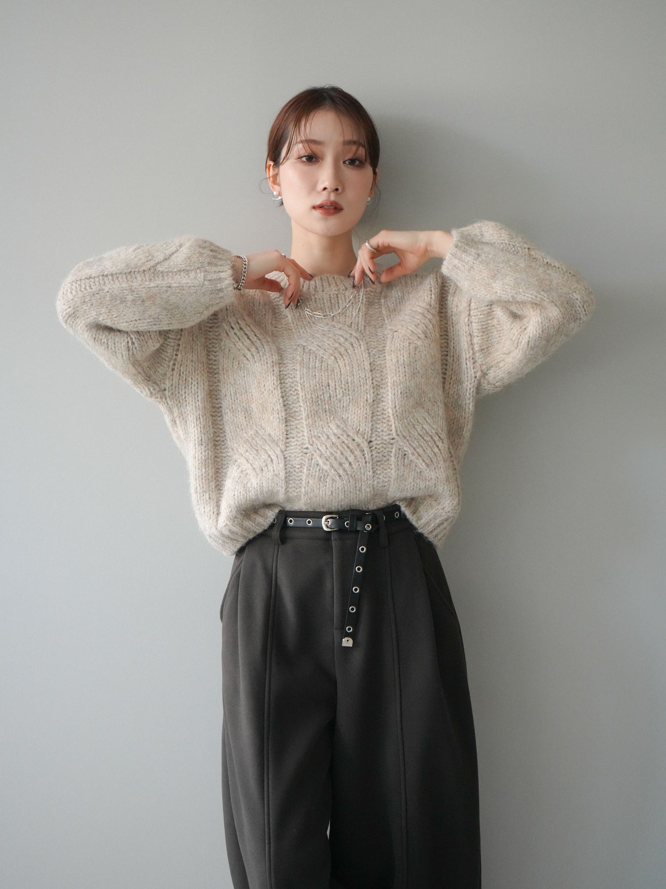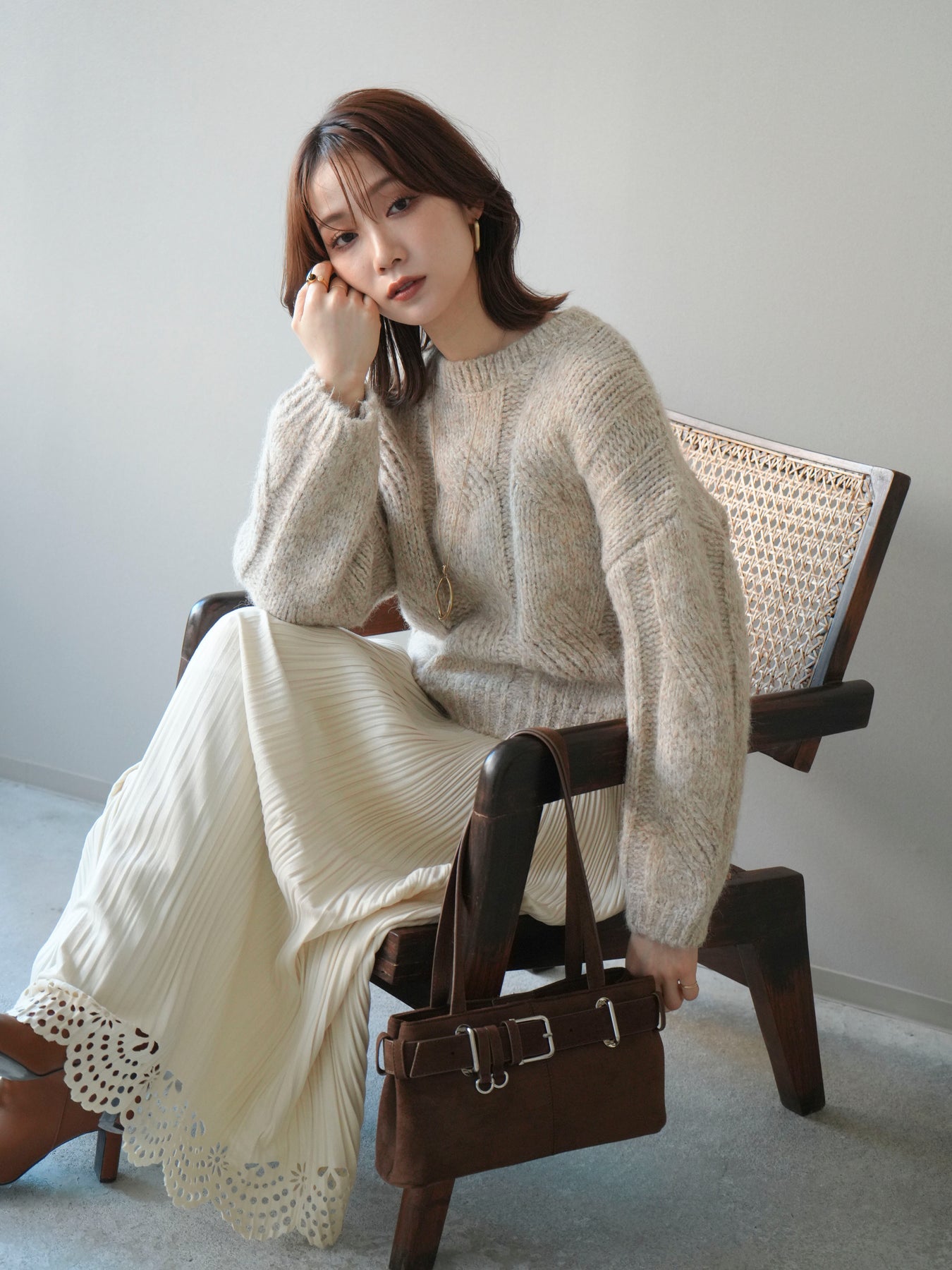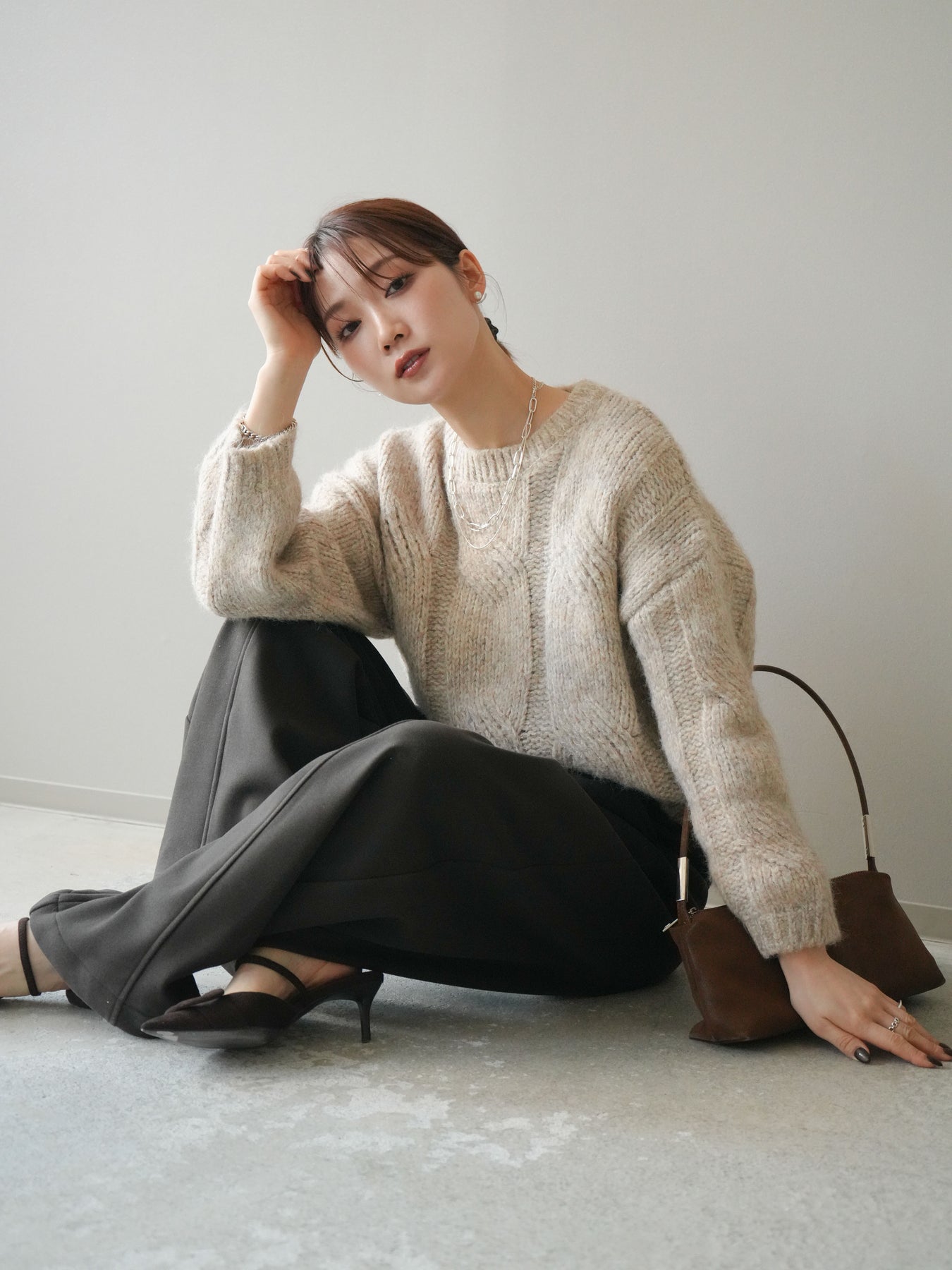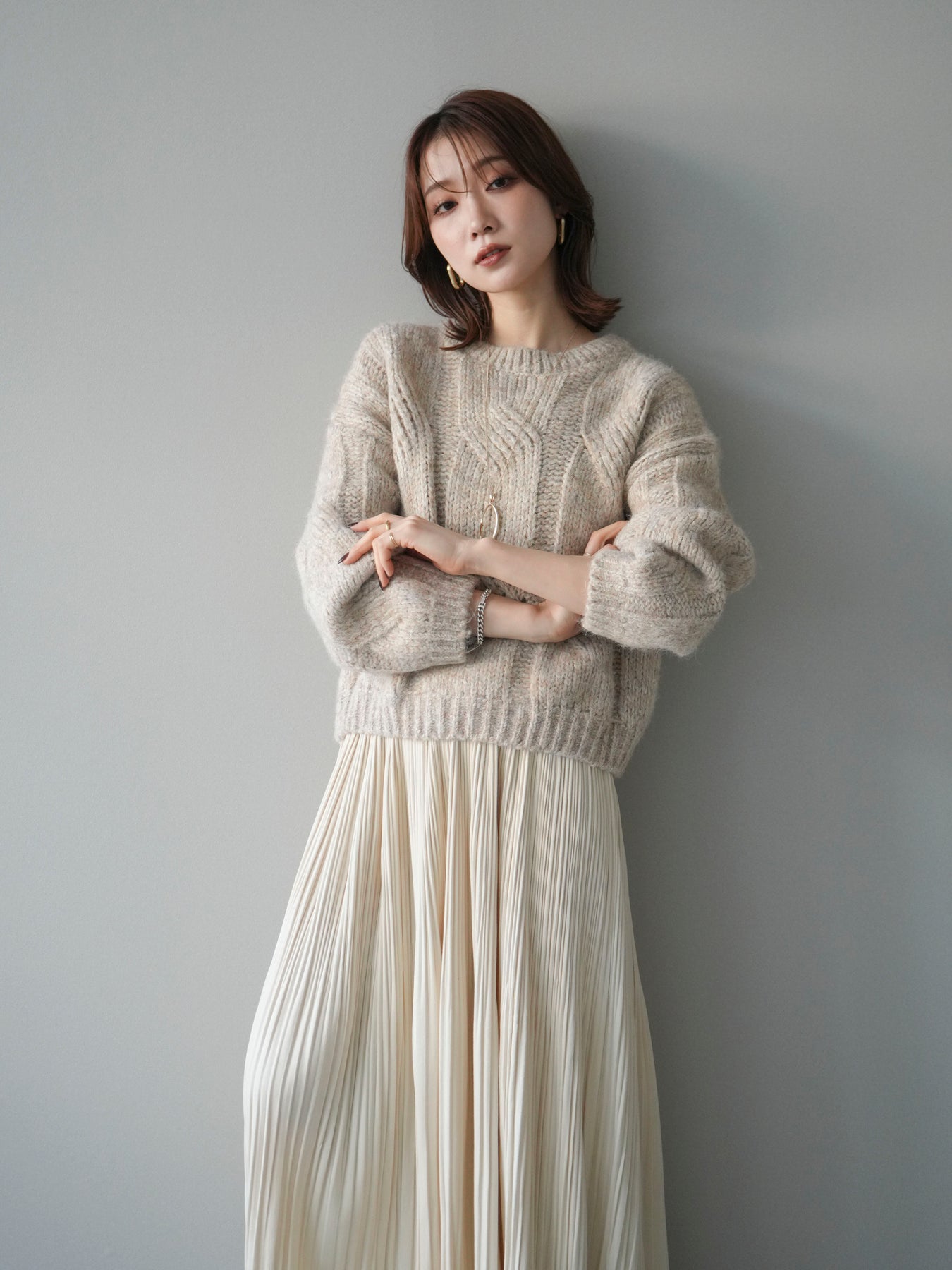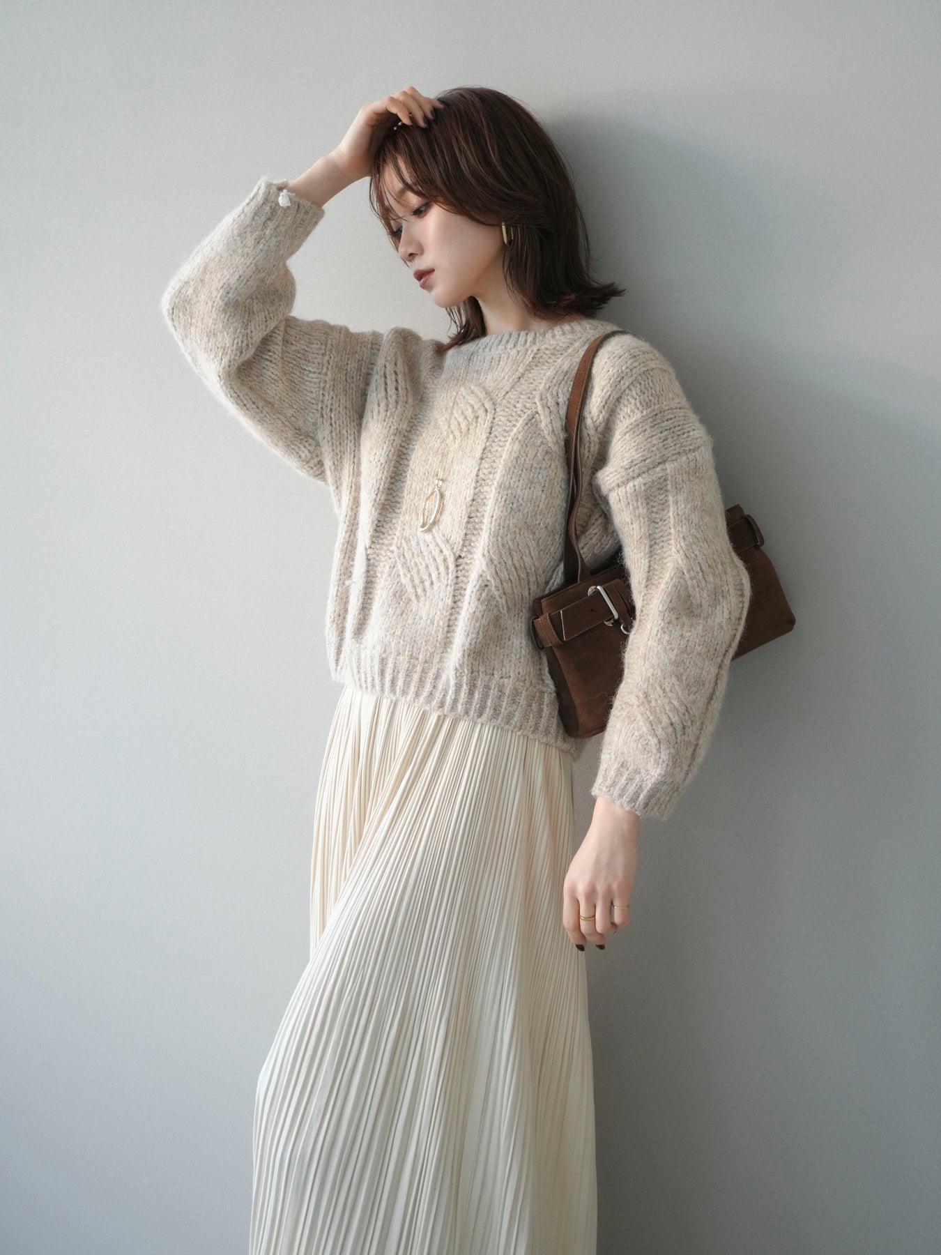 太めのケーブル編みとミックスヤーンが織りなす立体感が魅力のニットプルオーバー。ざっくりとした編地ながら重たく見えず、柔らかな風合いが季節らしい温もりを感じさせます。ワイドシルエットでゆったりと着られ、抜け感がありながらもルーズすぎない絶妙なバランスに。デニムやスカートなど幅広いボトムスと合わせやすく、1枚で主役になる存在感のあるアイテムです。 ※ボトムス、キャミソール(インナー)以外の商品は一律でインナーは付属していません。
