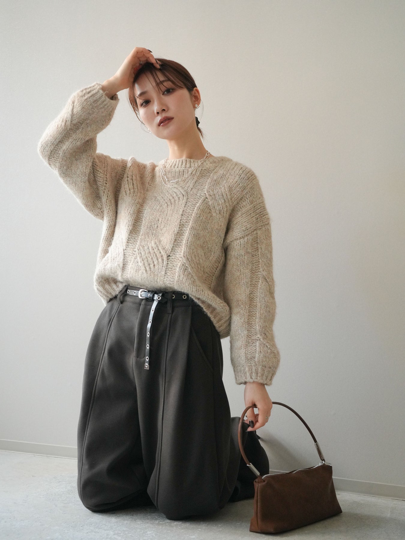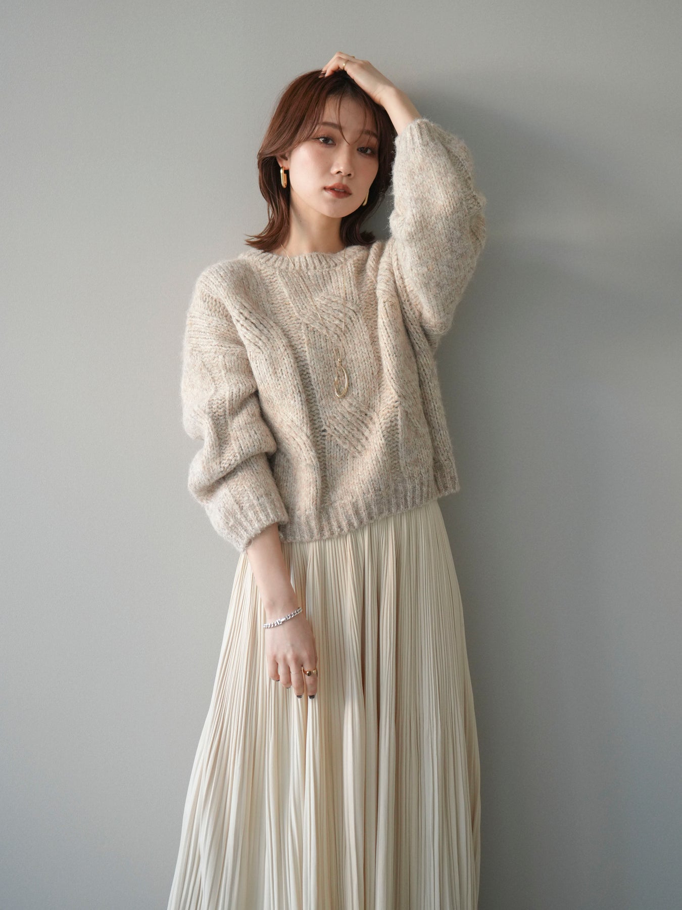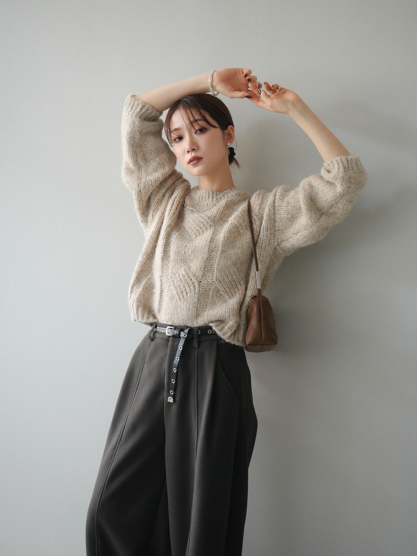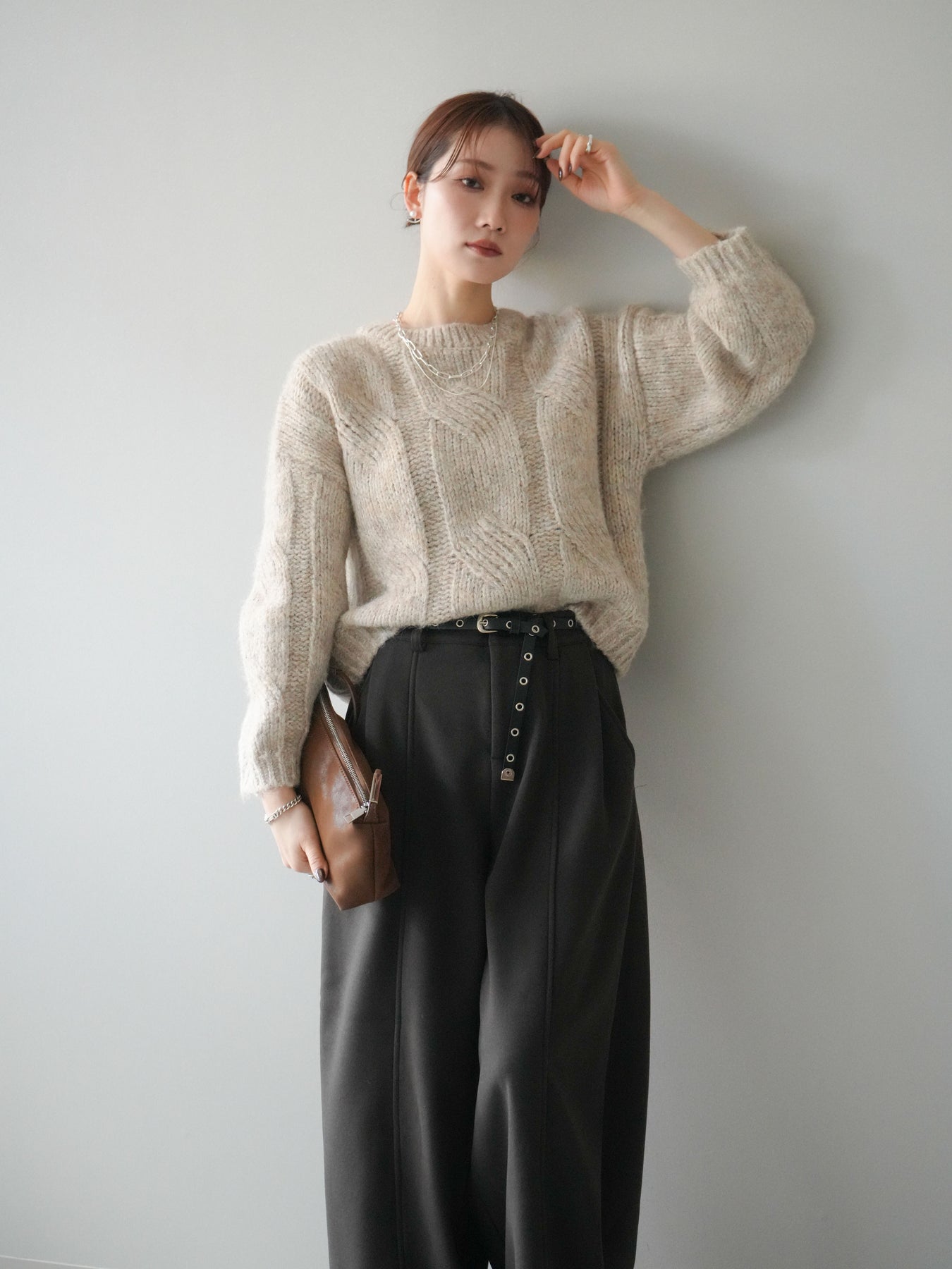 太めのケーブル編みとミックスヤーンが織りなす立体感が魅力のニットプルオーバー。ざっくりとした編地ながら重たく見えず、柔らかな風合いが季節らしい温もりを感じさせます。ワイドシルエットでゆったりと着られ、抜け感がありながらもルーズすぎない絶妙なバランスに。デニムやスカートなど幅広いボトムスと合わせやすく、1枚で主役になる存在感のあるアイテムです。 ※ボトムス、キャミソール(インナー)以外の商品は一律でインナーは付属していません。
