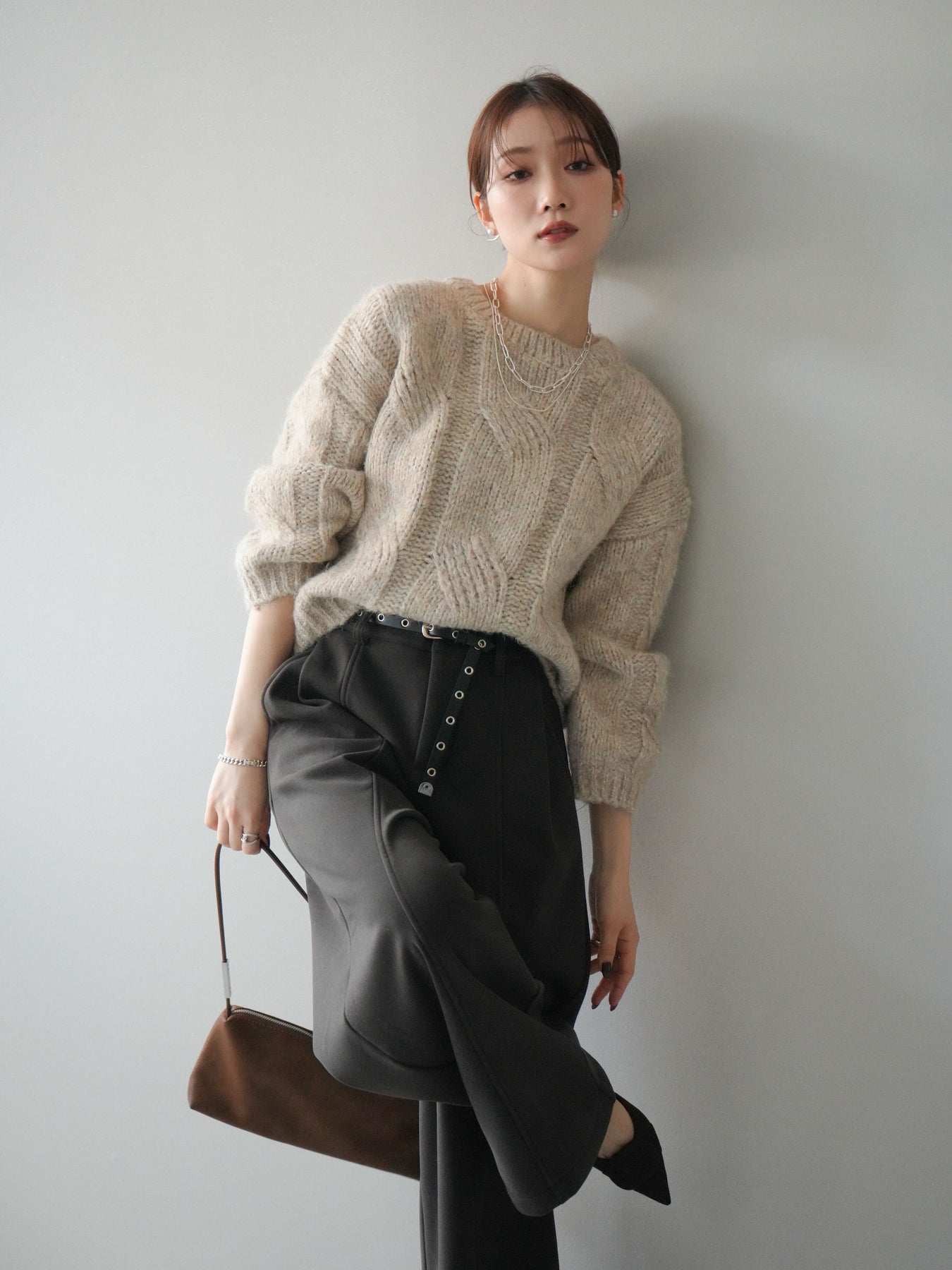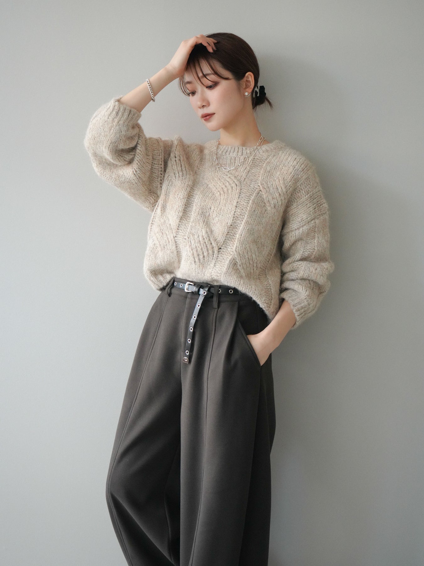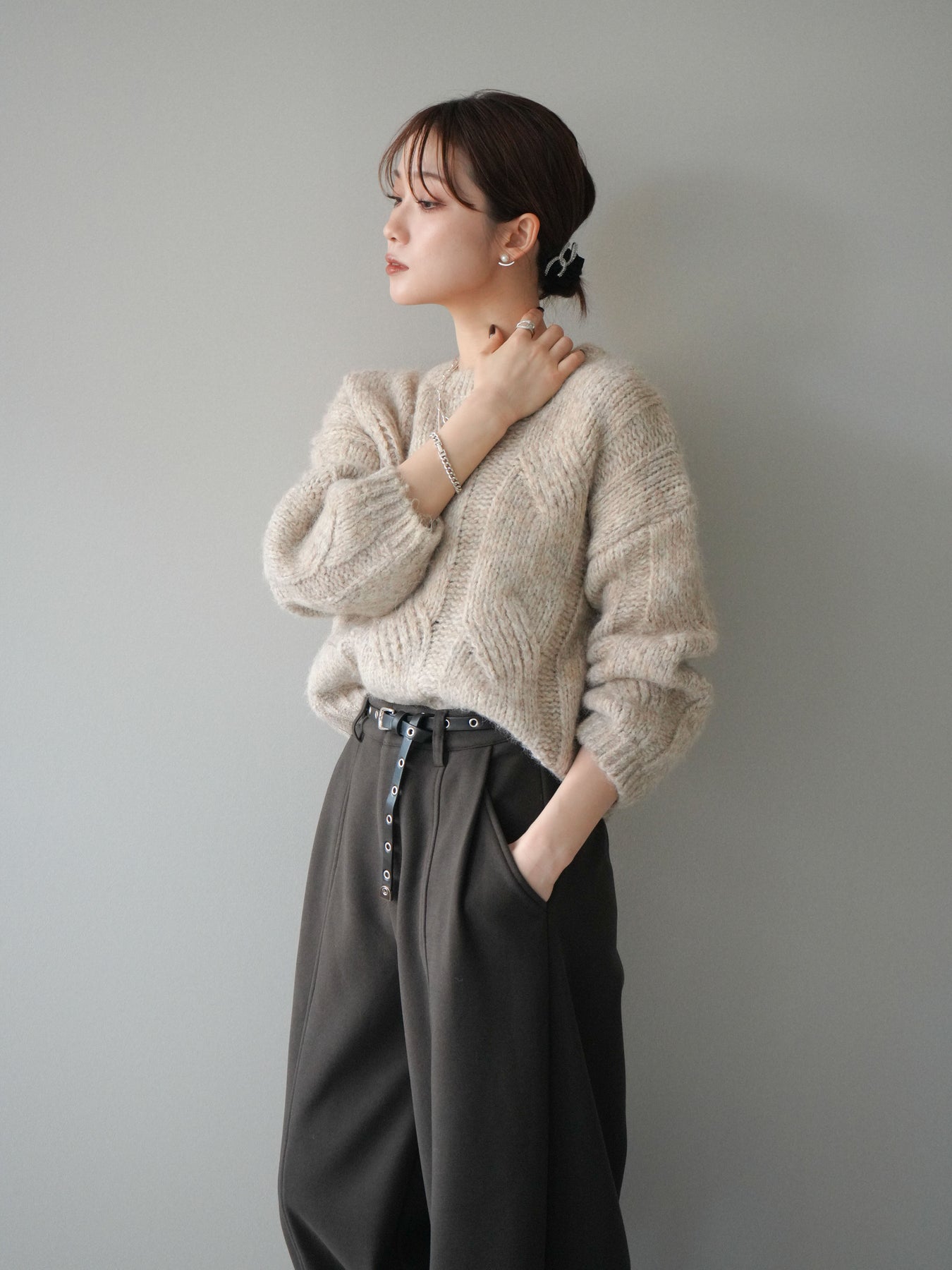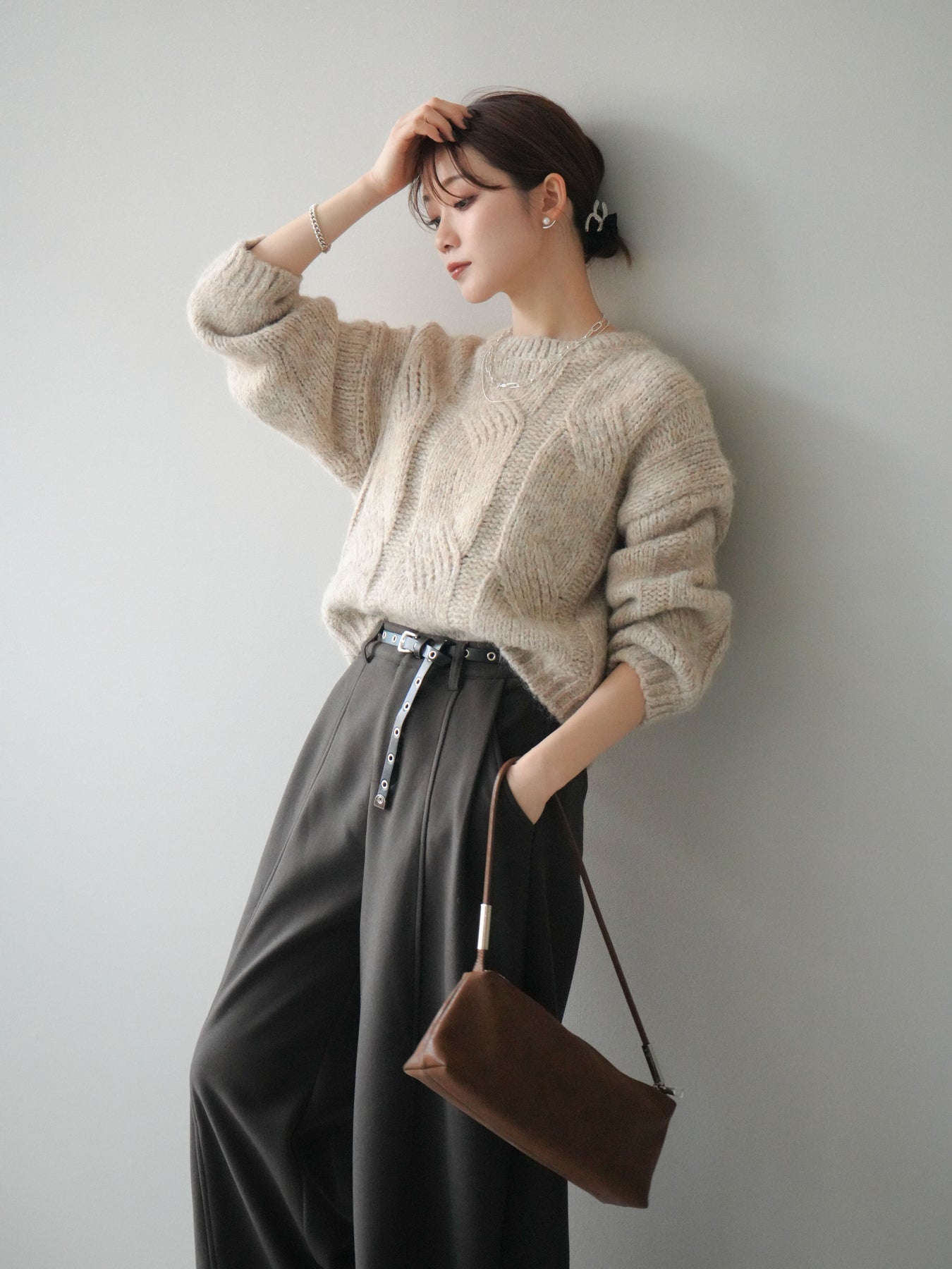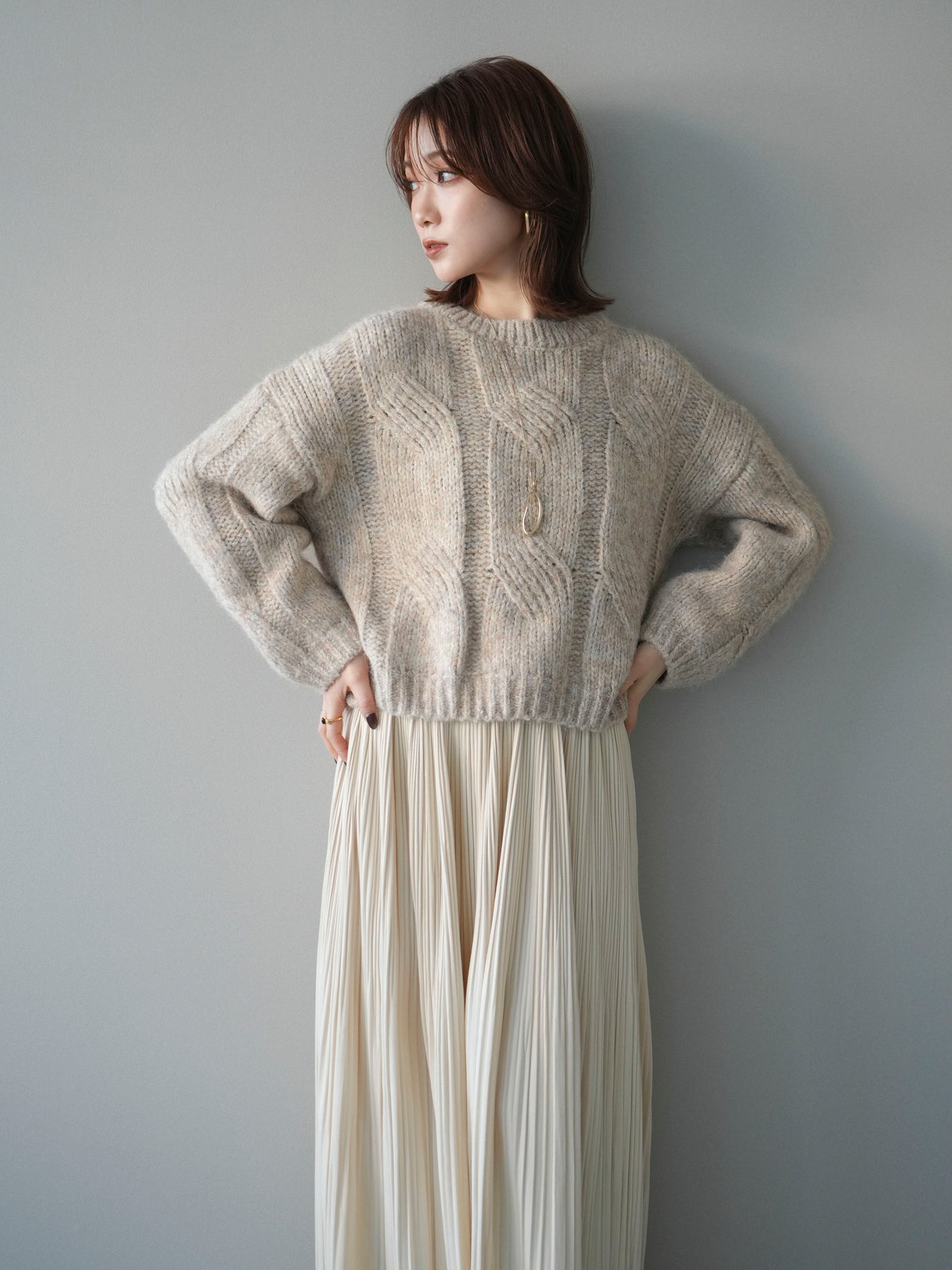 太めのケーブル編みとミックスヤーンが織りなす立体感が魅力のニットプルオーバー。ざっくりとした編地ながら重たく見えず、柔らかな風合いが季節らしい温もりを感じさせます。ワイドシルエットでゆったりと着られ、抜け感がありながらもルーズすぎない絶妙なバランスに。デニムやスカートなど幅広いボトムスと合わせやすく、1枚で主役になる存在感のあるアイテムです。 ※ボトムス、キャミソール(インナー)以外の商品は一律でインナーは付属していません。