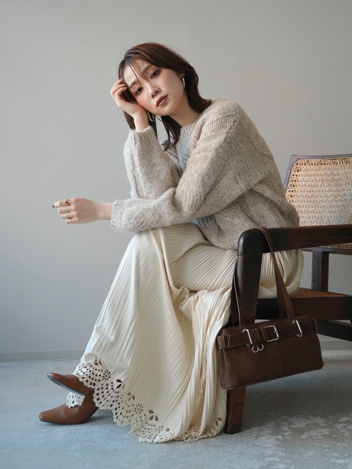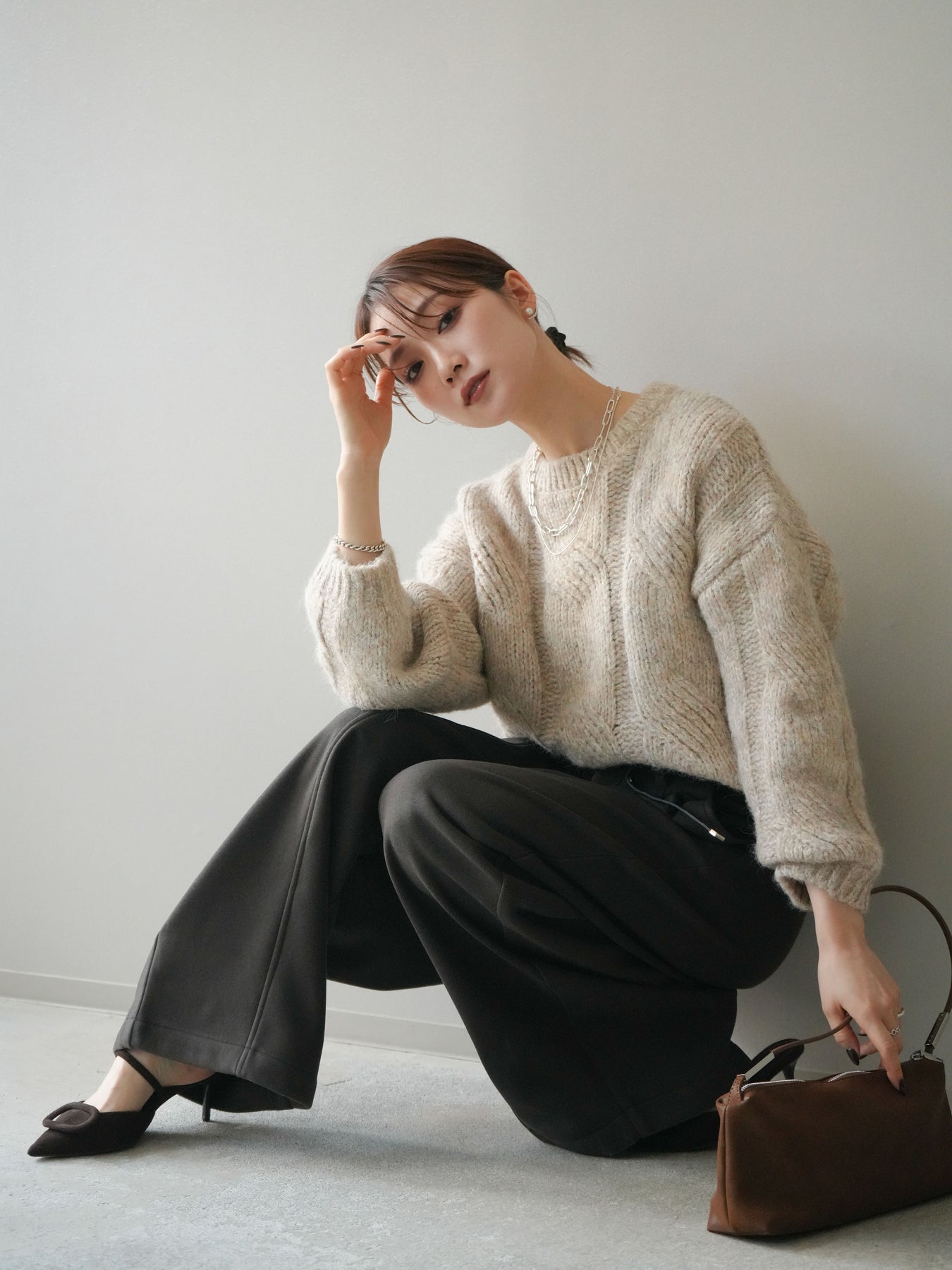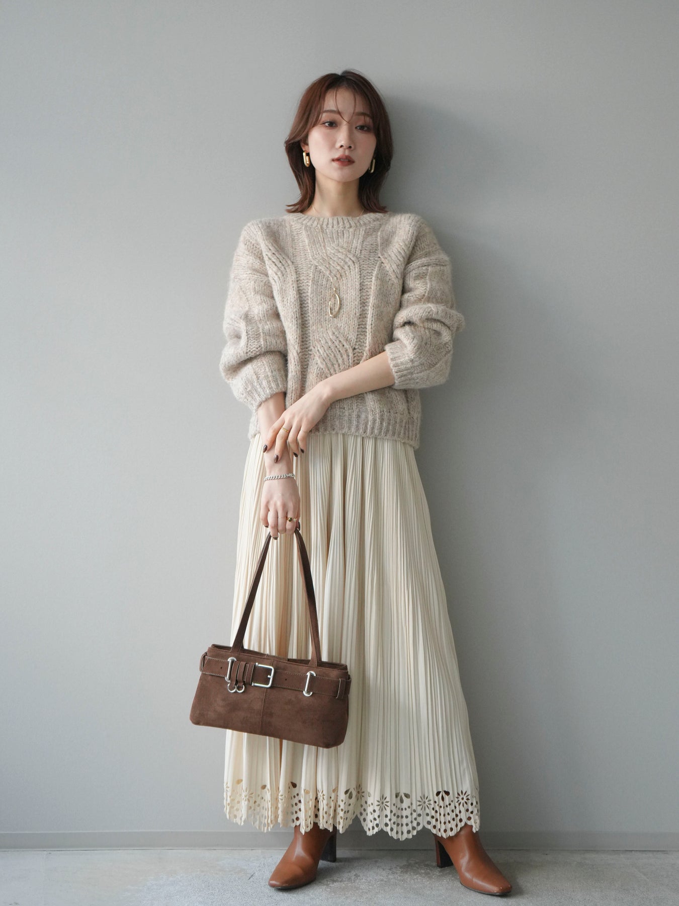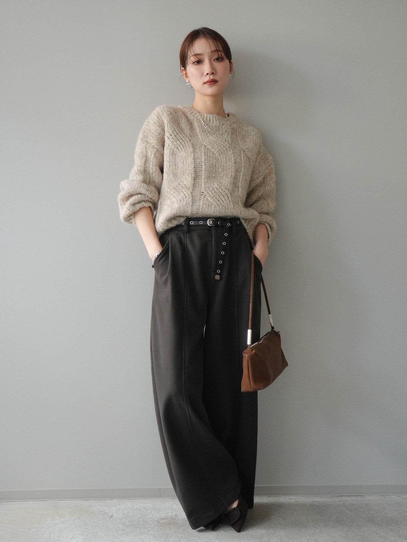 太めのケーブル編みとミックスヤーンが織りなす立体感が魅力のニットプルオーバー。ざっくりとした編地ながら重たく見えず、柔らかな風合いが季節らしい温もりを感じさせます。ワイドシルエットでゆったりと着られ、抜け感がありながらもルーズすぎない絶妙なバランスに。デニムやスカートなど幅広いボトムスと合わせやすく、1枚で主役になる存在感のあるアイテムです。 ※ボトムス、キャミソール(インナー)以外の商品は一律でインナーは付属していません。