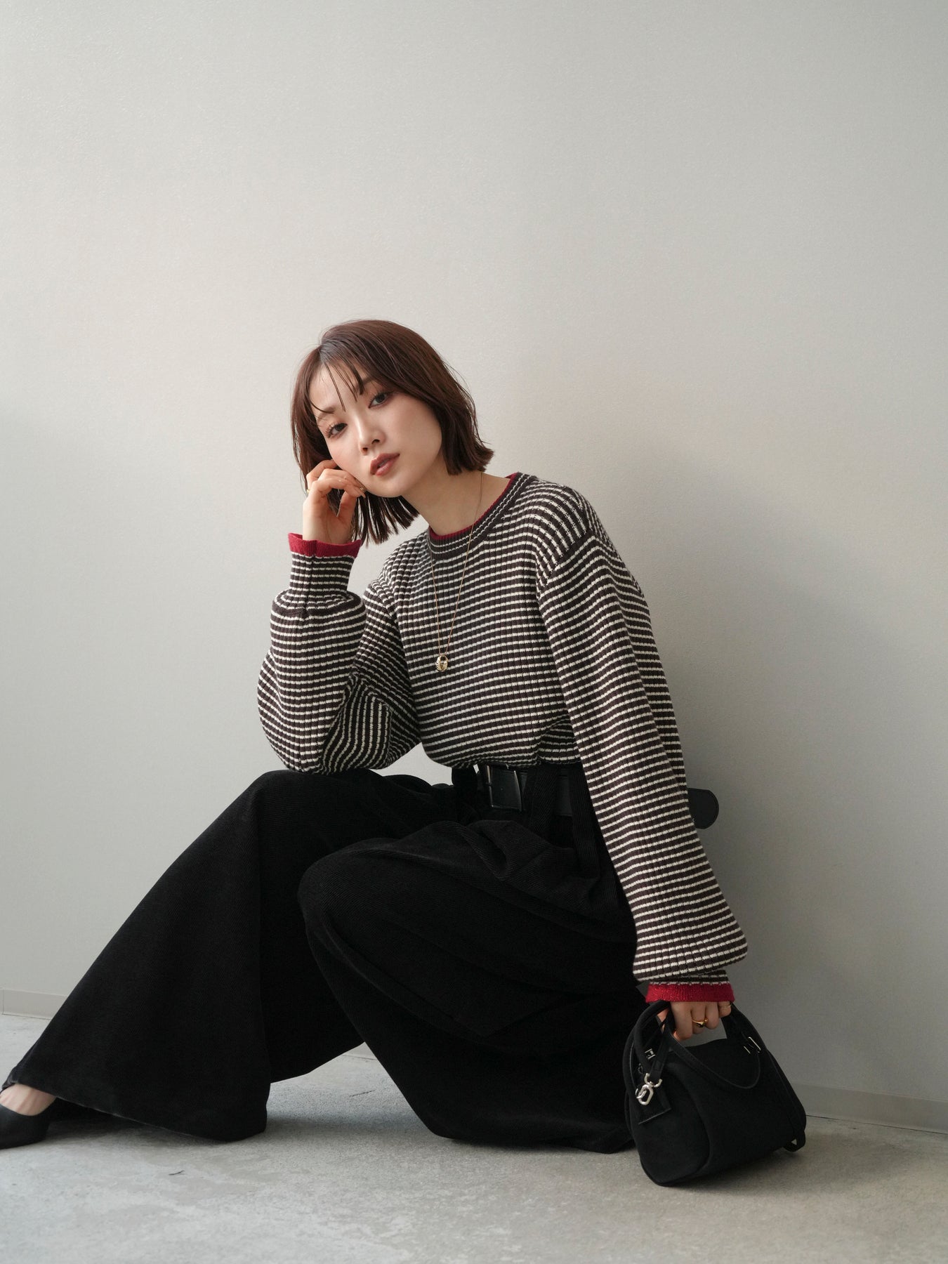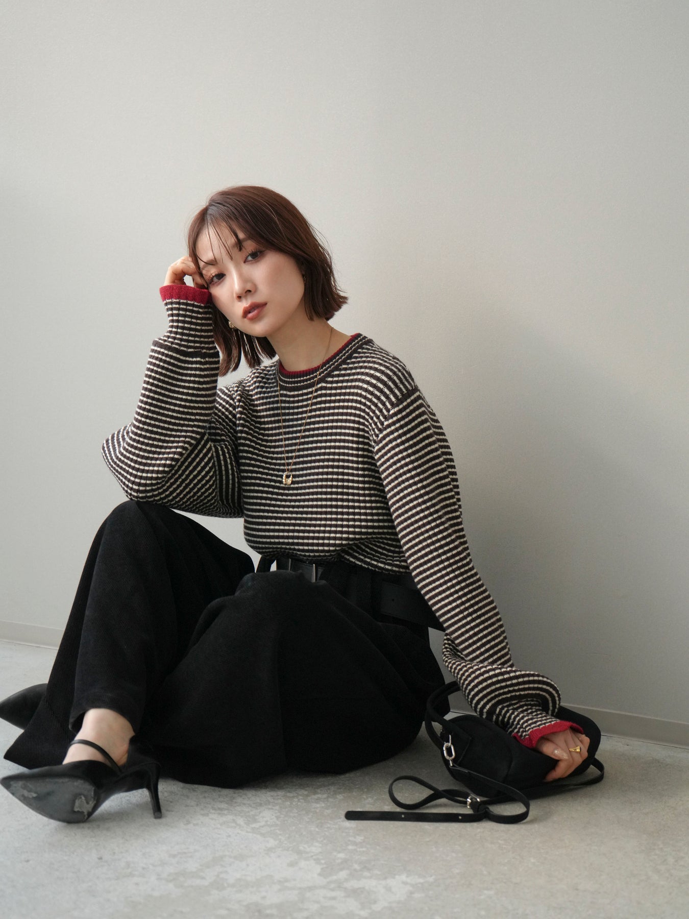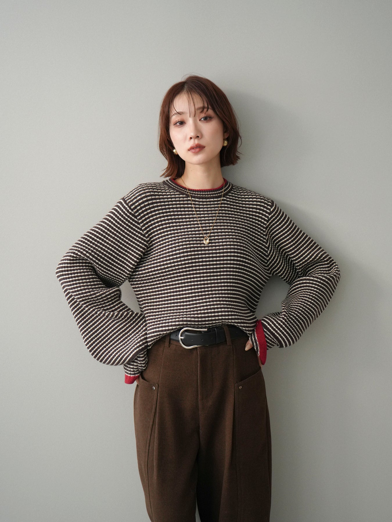 [予約]ラメ異素材ボーダーリブニットプルオーバー/brown×red