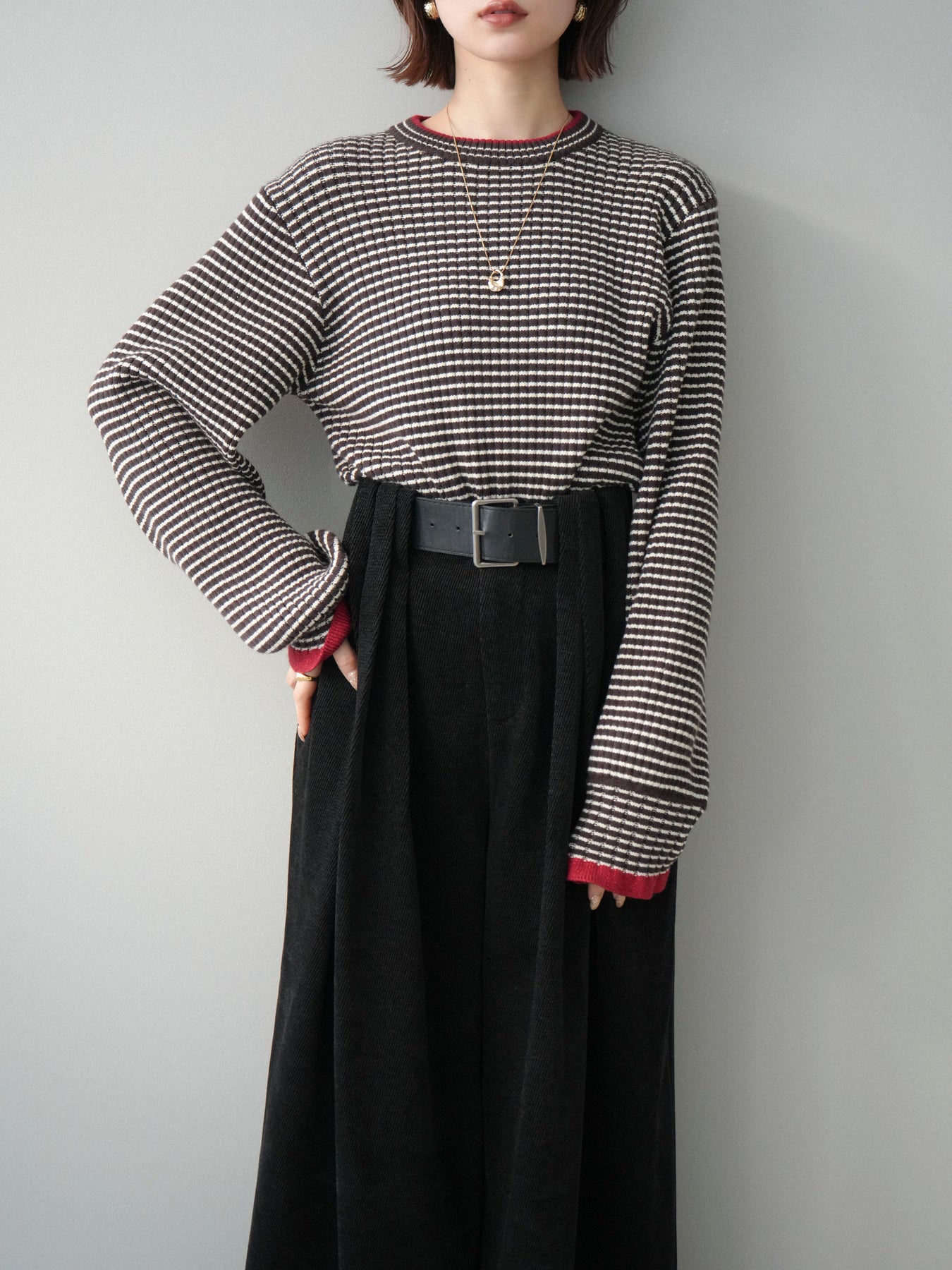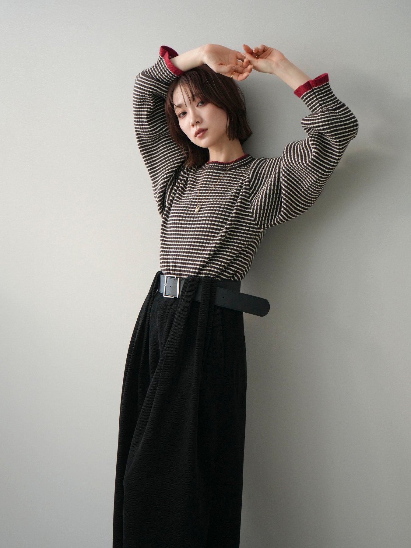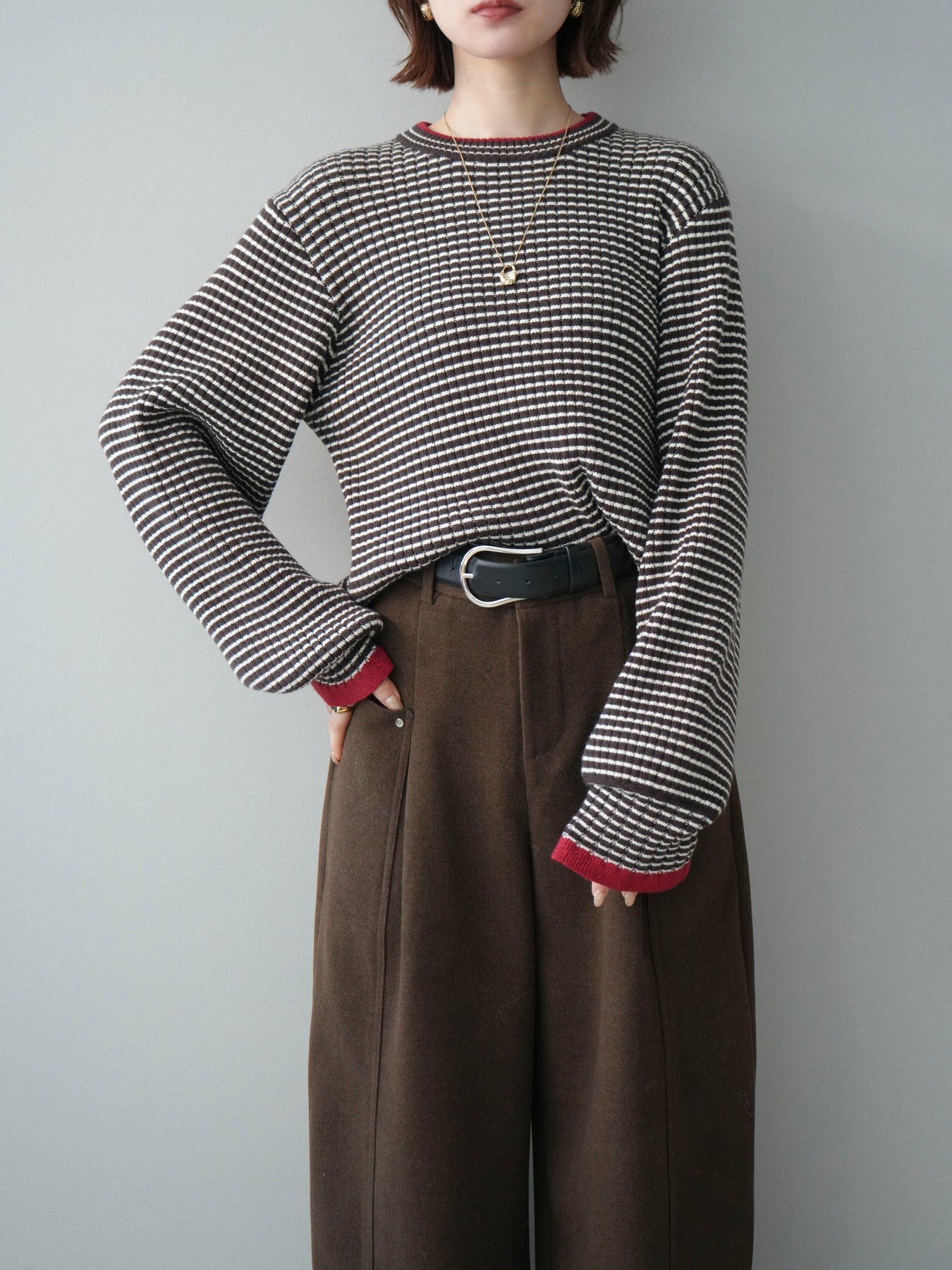 [予約]ラメ異素材ボーダーリブニットプルオーバー/brown×red