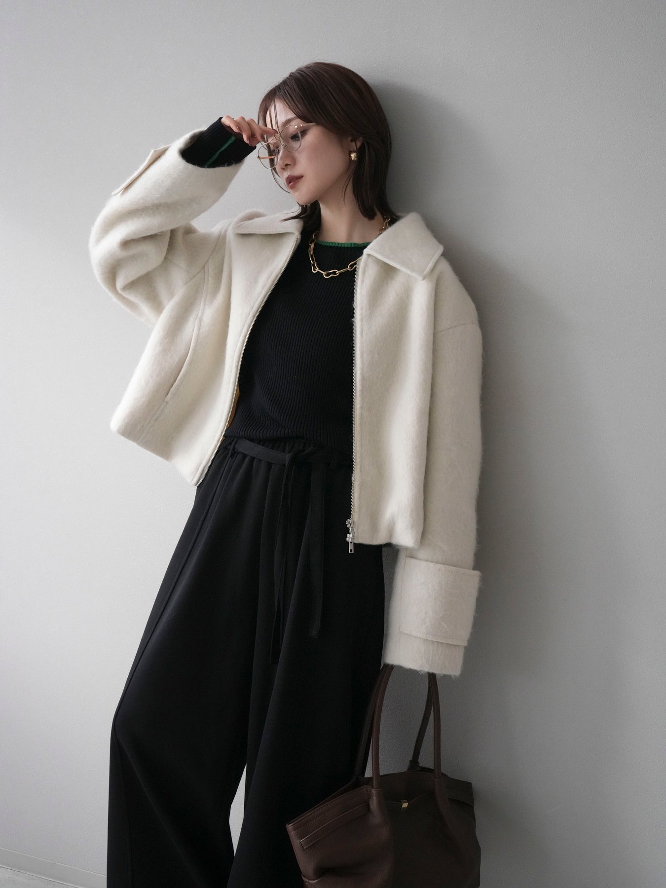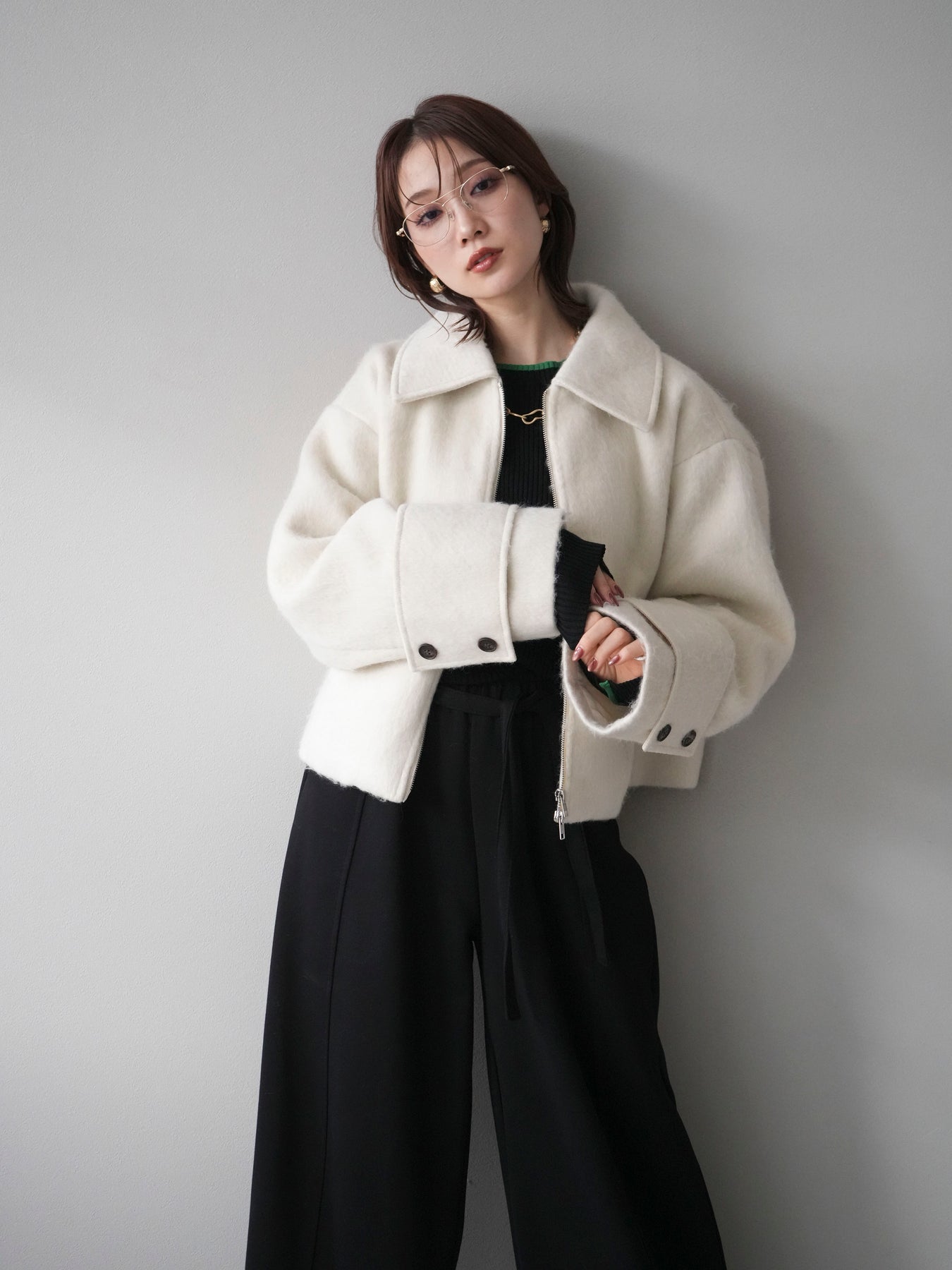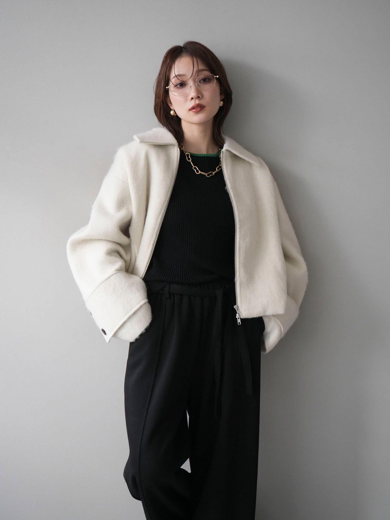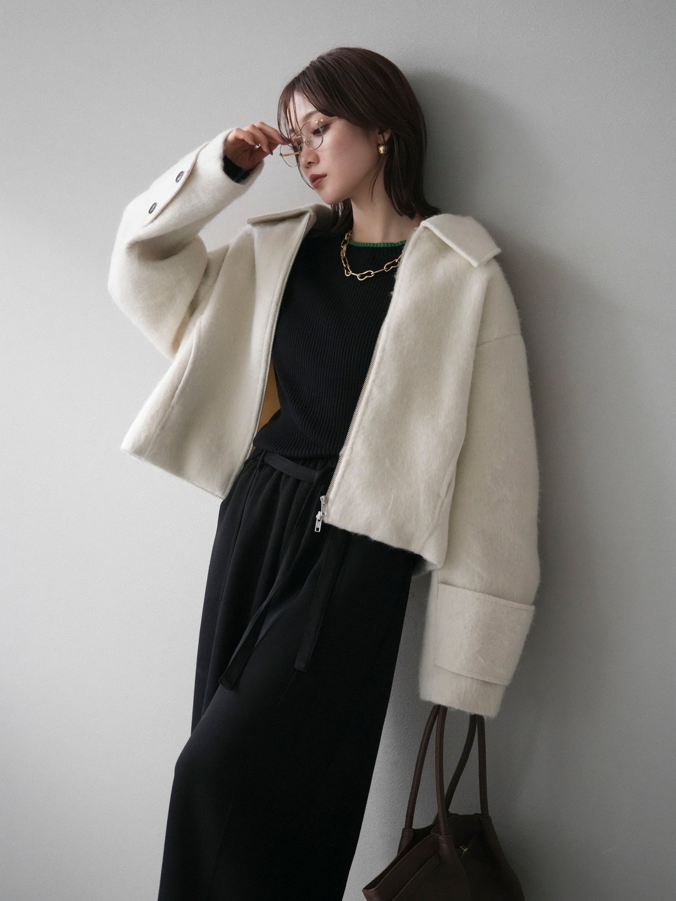 ふんわりとしたビッグループシャギー素材が存在感を放つジップブルゾン。 毛足の長い生地が光を柔らかく反射し、上品なニュアンスを漂わせます。 コンパクトな丈感ながらも袖に程よいボリュームを持たせ、バランスの取れたシルエットに。 ジップを閉めればすっきりとした印象に、開けて羽織れば抜け感のあるスタイルが楽しめます。 デニムやスカートなど、幅広いコーディネートにマッチする今季注目のアウターです。 ※ボトムス、キャミソール(インナー)以外の商品は一律でインナーは付属していません。