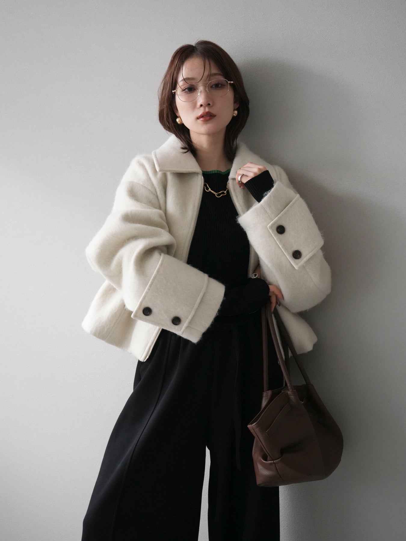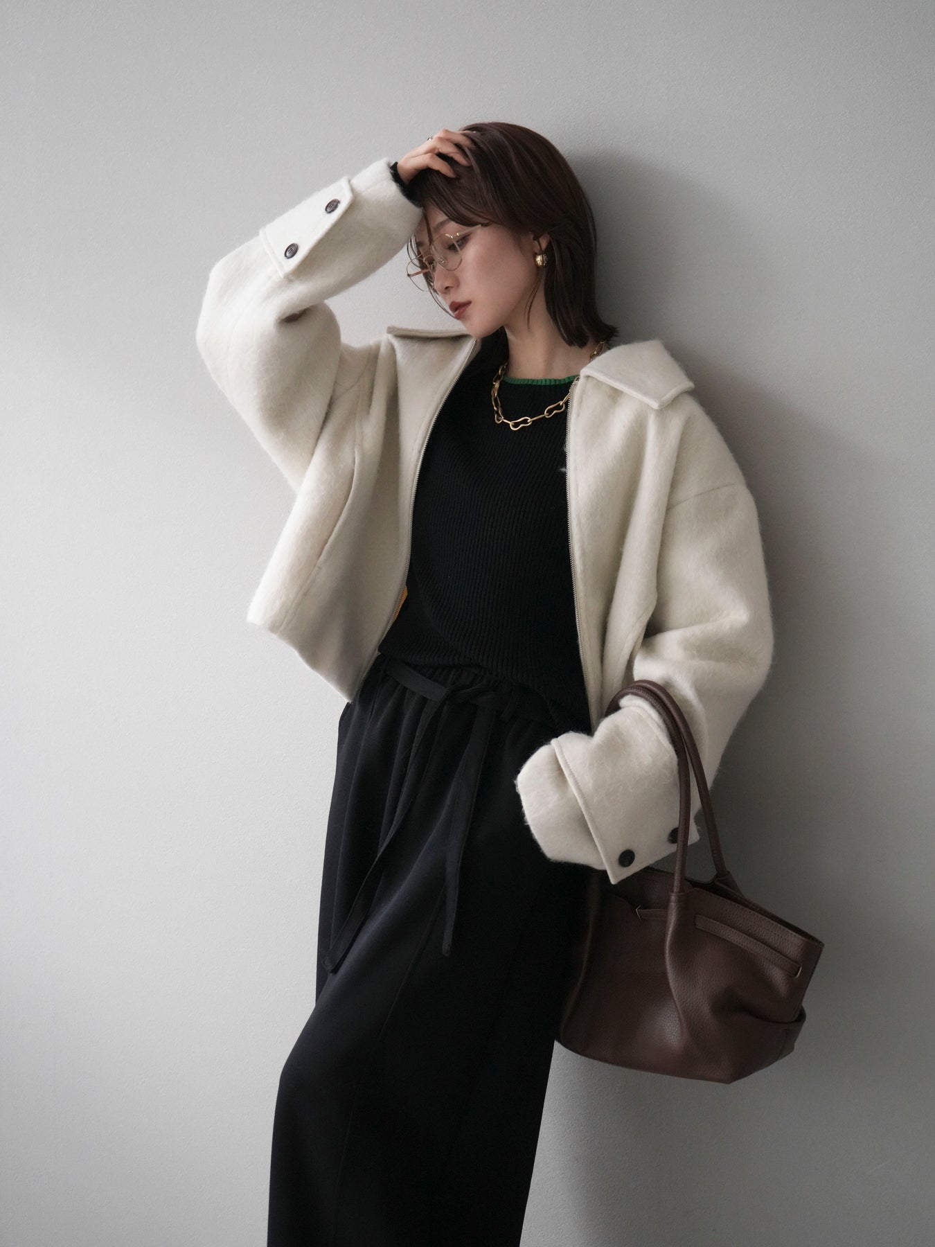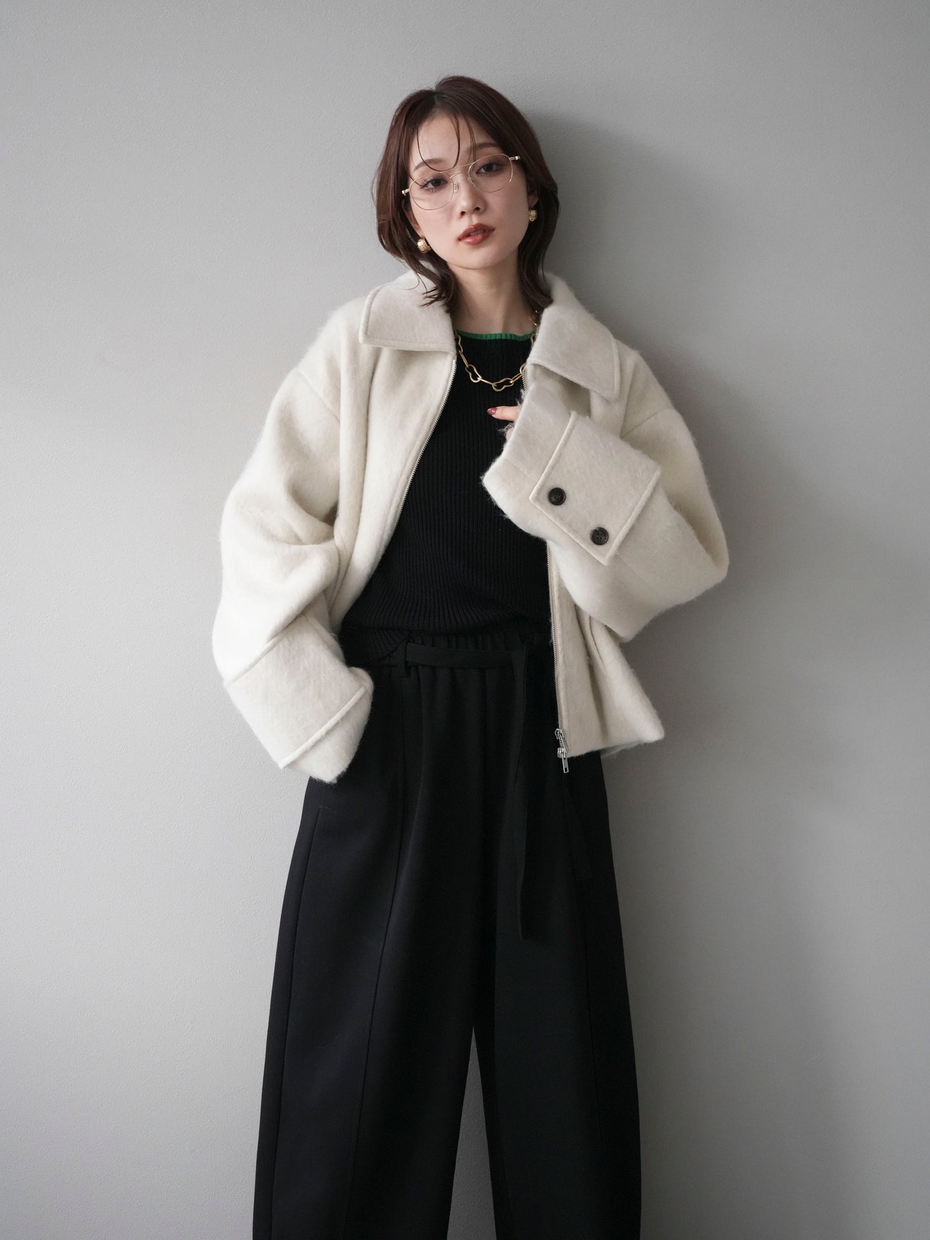 ふんわりとしたビッグループシャギー素材が存在感を放つジップブルゾン。 毛足の長い生地が光を柔らかく反射し、上品なニュアンスを漂わせます。 コンパクトな丈感ながらも袖に程よいボリュームを持たせ、バランスの取れたシルエットに。 ジップを閉めればすっきりとした印象に、開けて羽織れば抜け感のあるスタイルが楽しめます。 デニムやスカートなど、幅広いコーディネートにマッチする今季注目のアウターです。 ※ボトムス、キャミソール(インナー)以外の商品は一律でインナーは付属していません。
