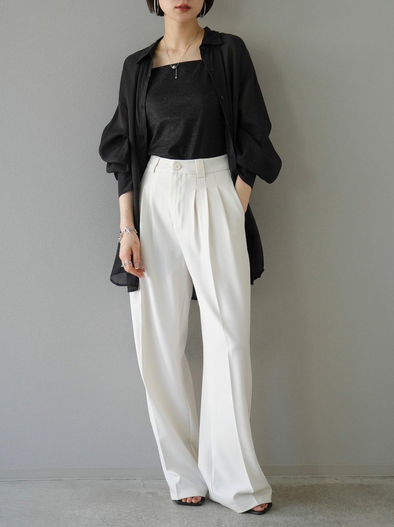 ボリュームスリーブが女性らしさを引き立ててくれるシンプルなシアーシャツ。肌離れのいいオーバーサイズに加え、タックが施されたゆとりのあるバックスタイルによって快適な着心地です。きちんと着るのはもちろん、ボタンを開けてVネックにしたり、襟を抜いたりと着崩してもさまになり、羽織としてもお使いいただける万能アイテムです。