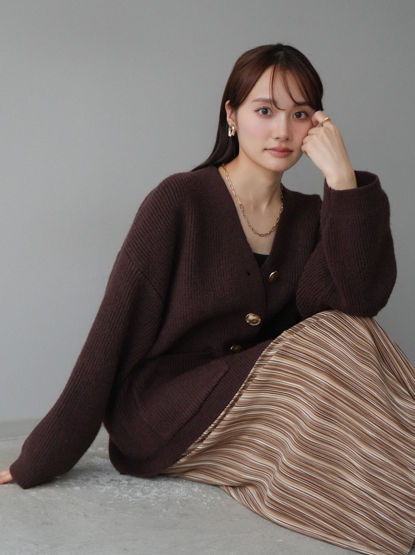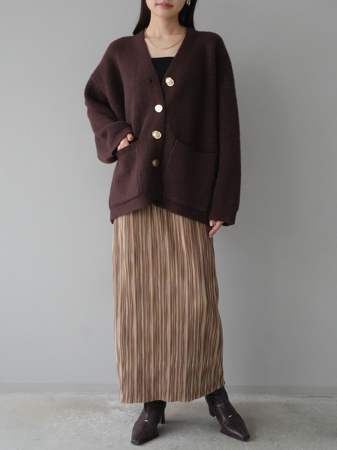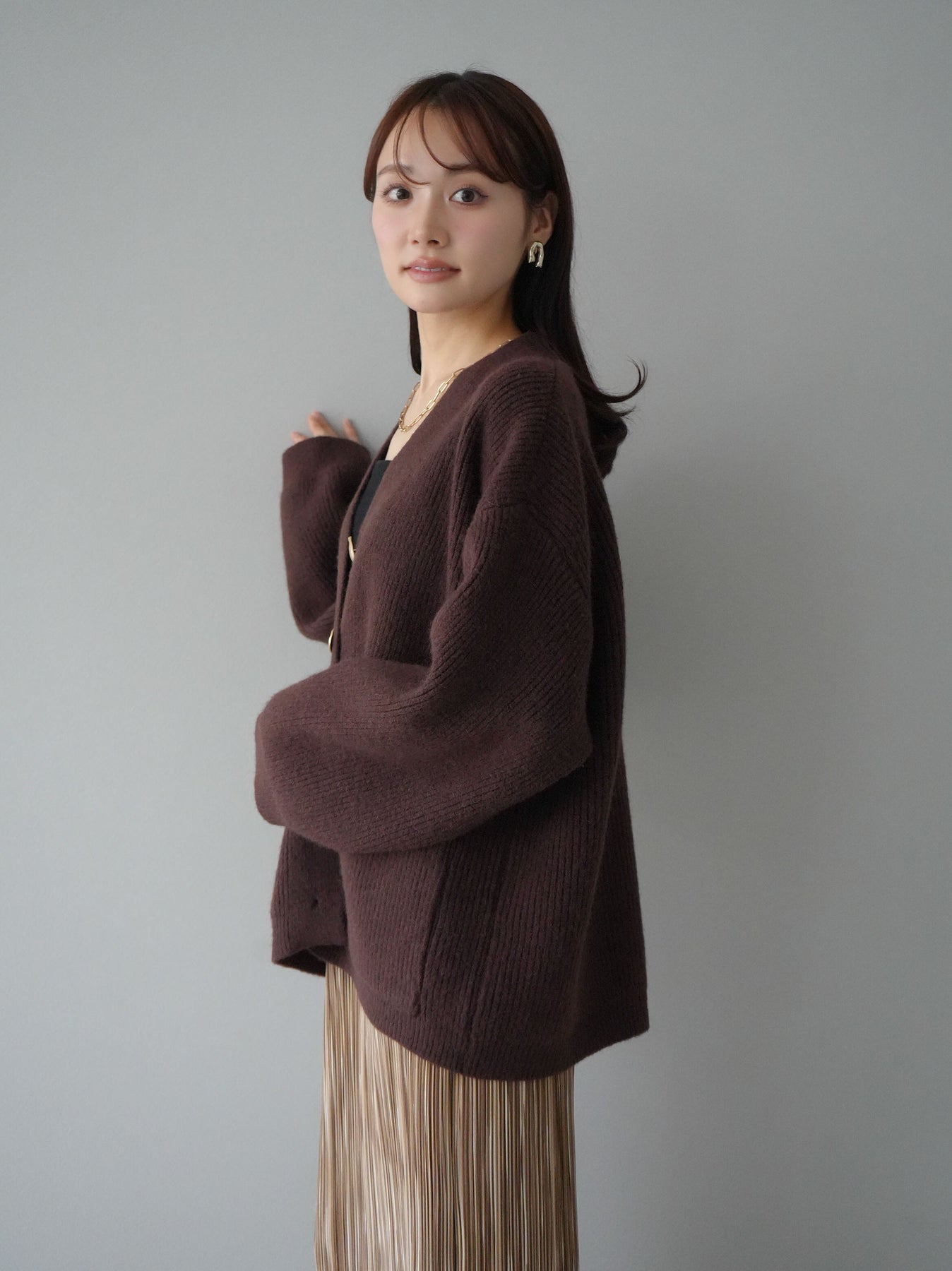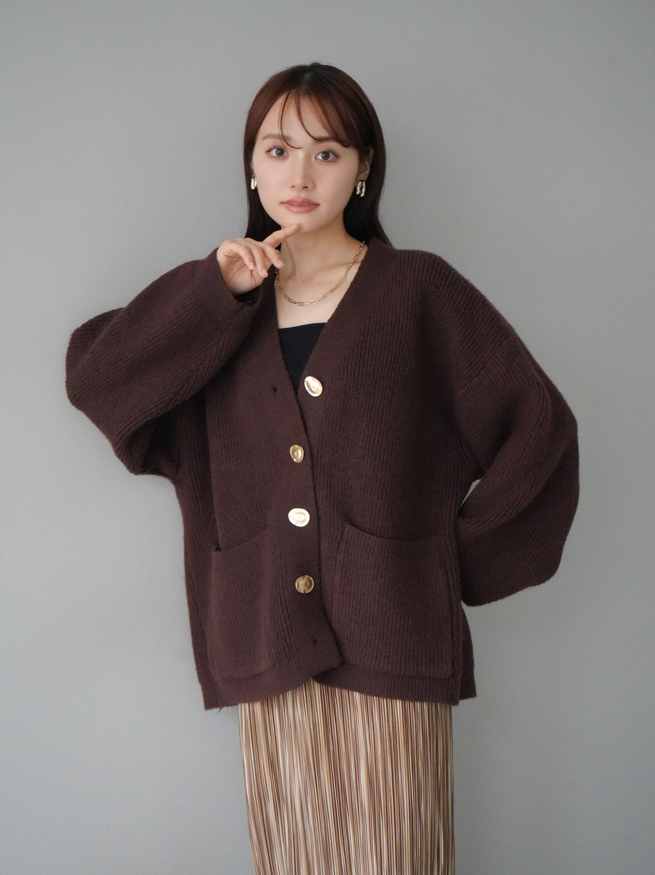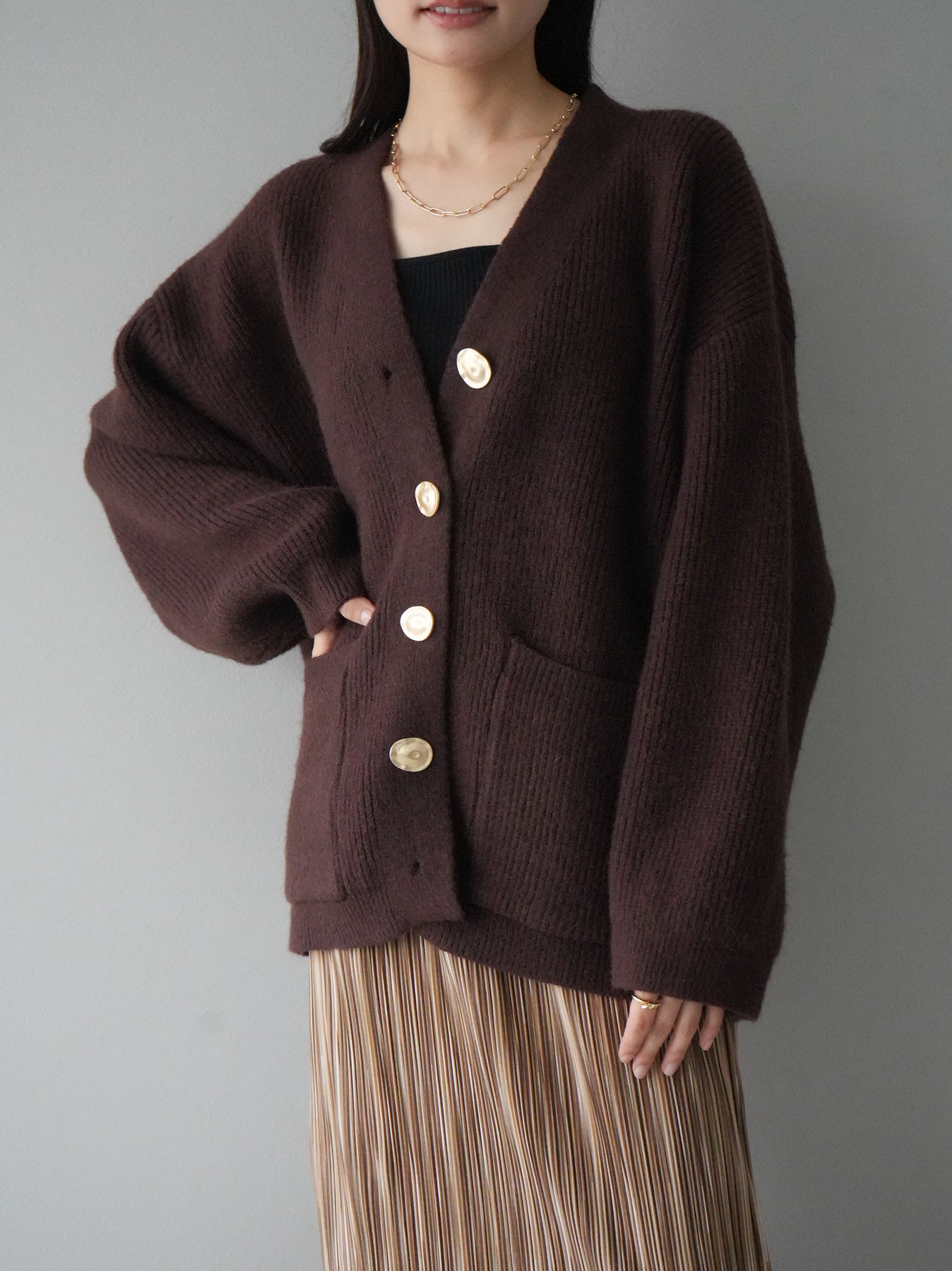 [予約]メタルボタンVネックあぜ編みニットカーディガン/ブラウン
