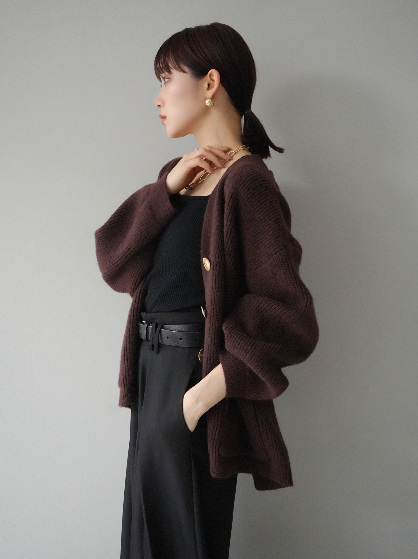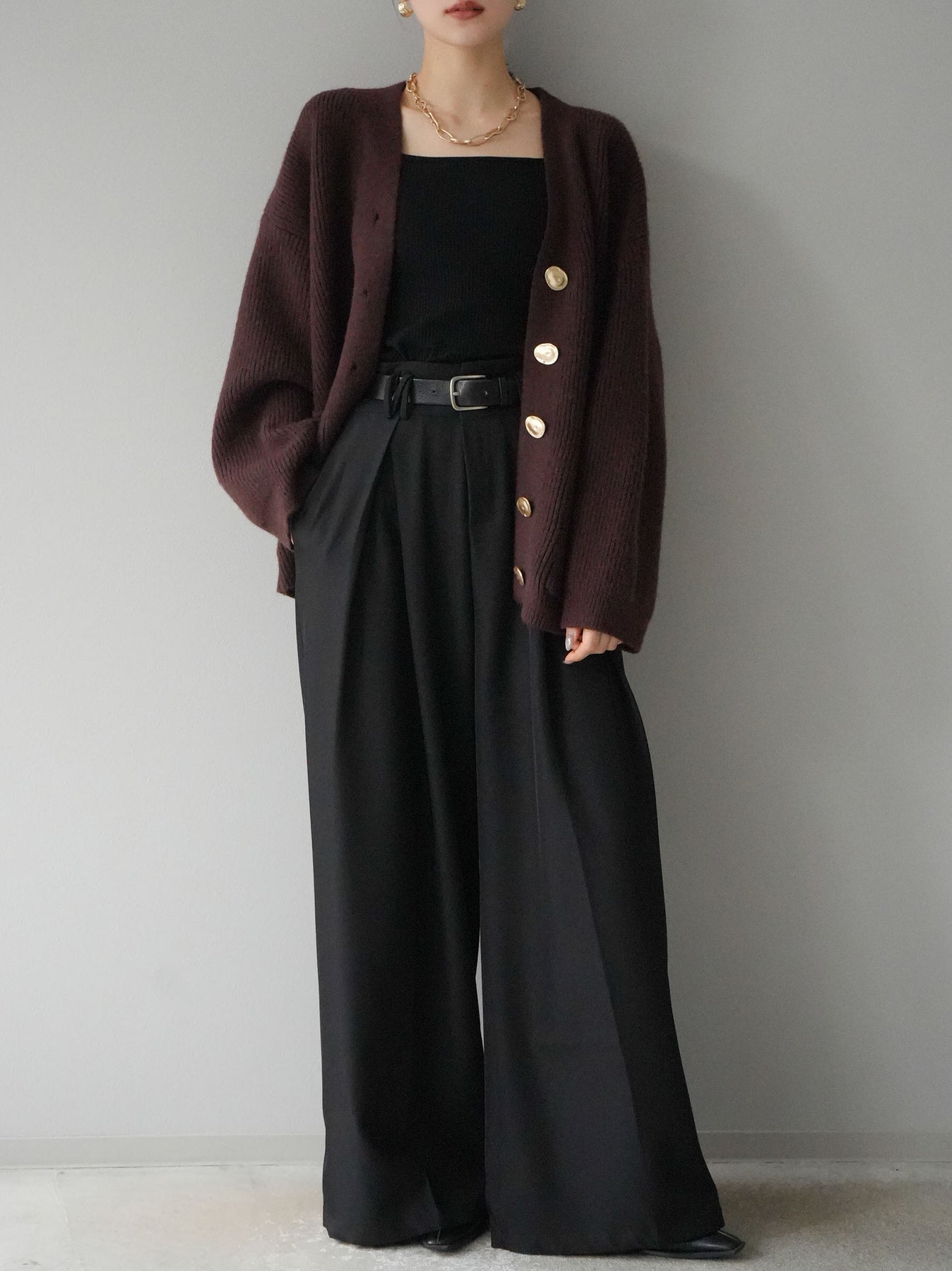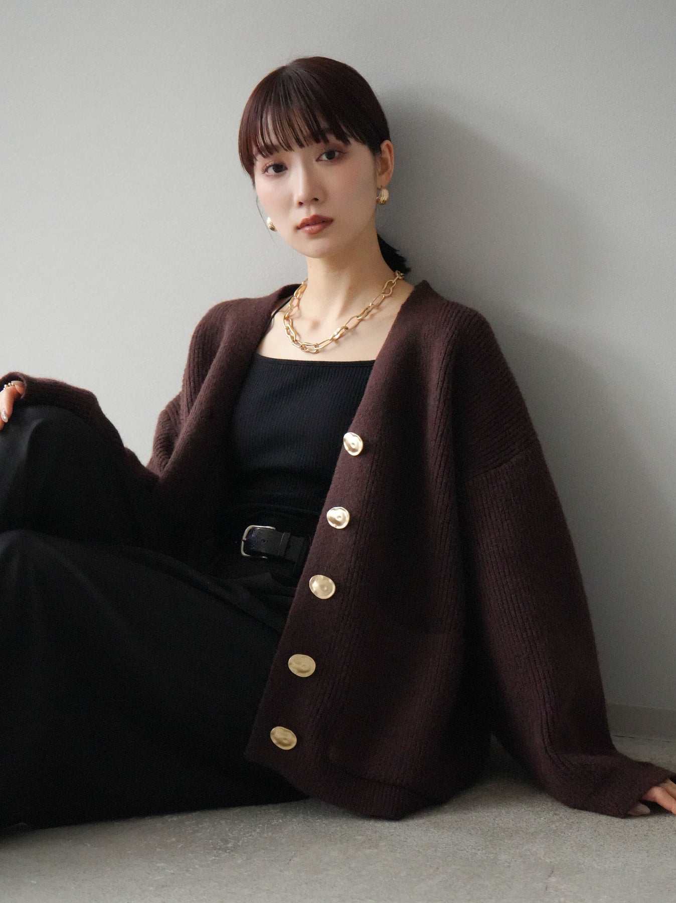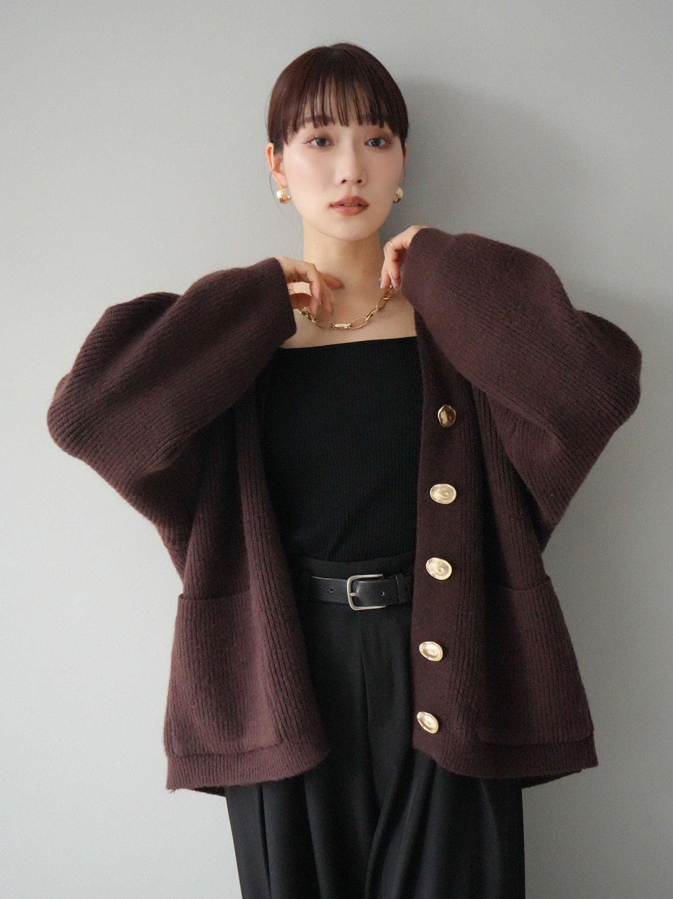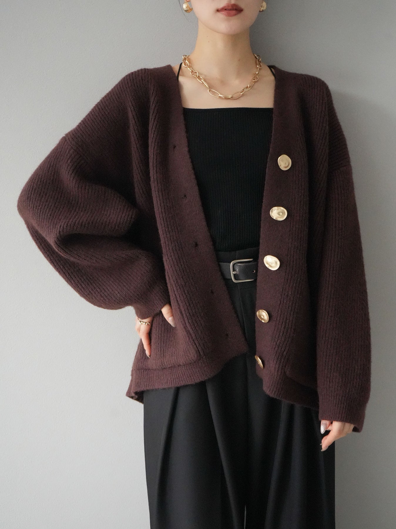 高級感あふれるメタルボタンがポイントのVネックあぜ編みニットカーディガン。ゆったりとしたシルエットでリラックスした着心地を提供し、トレンド感のあるスタイルを演出します。幅広いコーディネートに合わせやすく、カジュアルからフェミニンまで多彩なシーンで活躍するアイテムです。 ※ボトムス、キャミソール(インナー)以外の商品は一律でインナーは付属していません。