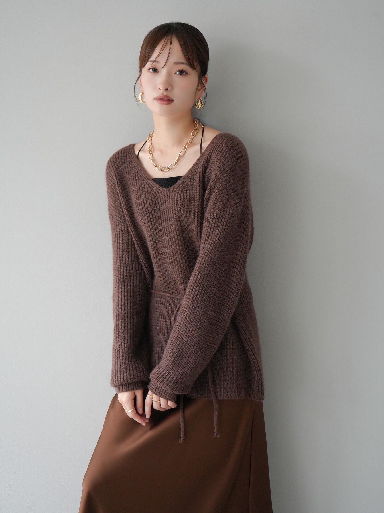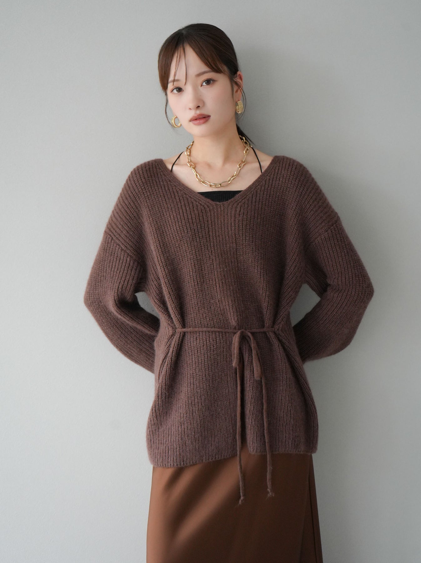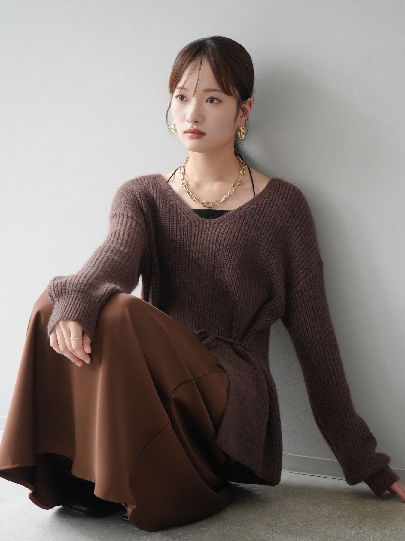深めのVネックとフロントスリットが特徴的なニットプルオーバー。リラックス感のあるシルエットで、付属のベルトでウエストマークも可能。1枚でトレンドを取り入れたスタイルを楽しめるアイテムです。 ※ボトムス、キャミソール(インナー)以外の商品は一律でインナーは付属していません