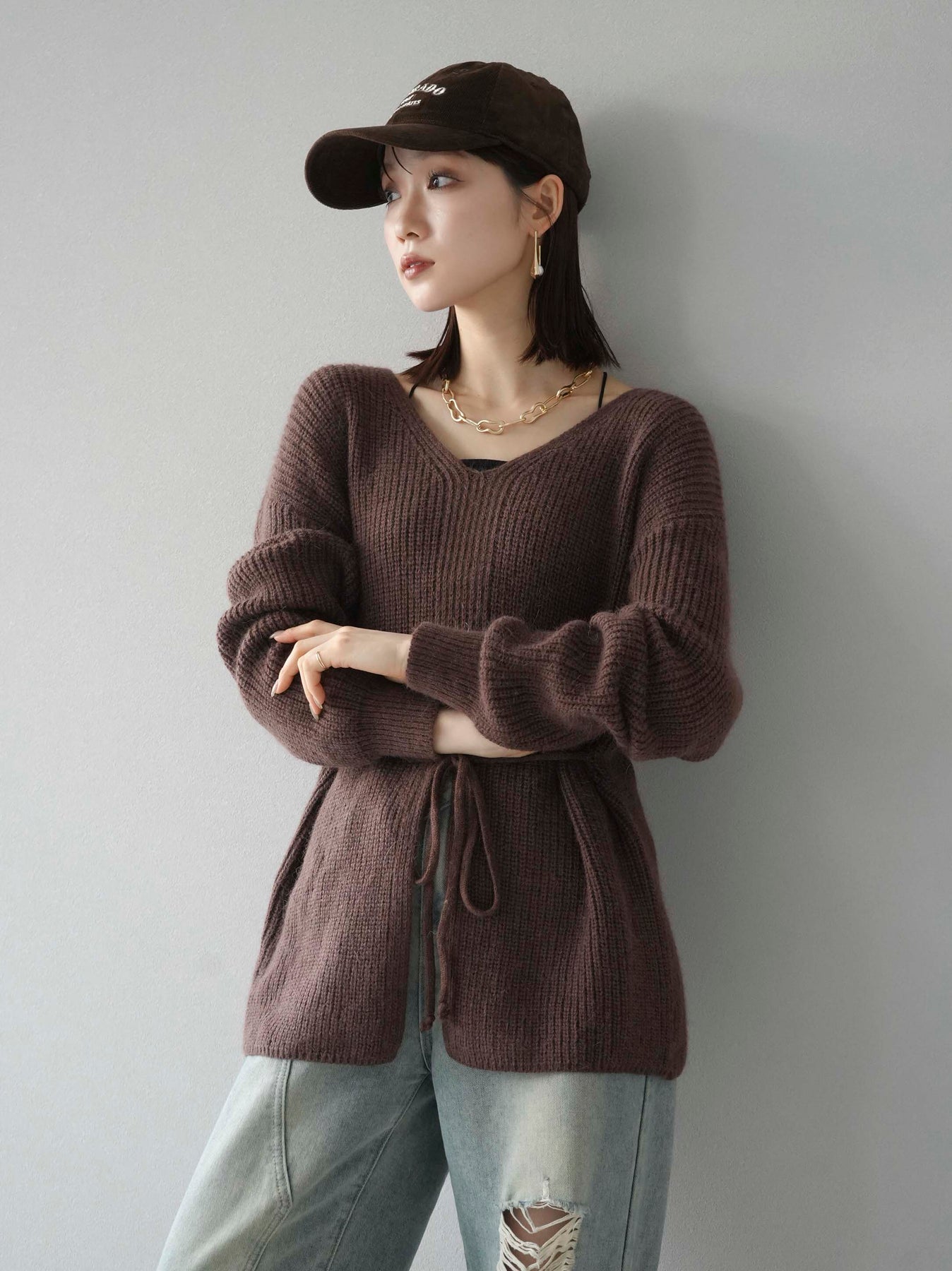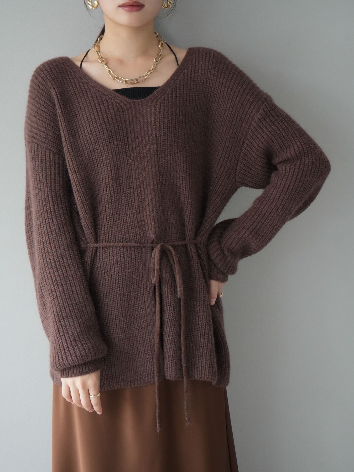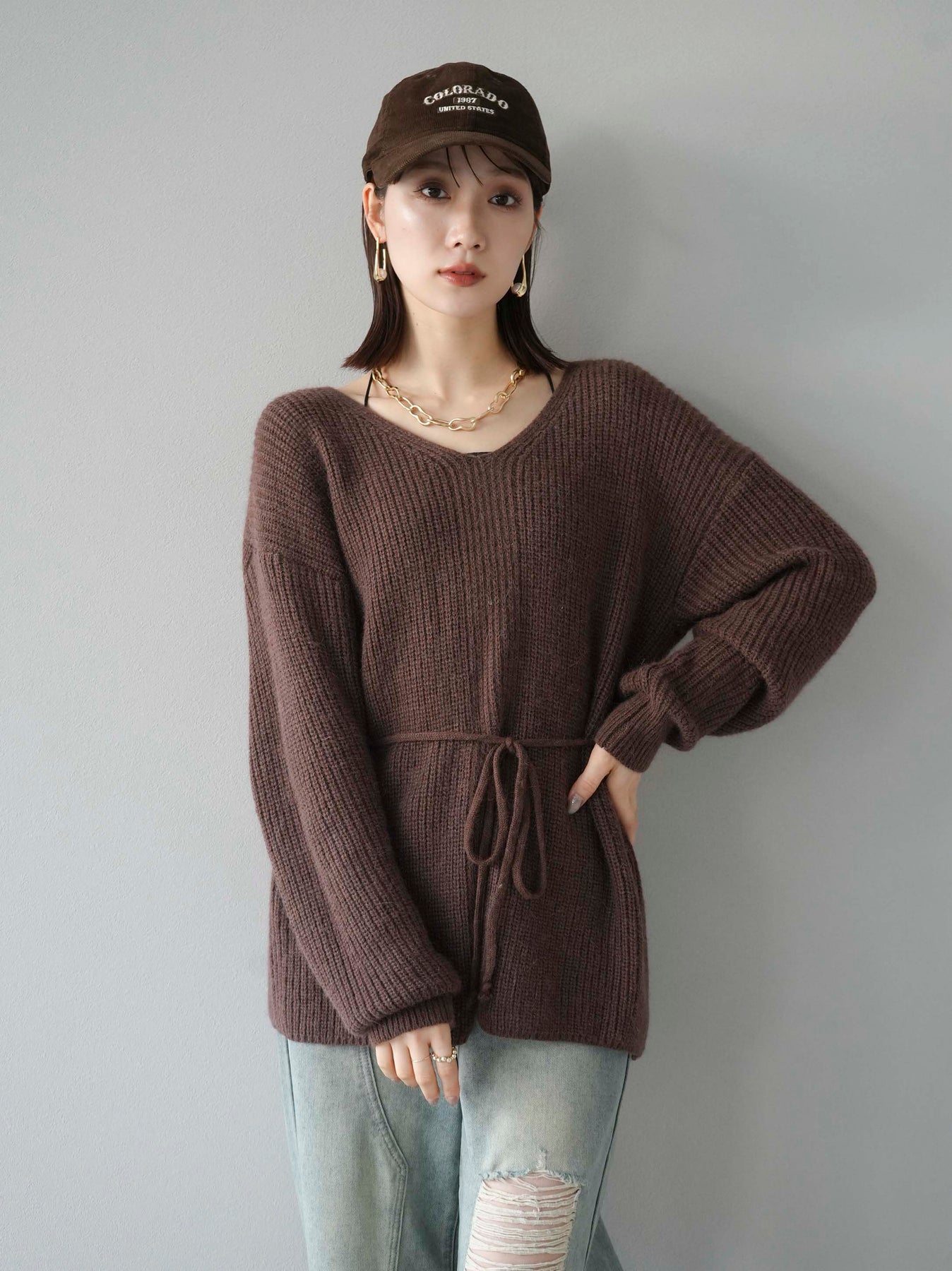 深めのVネックとフロントスリットが特徴的なニットプルオーバー。リラックス感のあるシルエットで、付属のベルトでウエストマークも可能。1枚でトレンドを取り入れたスタイルを楽しめるアイテムです。 ※ボトムス、キャミソール(インナー)以外の商品は一律でインナーは付属していません