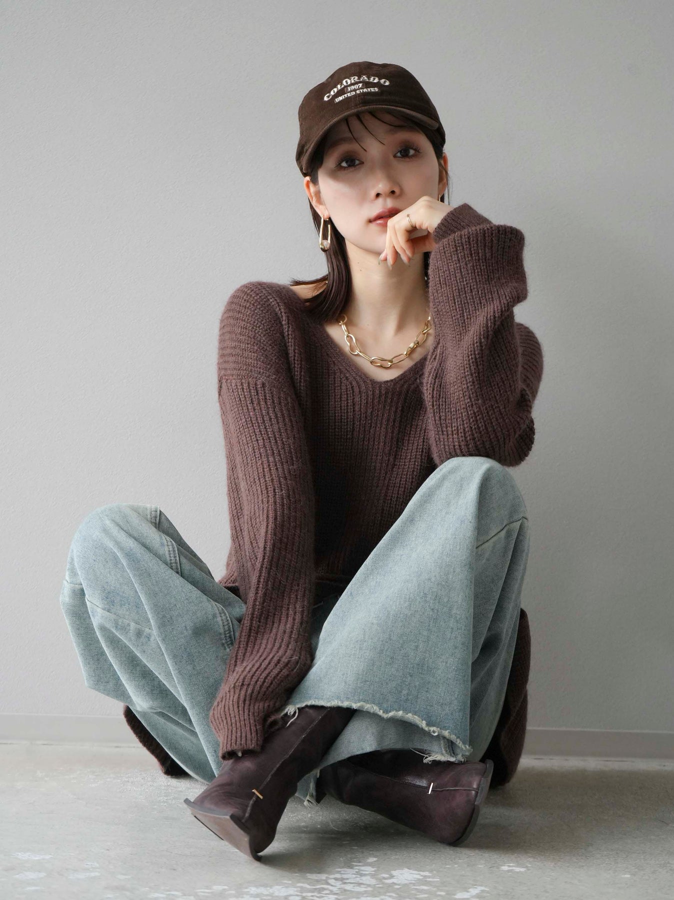 [予約]フロントスリットVネックニットプルオーバー/ブラウン