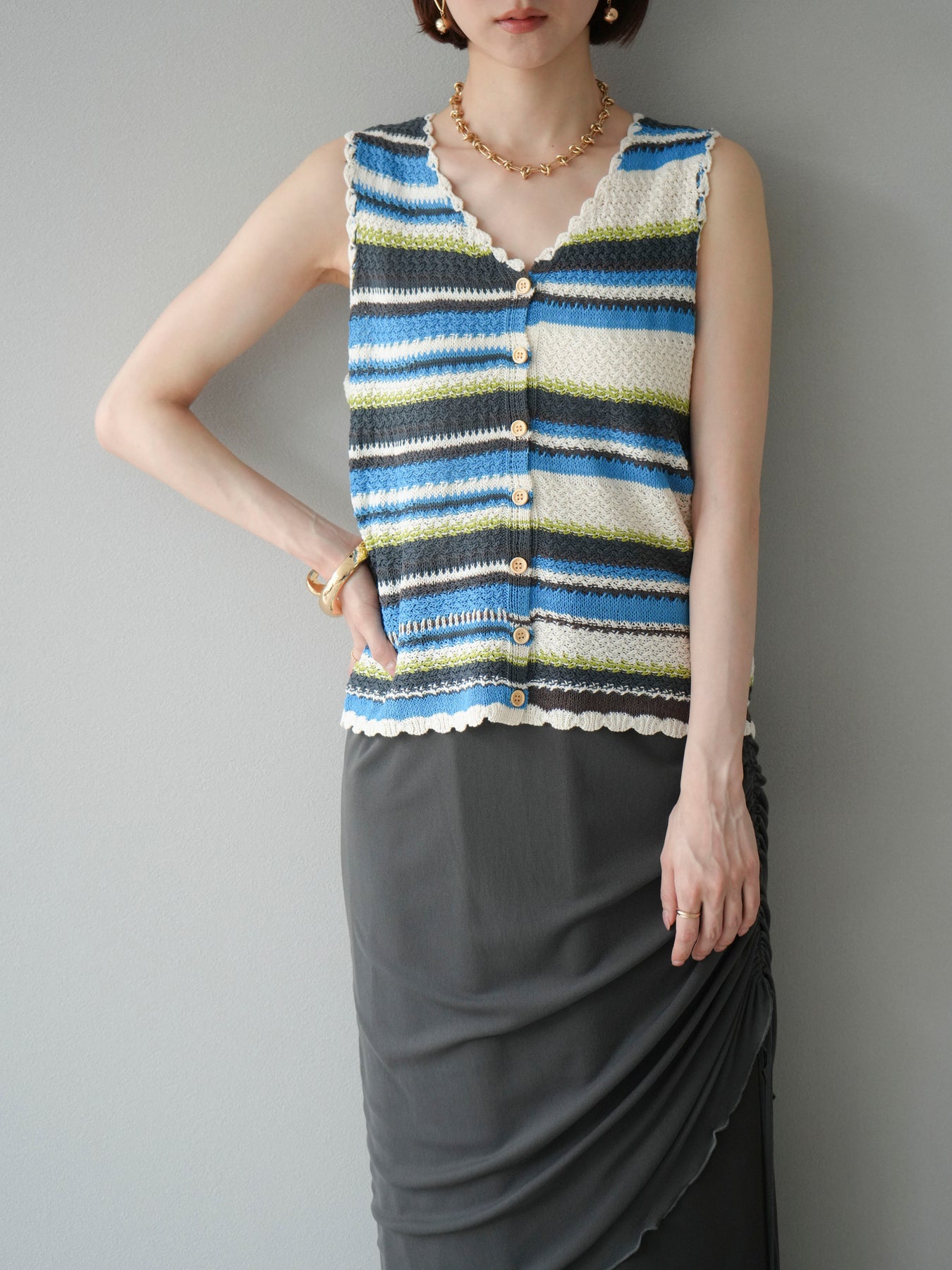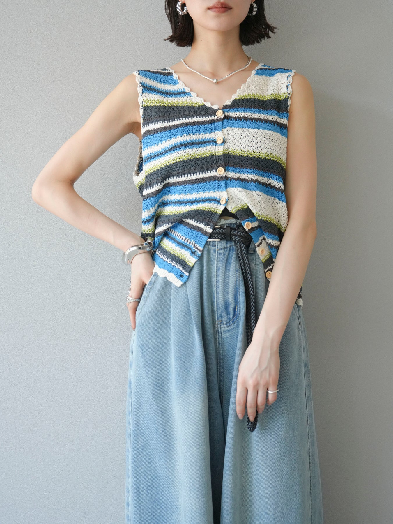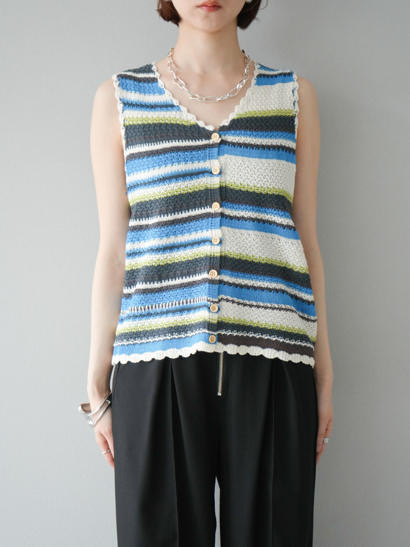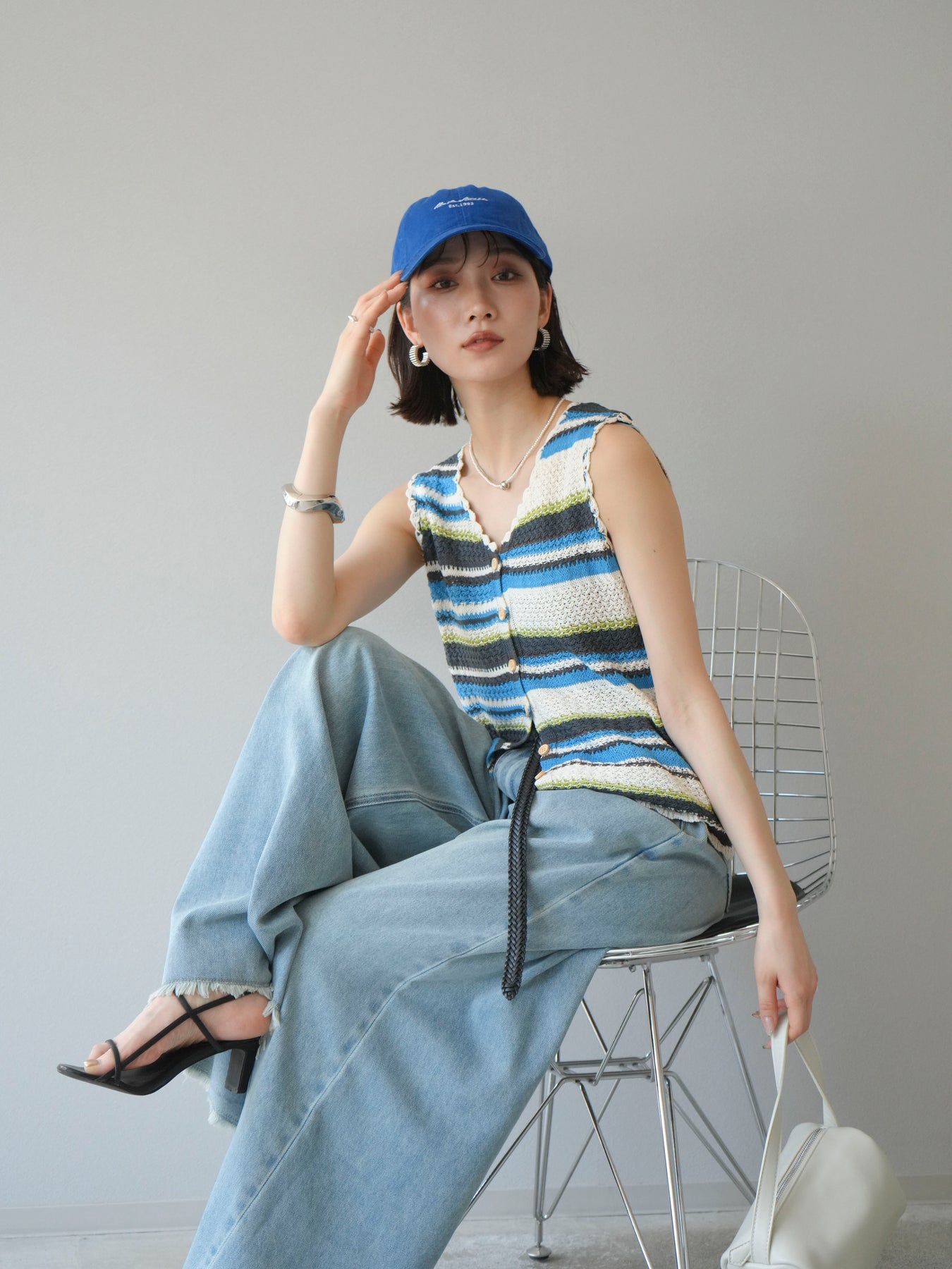 爽やかなカラーリングが目を惹く、マルチボーダー柄のニットベスト。表情豊かな編地と配色で、スタイリングの主役になる一着です。ノースリーブで抜け感がありながらも、程よく体に馴染むシルエットで着心地も快適。フロントのボタン仕様により、トップスとしてはもちろん羽織りとしても活躍。カジュアルなデニムとの相性はもちろん、スカート合わせでフェミニンに仕上げるのもおすすめです。 ※ボトムス、キャミソール(インナー)以外の商品は一律でインナーは付属していません。