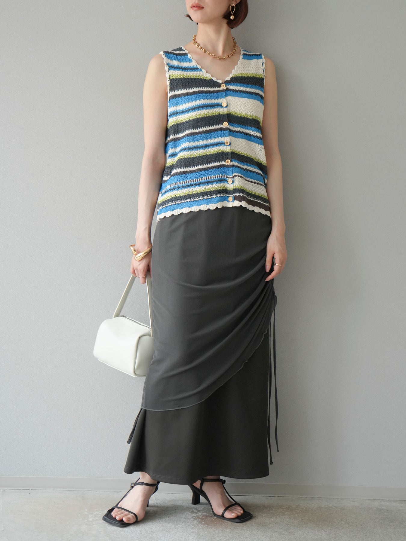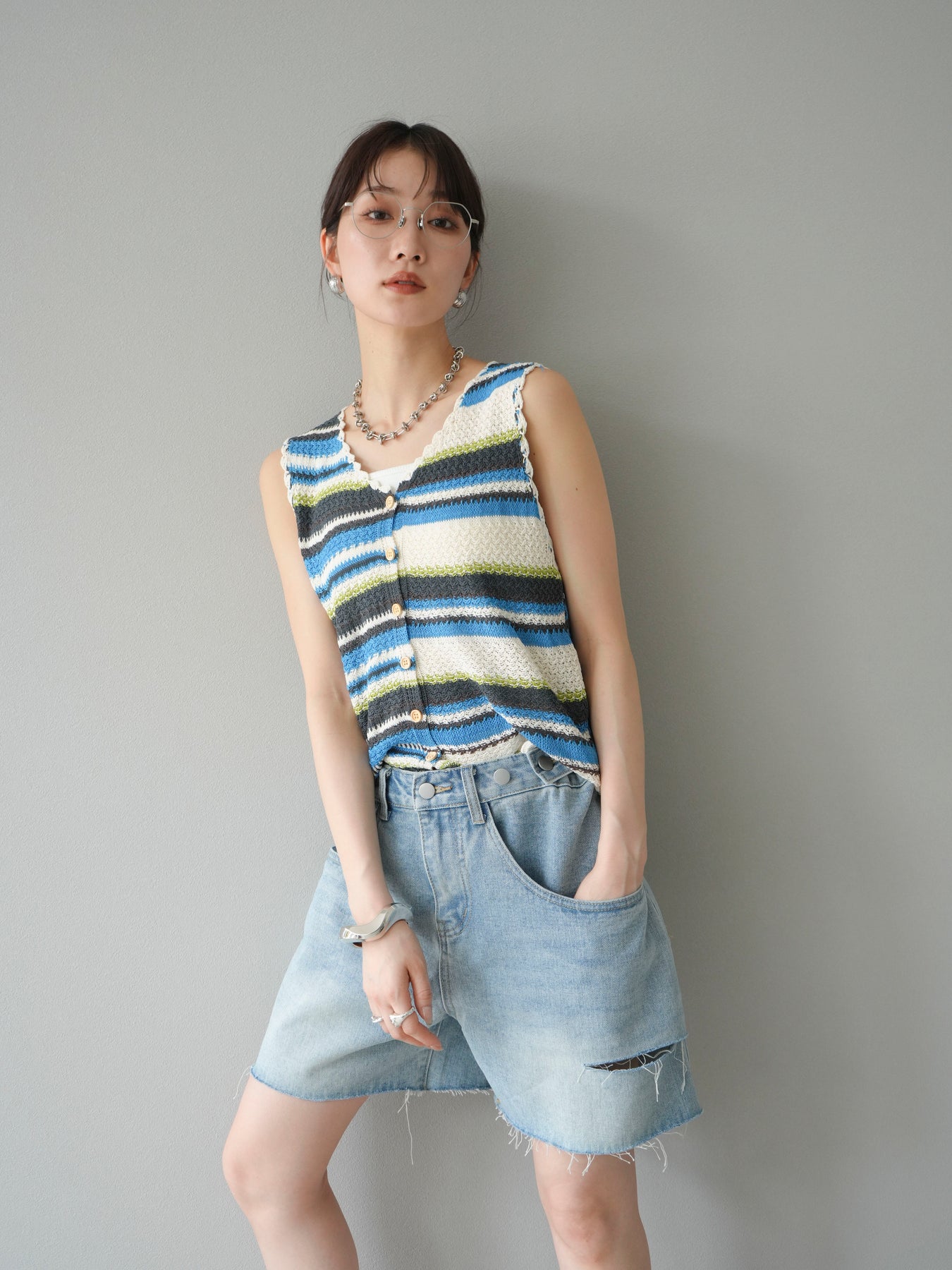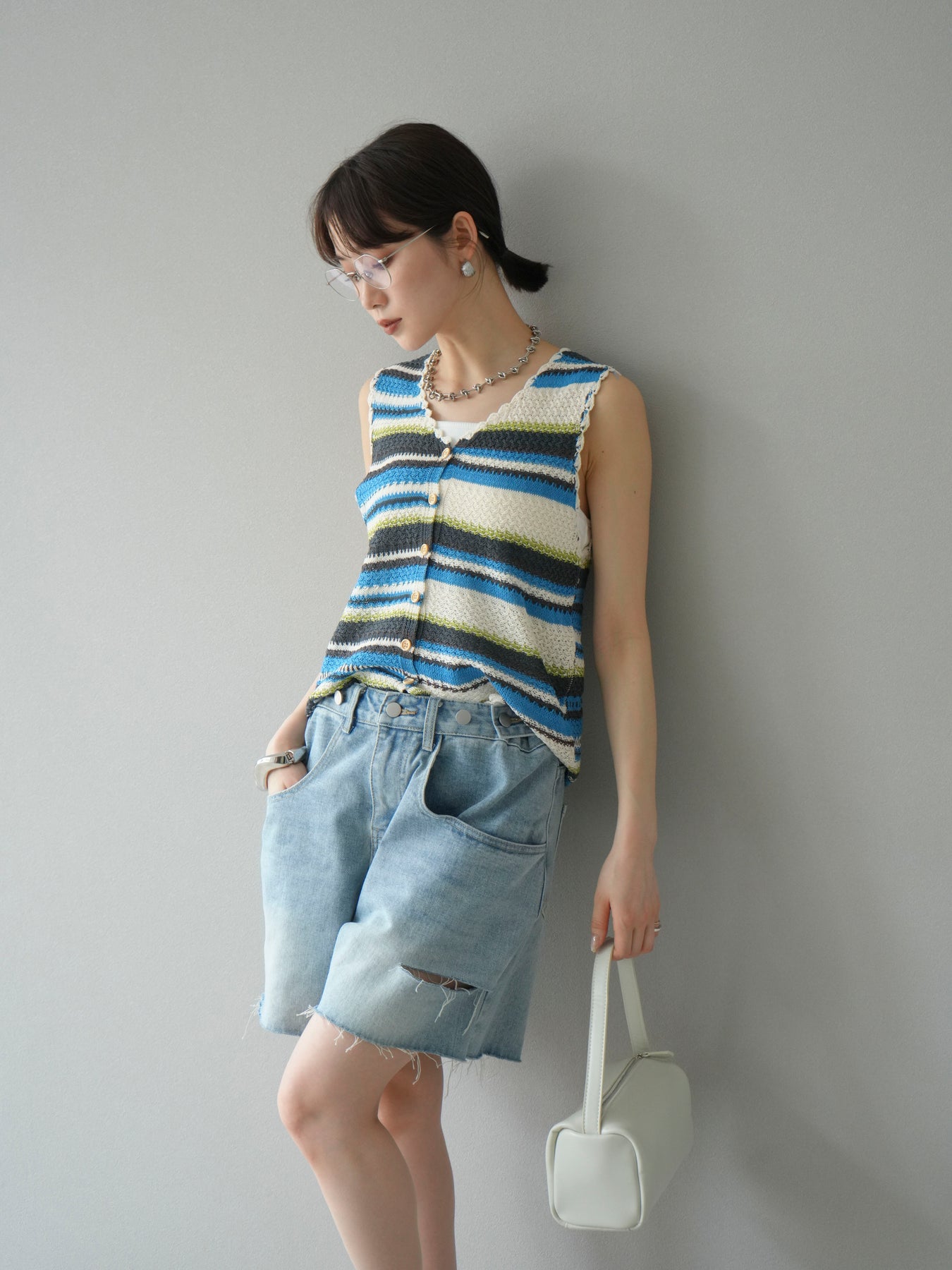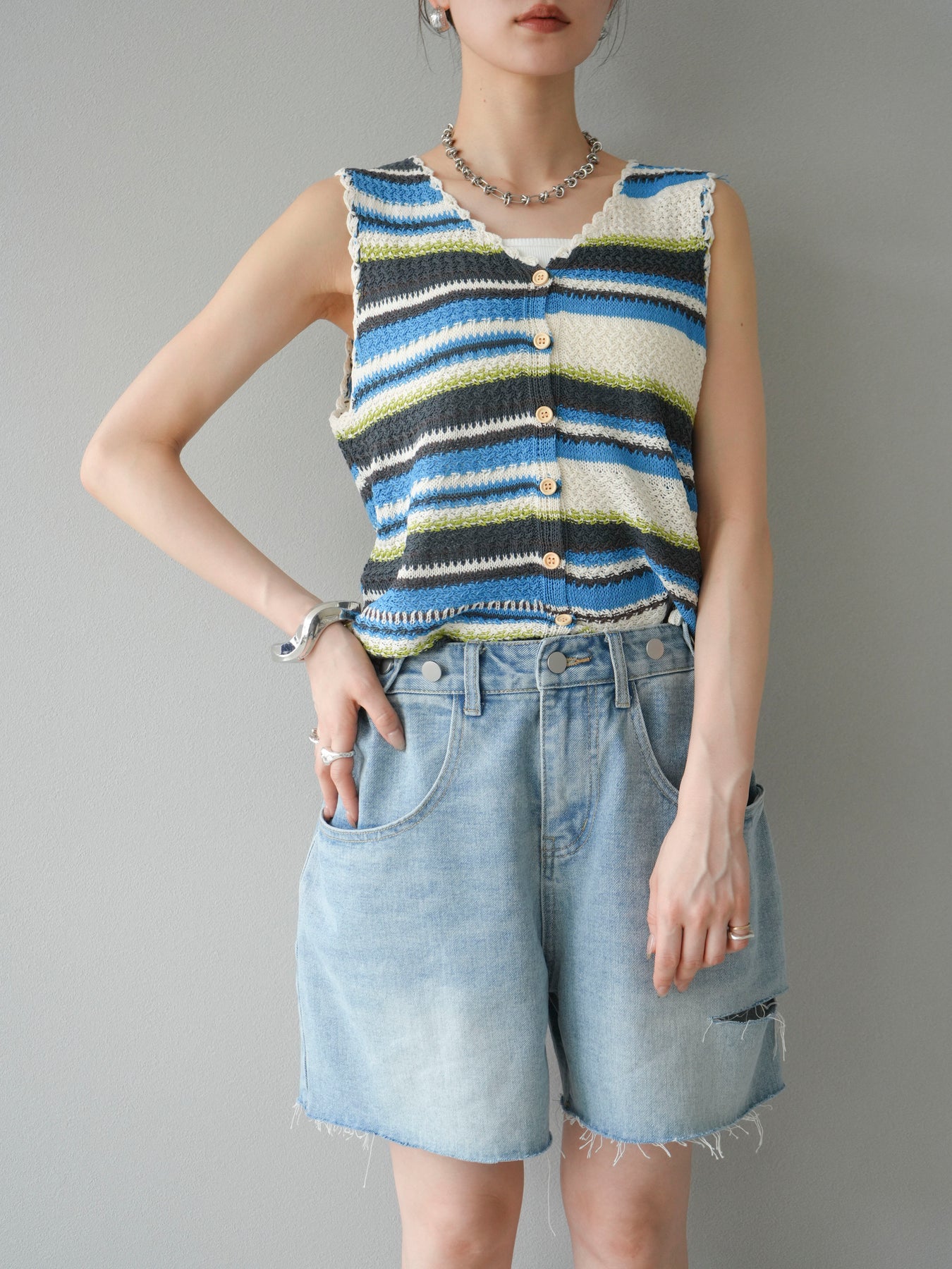 爽やかなカラーリングが目を惹く、マルチボーダー柄のニットベスト。表情豊かな編地と配色で、スタイリングの主役になる一着です。ノースリーブで抜け感がありながらも、程よく体に馴染むシルエットで着心地も快適。フロントのボタン仕様により、トップスとしてはもちろん羽織りとしても活躍。カジュアルなデニムとの相性はもちろん、スカート合わせでフェミニンに仕上げるのもおすすめです。 ※ボトムス、キャミソール(インナー)以外の商品は一律でインナーは付属していません。
