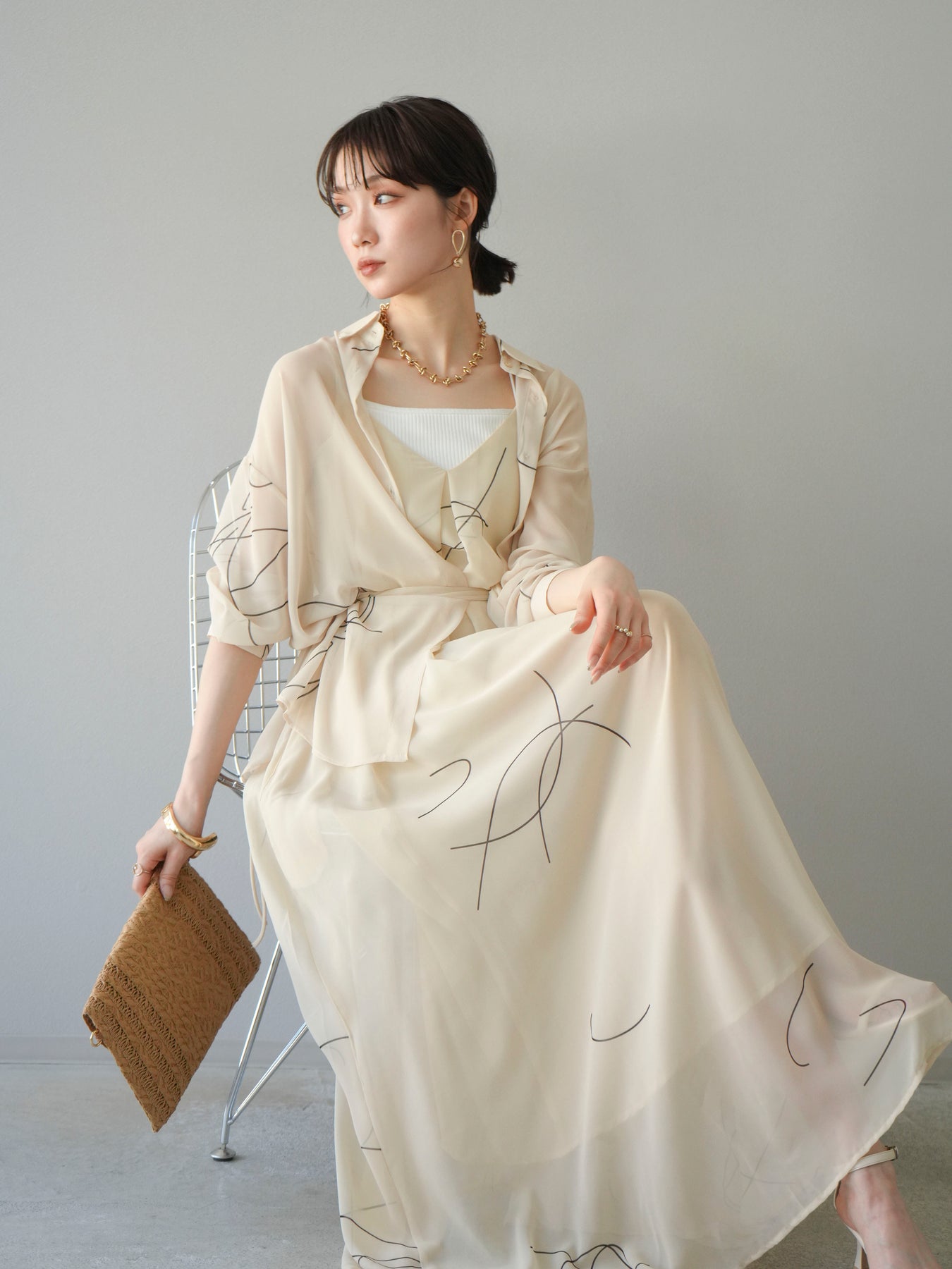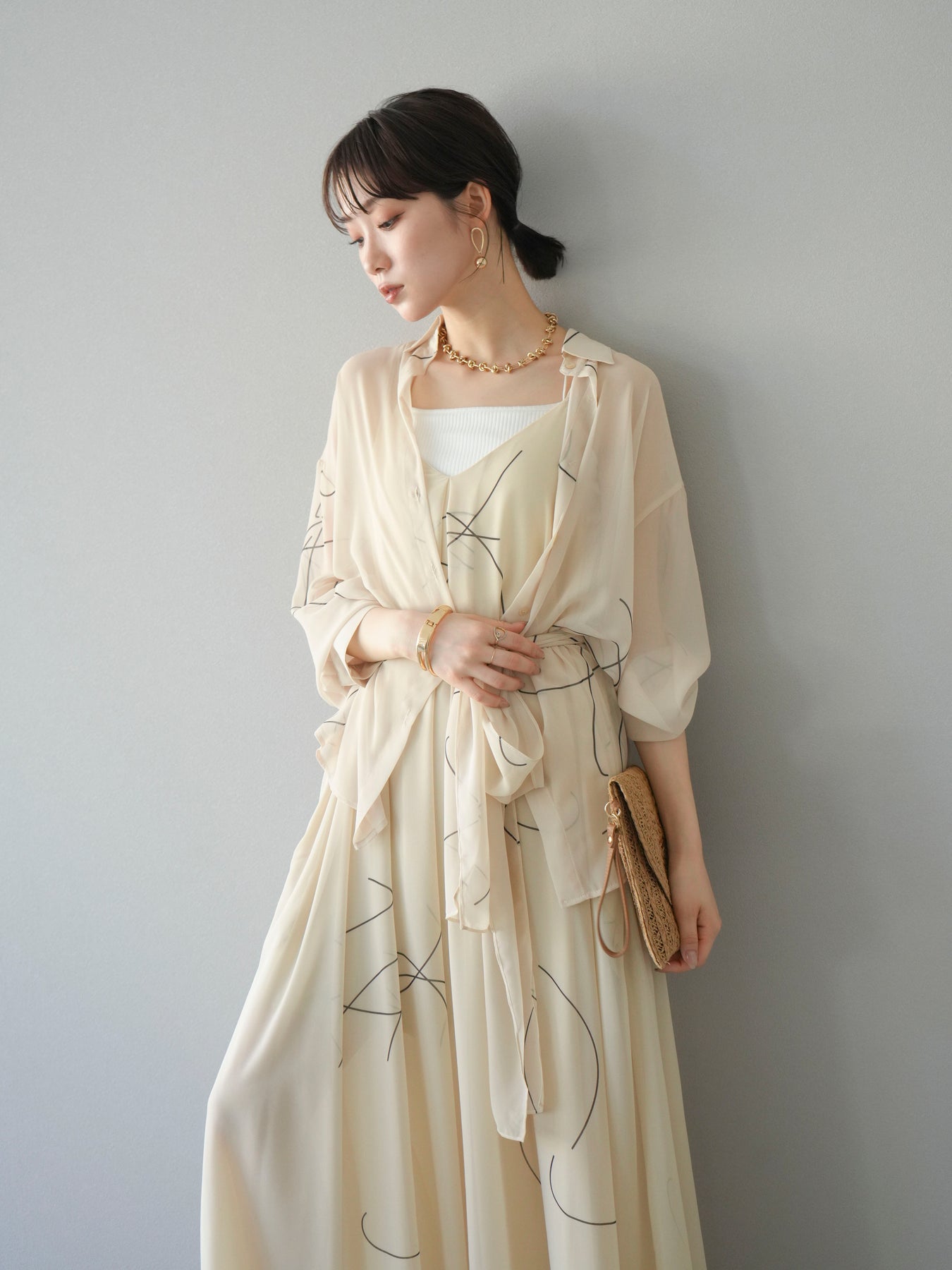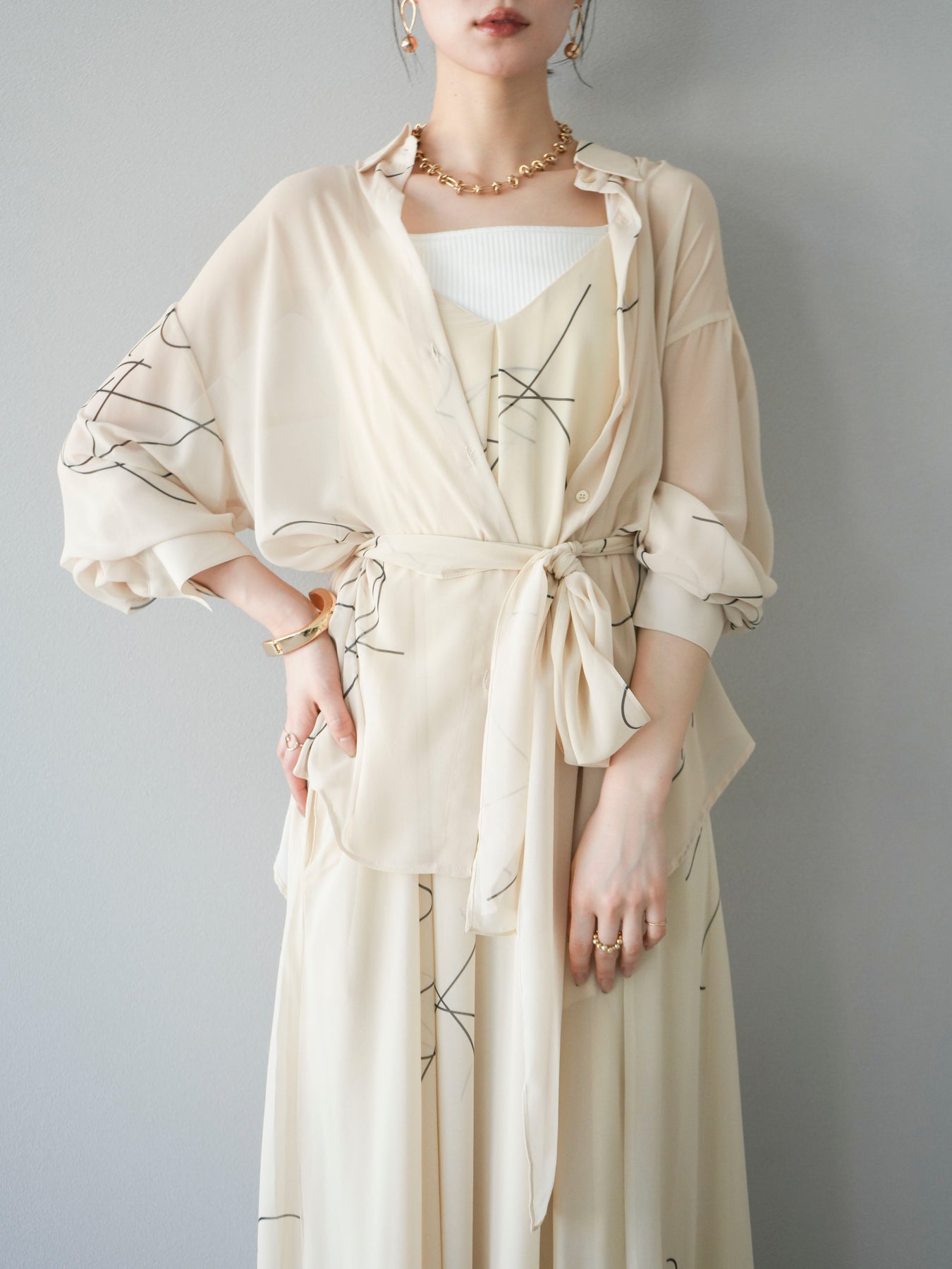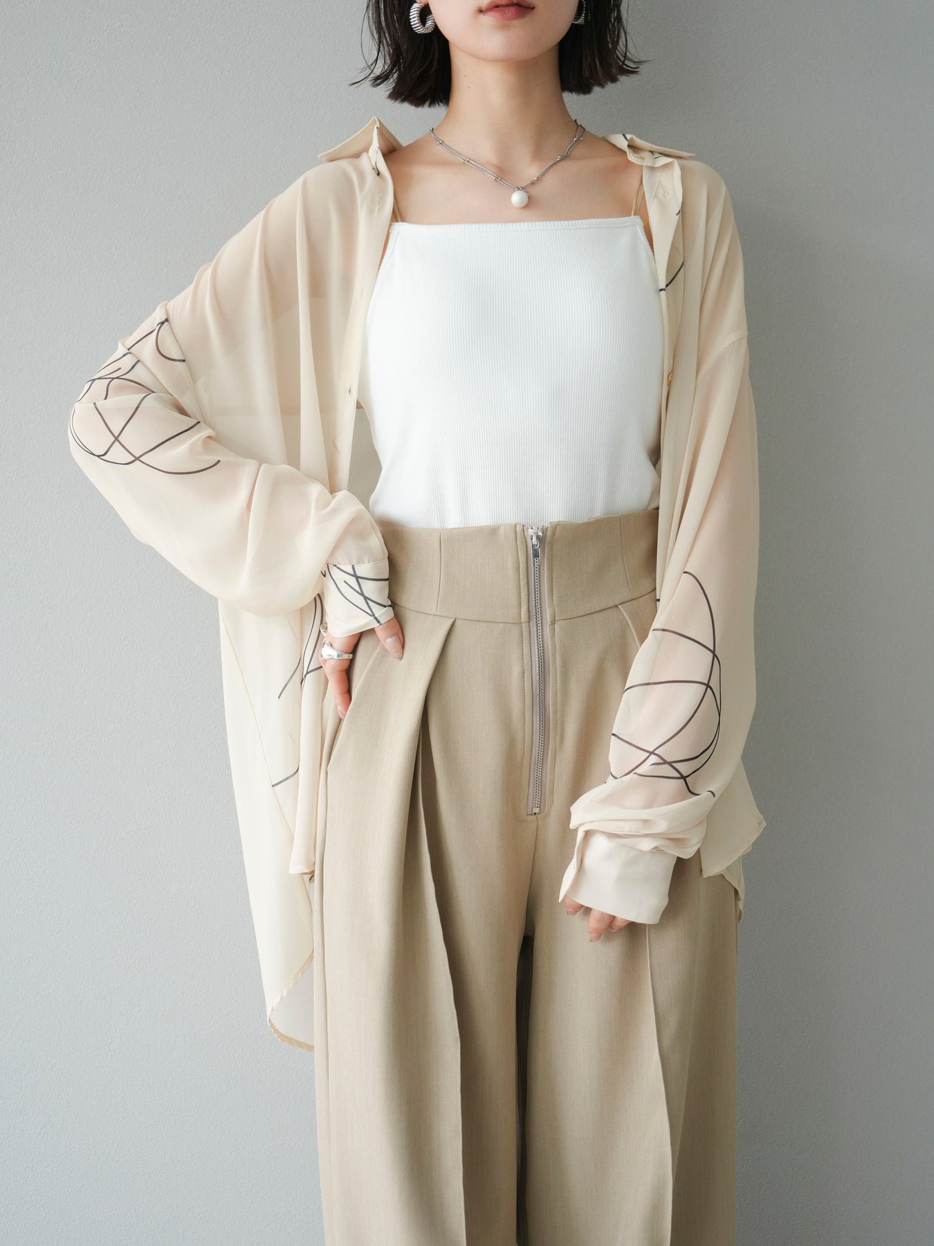 軽やかな透け感と柔らかいドレープが魅力の、ペンタッチラインがアクセントになったシフォンシャツ。落ち感のある素材が女性らしい印象を引き立てつつ、ゆったりとしたシルエットでこなれ感も演出してくれます。アシンメトリーな裾デザインが動きを加え、シンプルながらも洗練された印象に。ボタンを留めてトップス風に着ても、羽織としても着回せる万能アイテム。季節の変わり目や冷房対策にも重宝する一着です。 ※ボトムス、キャミソール(インナー)以外の商品は一律でインナーは付属していません。