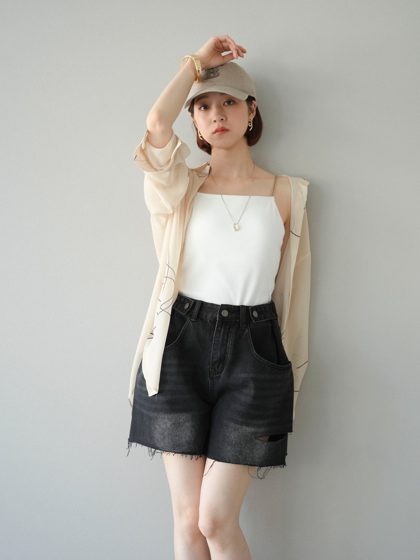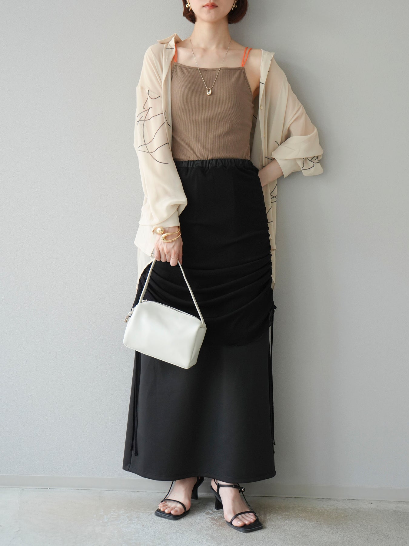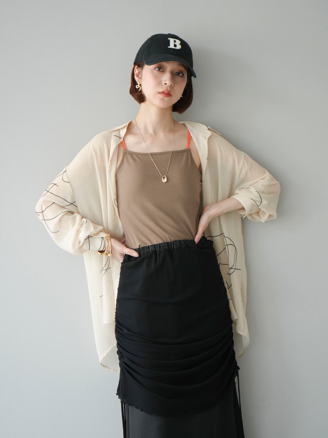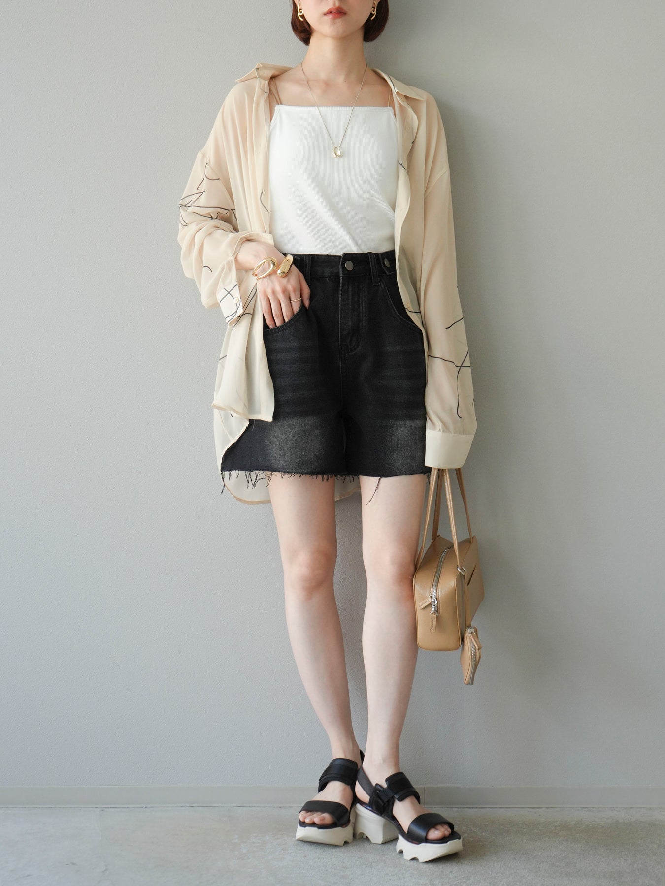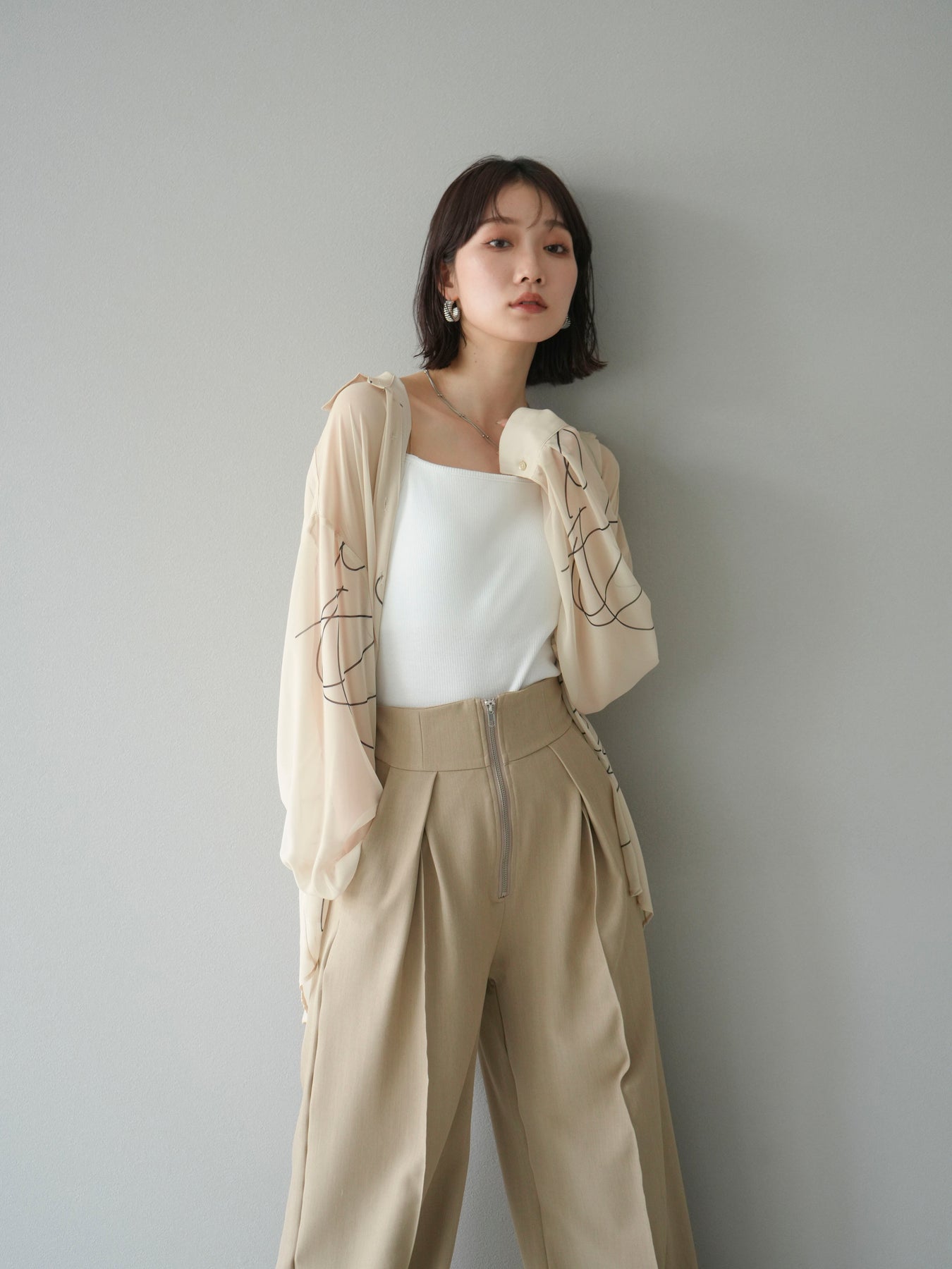 軽やかな透け感と柔らかいドレープが魅力の、ペンタッチラインがアクセントになったシフォンシャツ。落ち感のある素材が女性らしい印象を引き立てつつ、ゆったりとしたシルエットでこなれ感も演出してくれます。アシンメトリーな裾デザインが動きを加え、シンプルながらも洗練された印象に。ボタンを留めてトップス風に着ても、羽織としても着回せる万能アイテム。季節の変わり目や冷房対策にも重宝する一着です。 ※ボトムス、キャミソール(インナー)以外の商品は一律でインナーは付属していません。