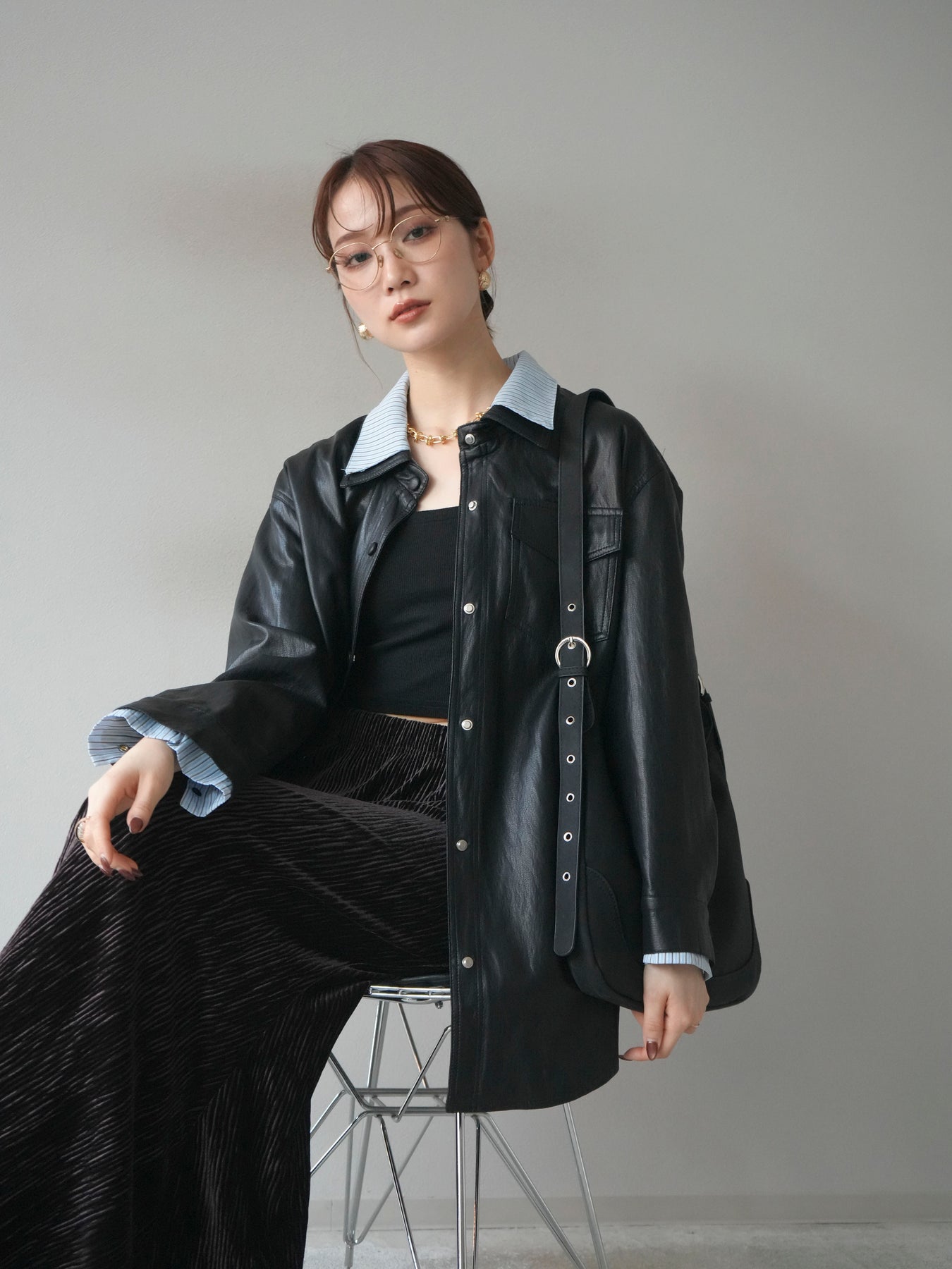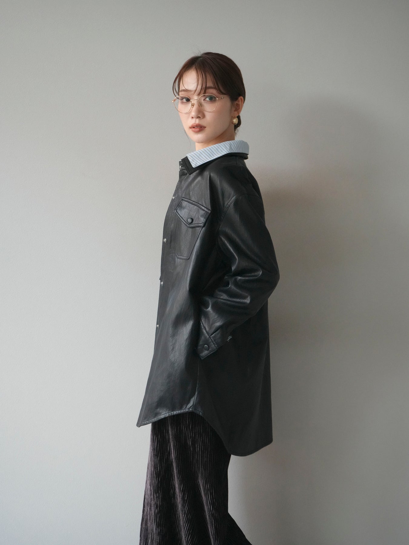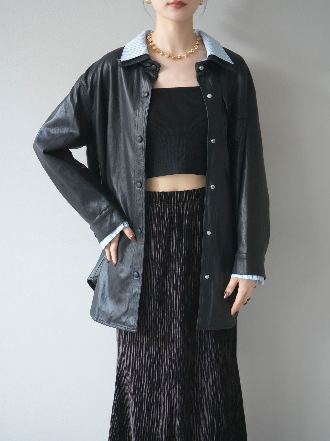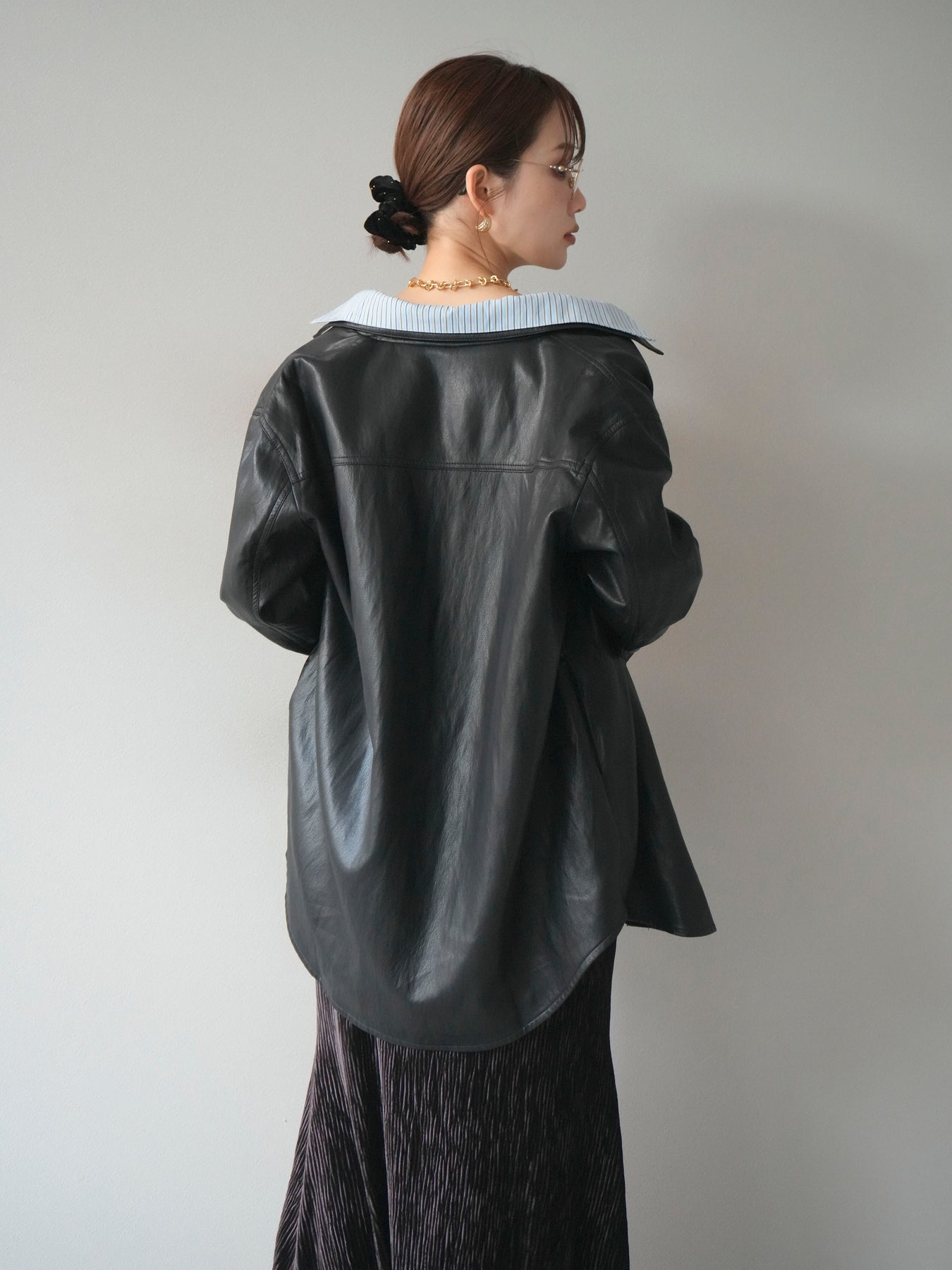 [予約]シャツレイヤードデザインレザージャケット/black
