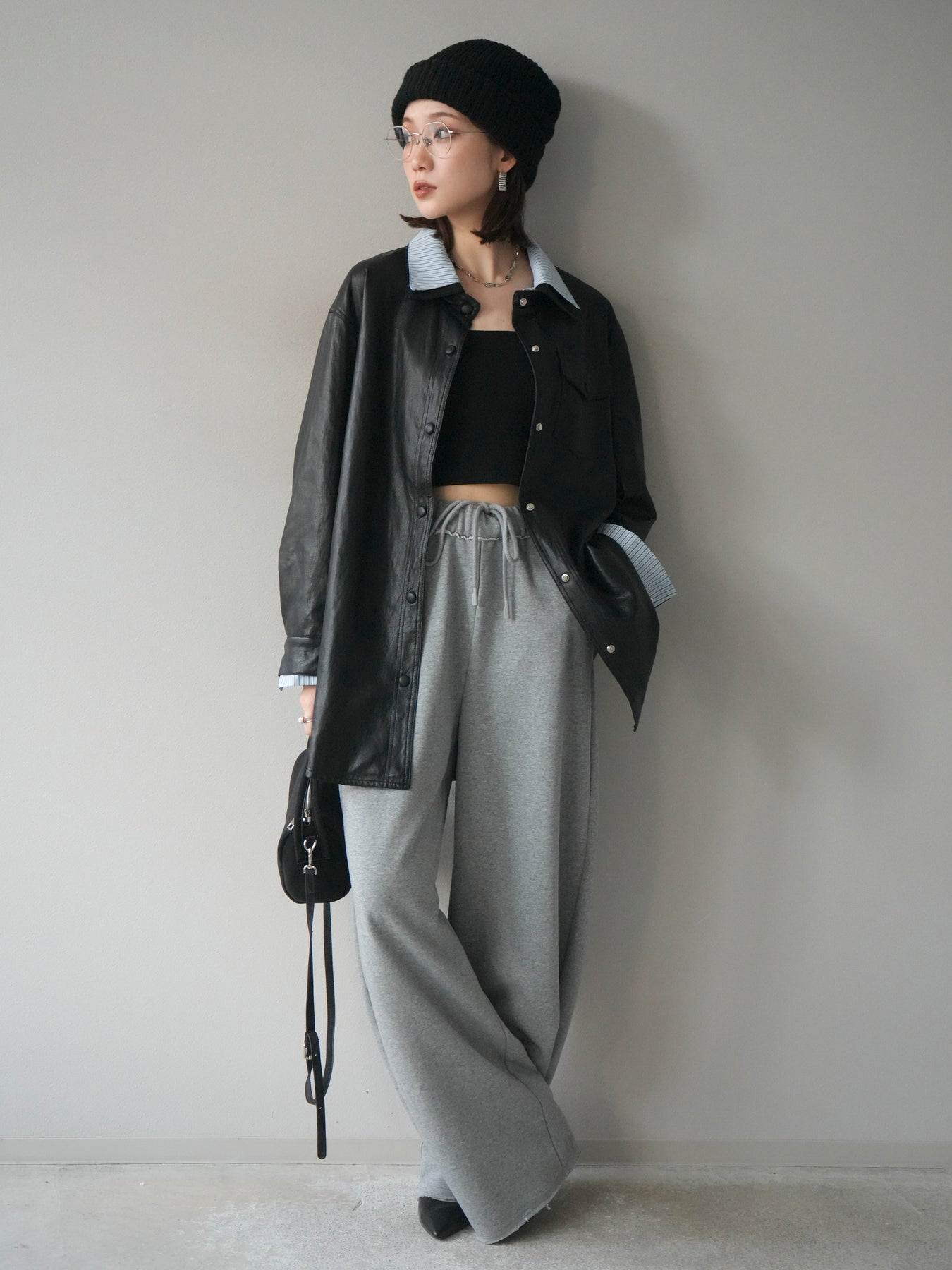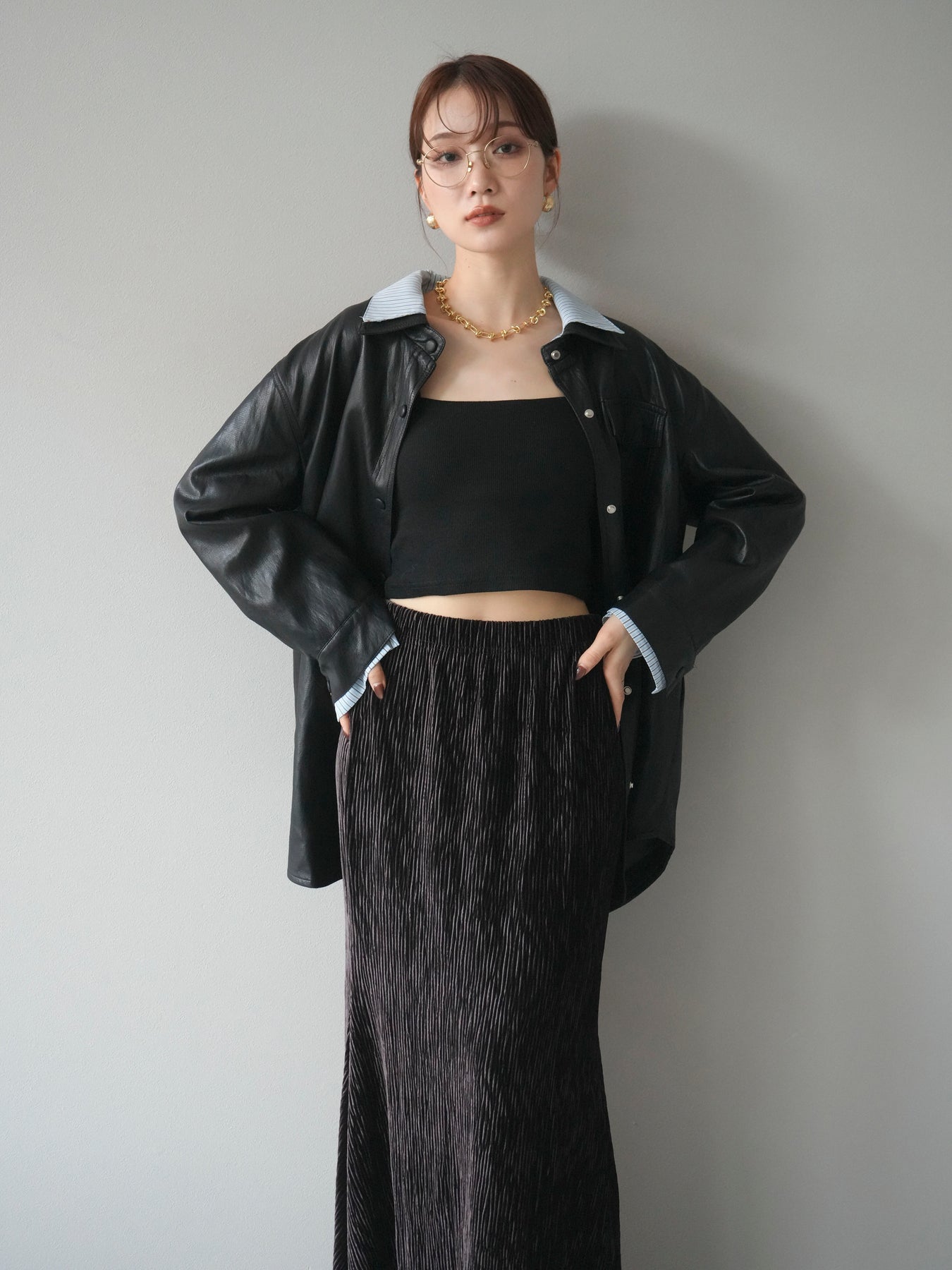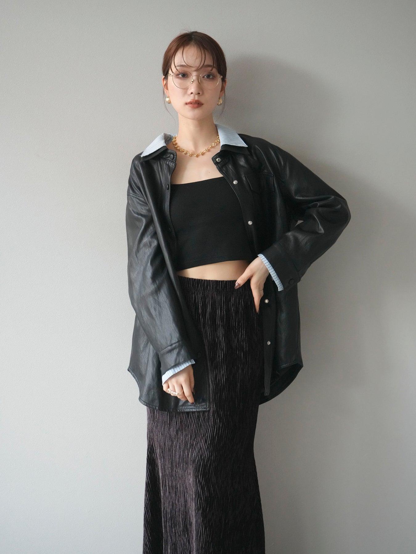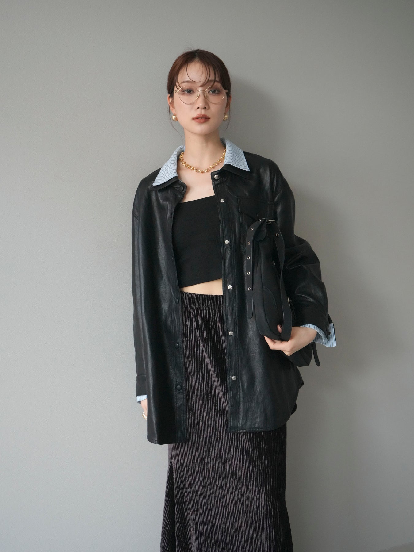 [予約]シャツレイヤードデザインレザージャケット/black