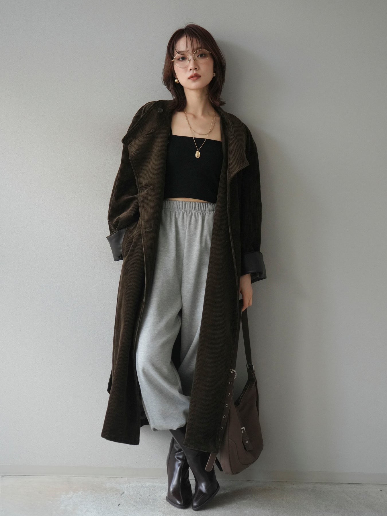 クラシカルな雰囲気漂うコーデュロイ素材に、レザーの折り返しデザインをプラスしたロングコート。 異素材の組み合わせが奥行きを生み出し、上品ながらもモードな印象に仕上げています。 立体的なスタンドネックとボタンディテールがアクセントとなり、羽織るだけで洗練されたスタイルが完成。 付属のレザーベルトでウエストマークすれば、シルエットにメリハリをつけることも可能です。 シーズンライクな素材感と存在感のあるデザインで、冬のコーディネートを格上げしてくれる一着です。 ※ボトムス、キャミソール(インナー)以外の商品は一律でインナーは付属していません。