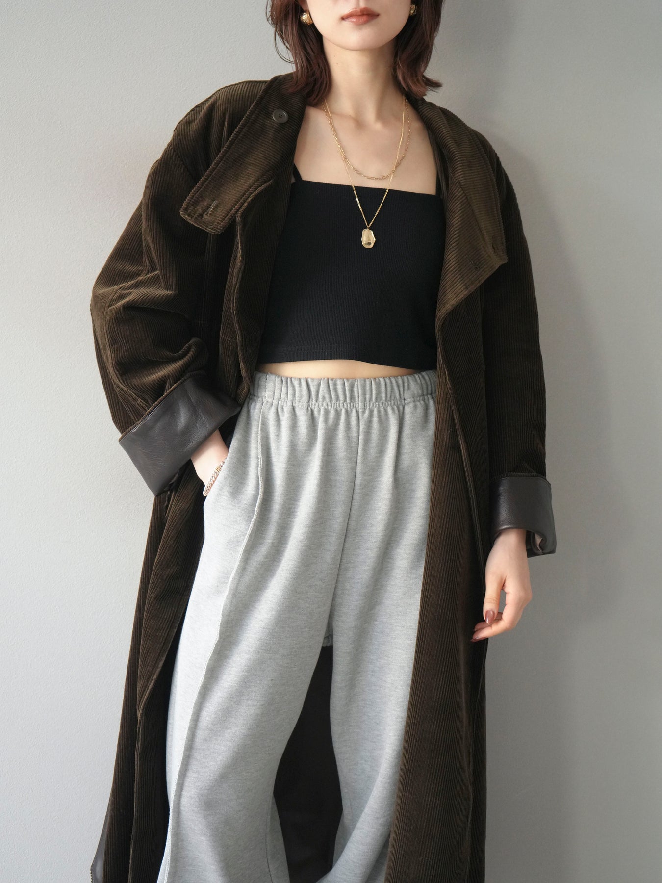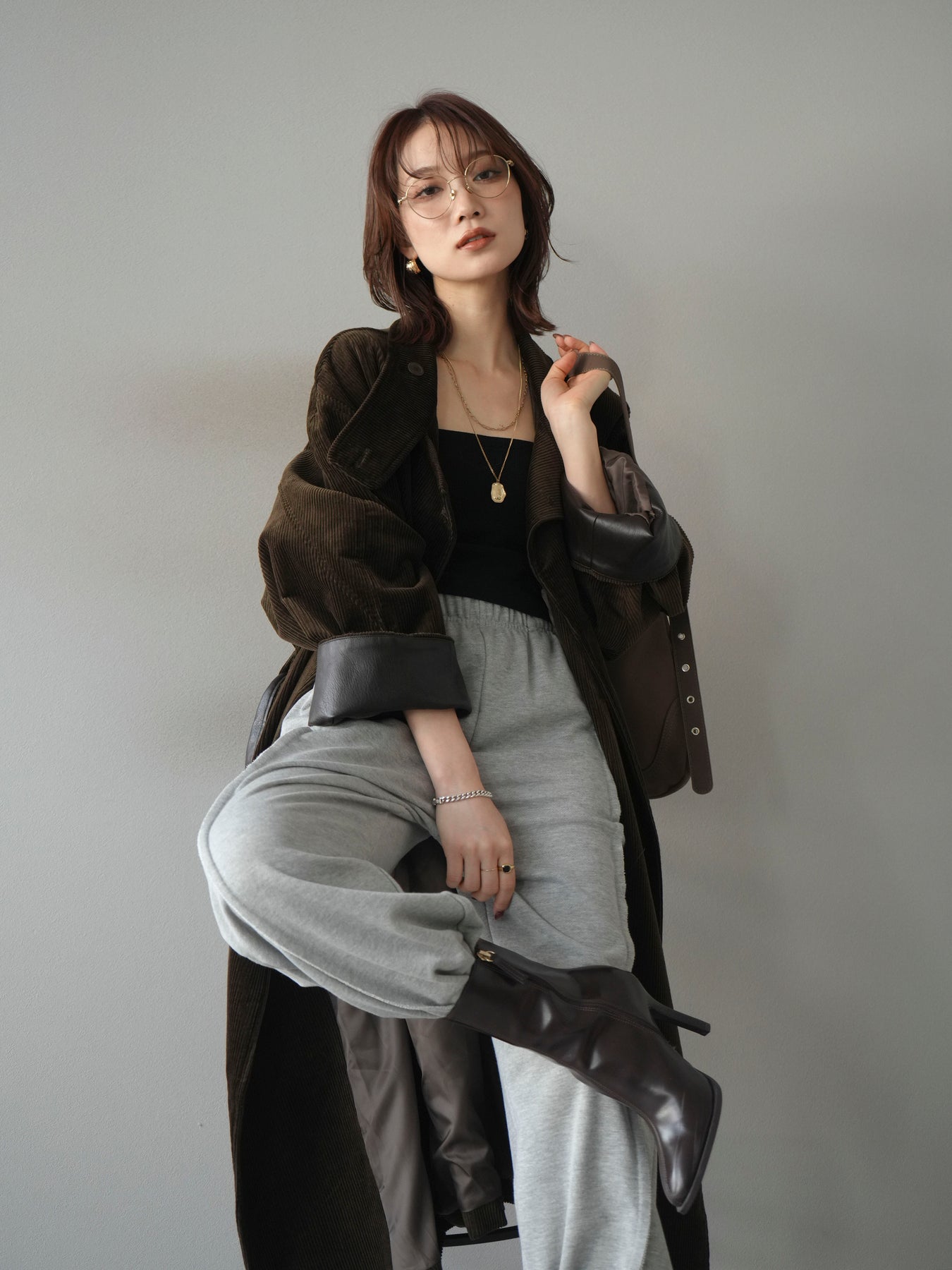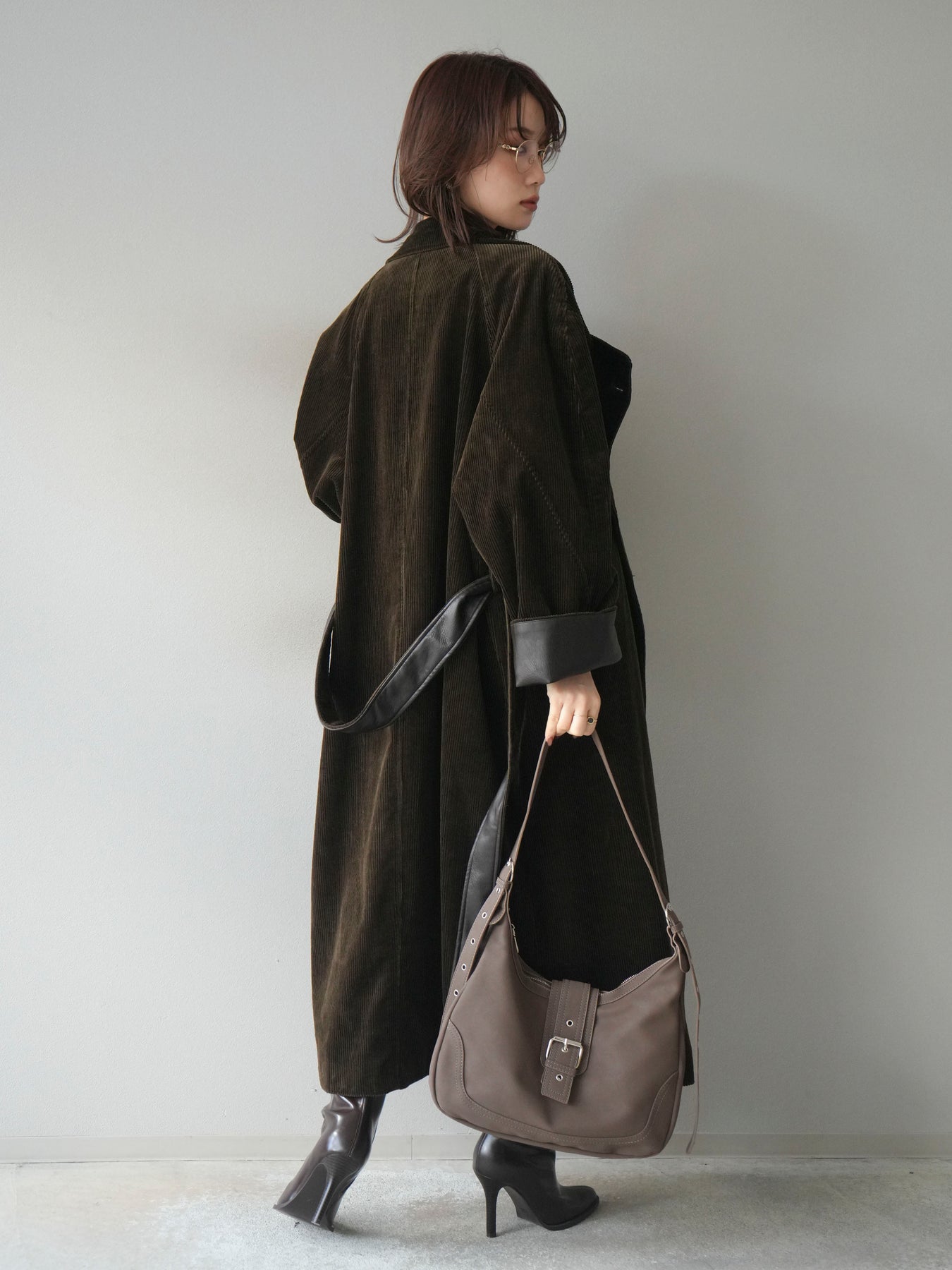 [予約]コーデュロイ折り返しレザーロングコート/khaki