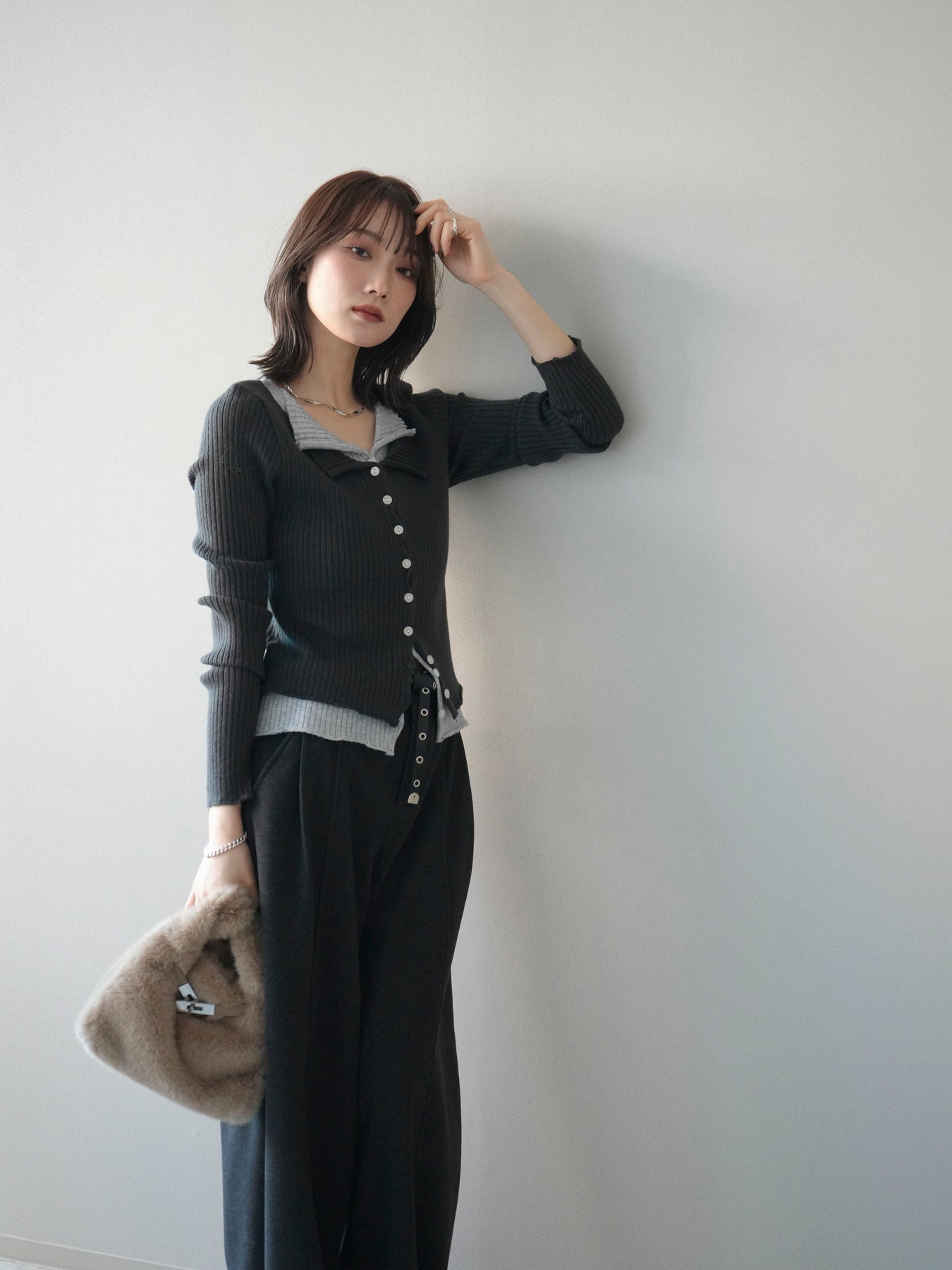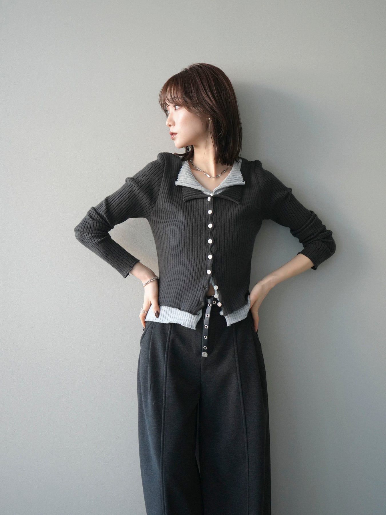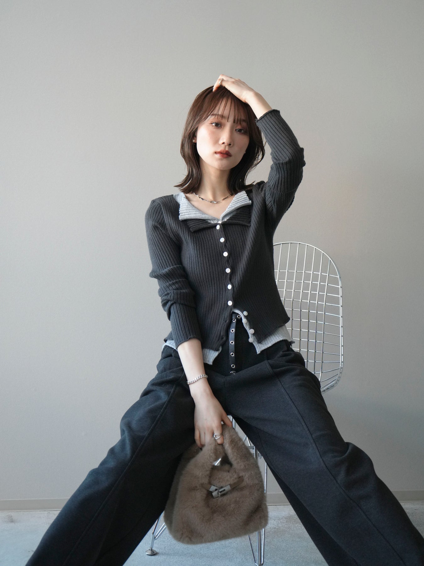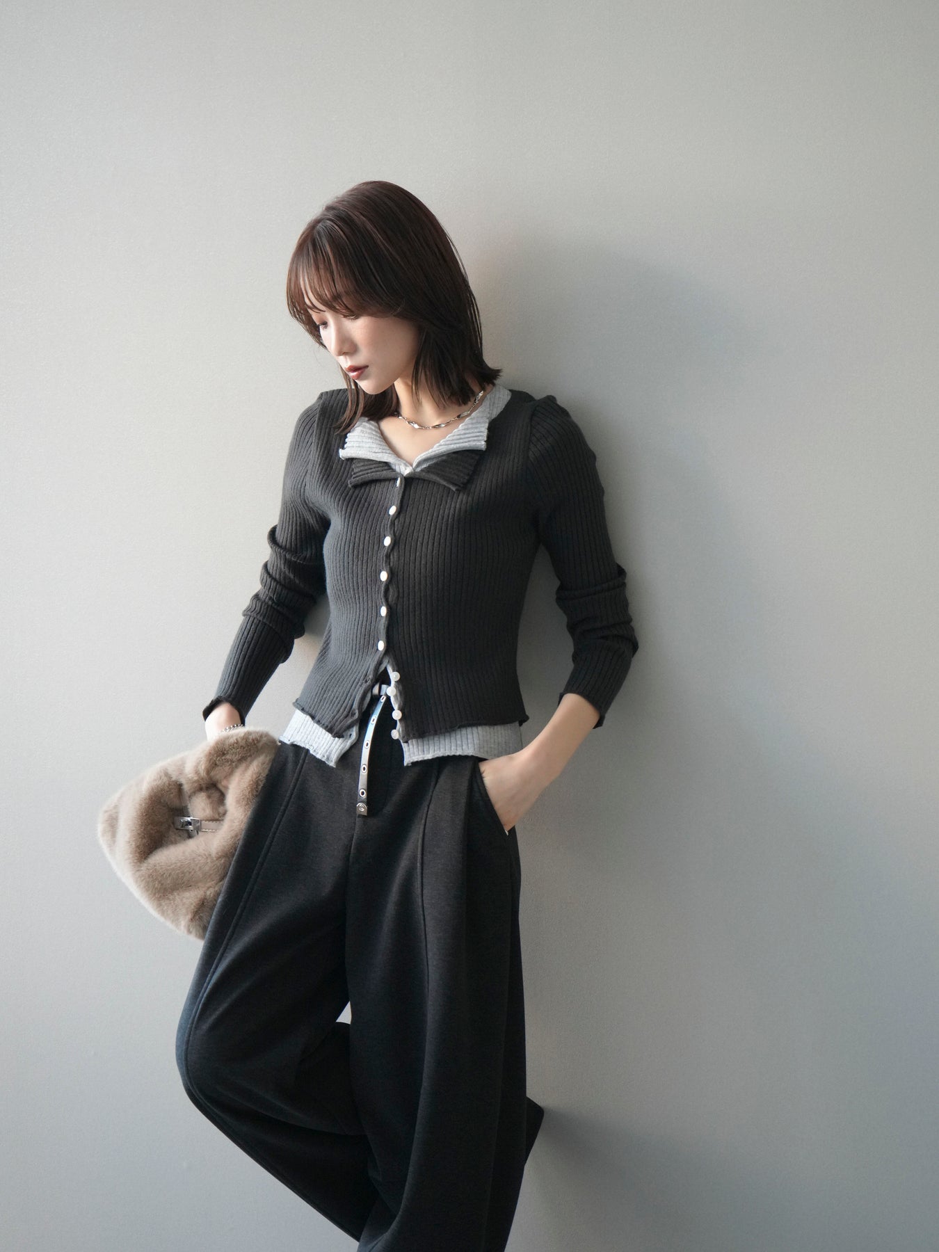 [予約]配色レイヤードリブニットカーディガン/charcoal