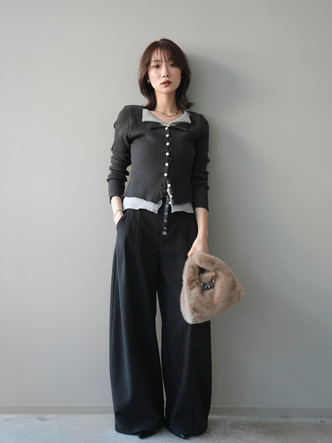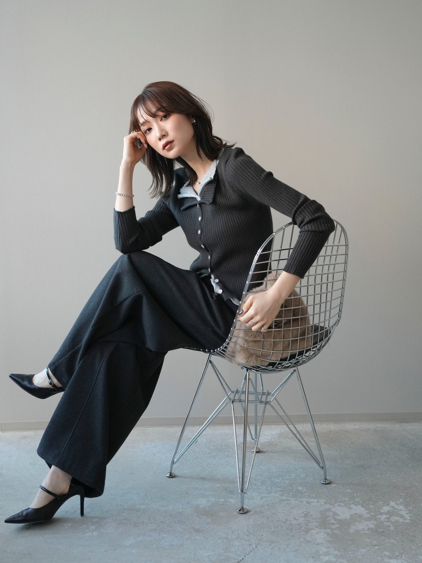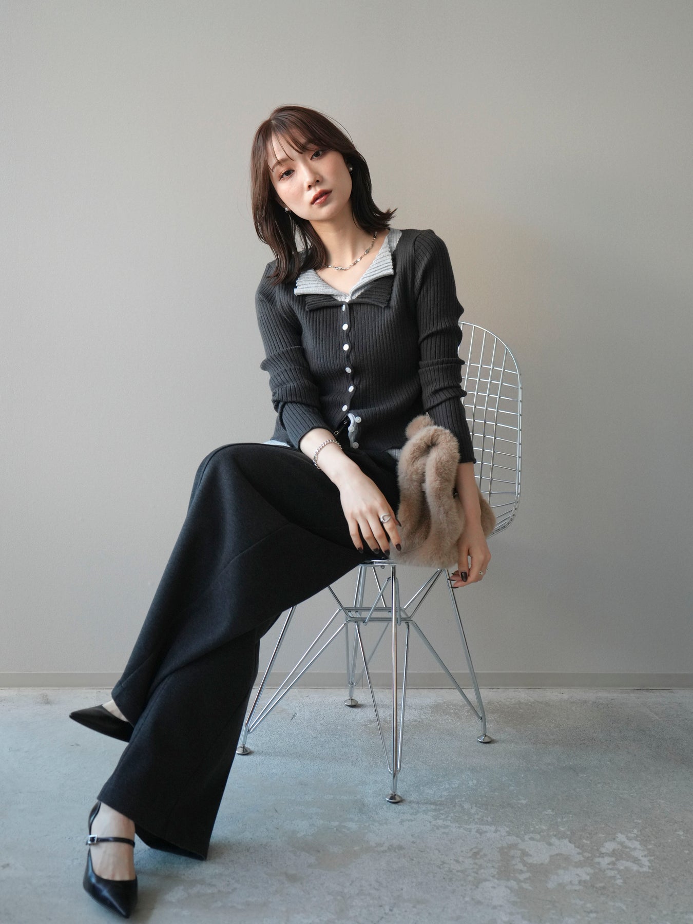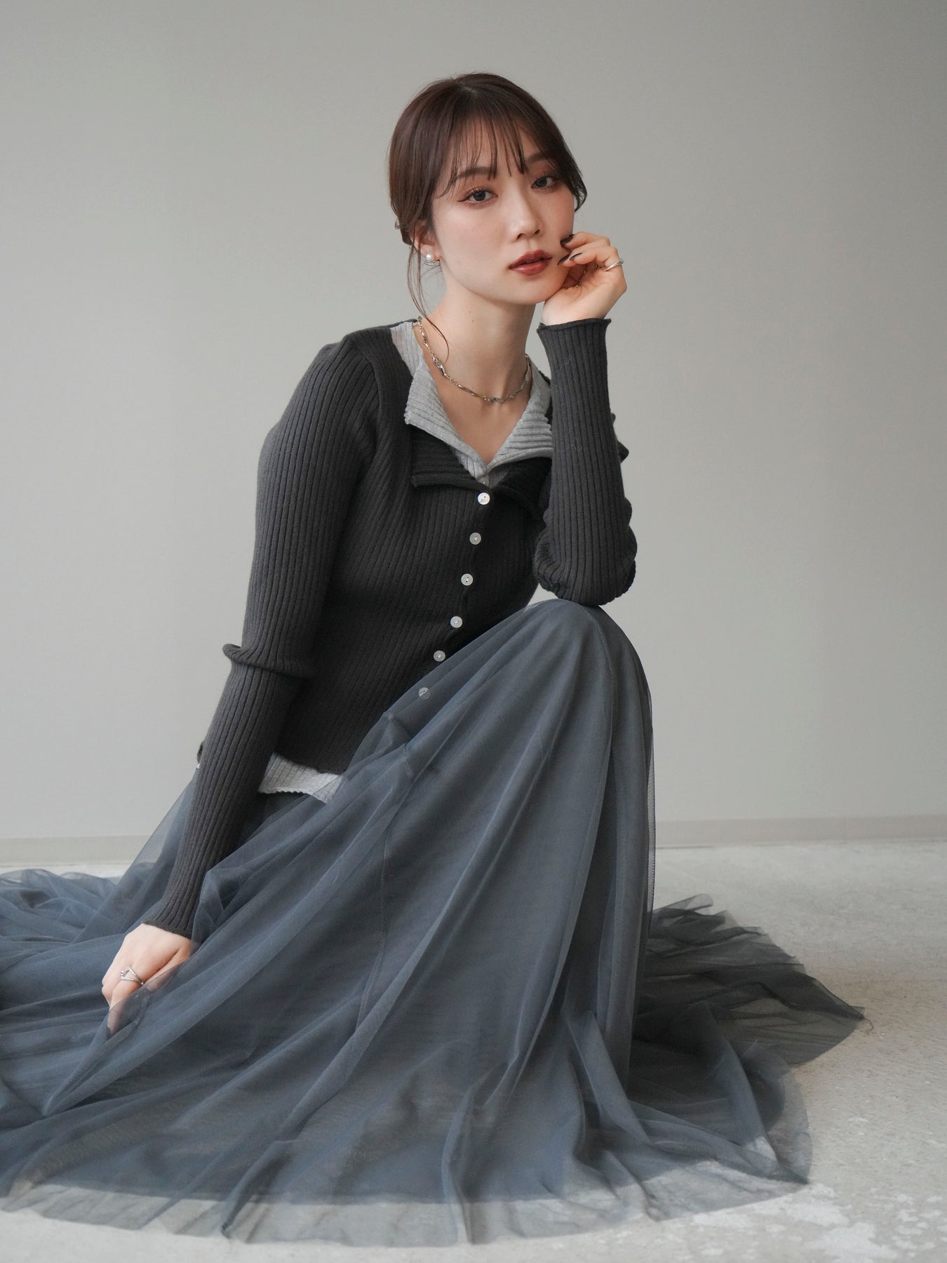 [予約]配色レイヤードリブニットカーディガン/charcoal