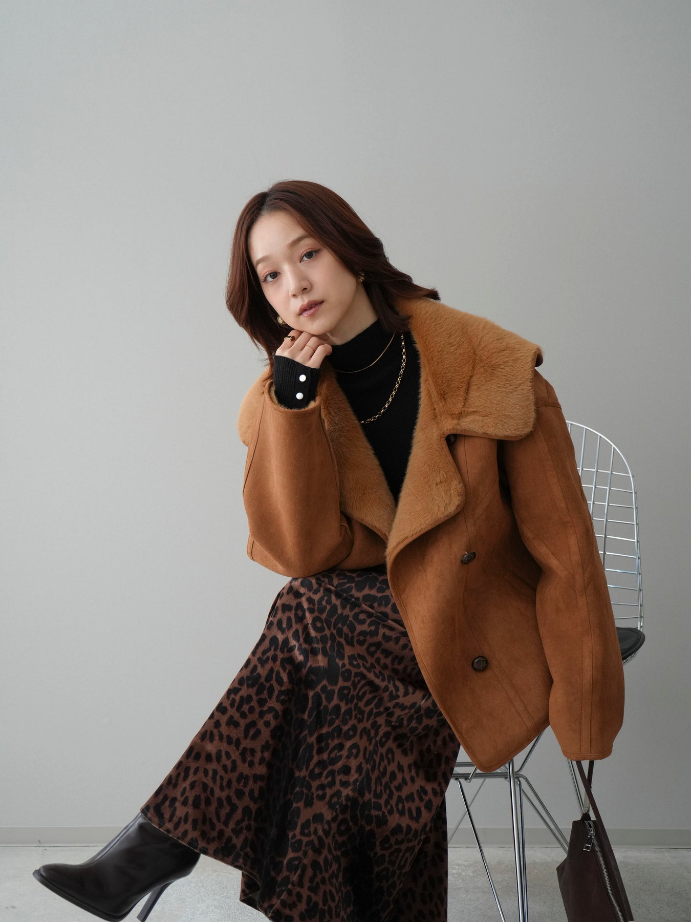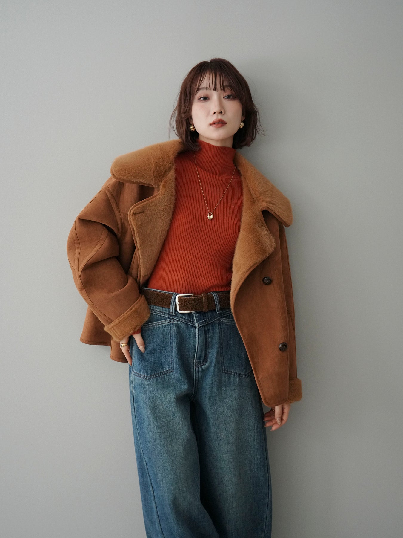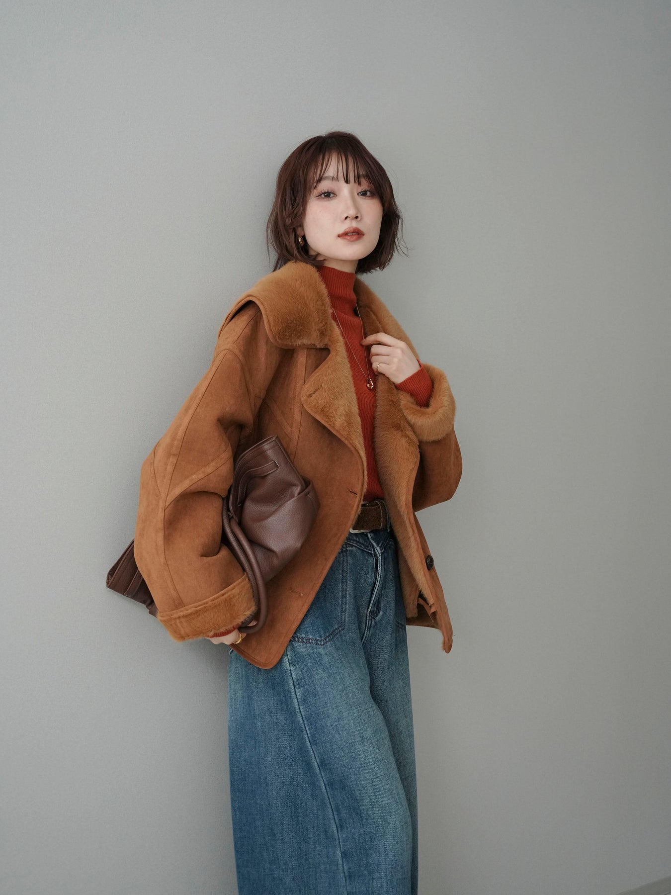 ムートン調素材を使用したショート丈ジャケット。ボリュームのある襟デザインが顔まわりに存在感を与えつつ、バランスの取りやすい丈感でスタイリングをすっきりとまとめます。羽織るだけで季節感のあるコーディネートが完成する一着です。