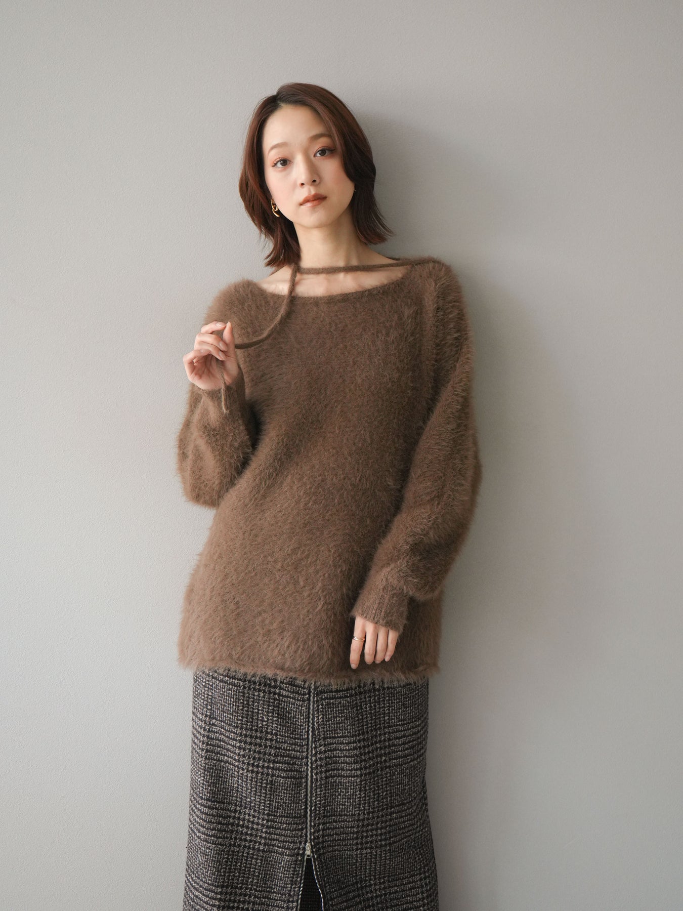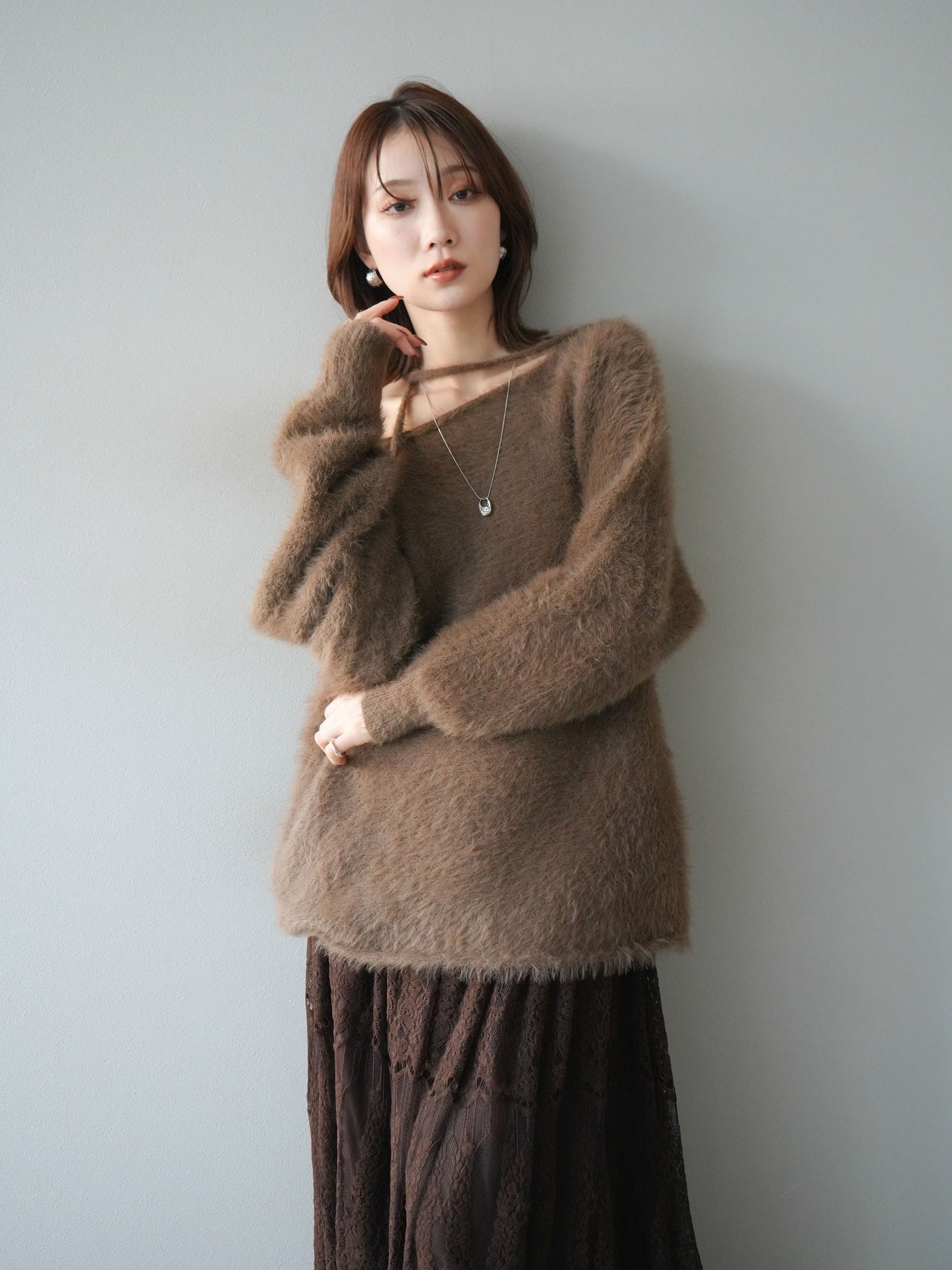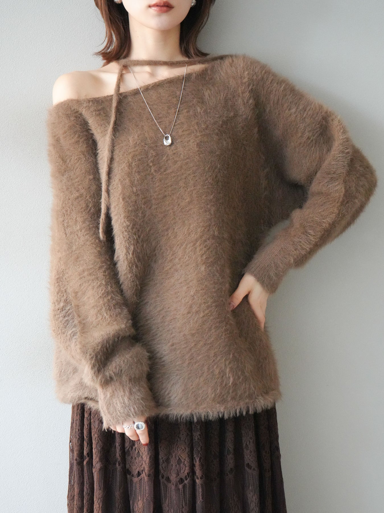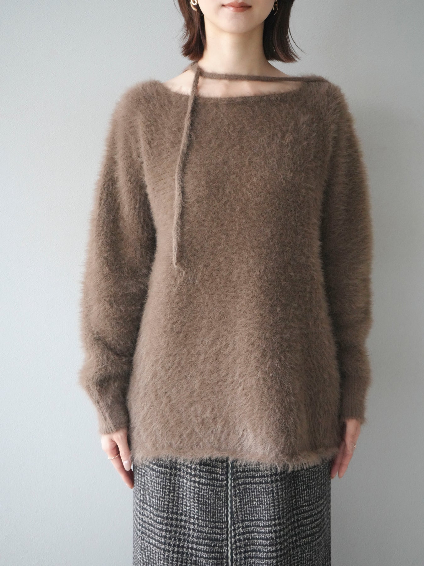 ふわふわとしたシャギー素材が魅力のニットプルオーバー。 柔らかく肌触りの良い風合いで、着るだけでシーズンムードを高めてくれます。 首元には華奢な紐ディテールをあしらい、さりげないポイントに。 ゆったりとしたシルエットが抜け感を演出し、パンツにもスカートにも合わせやすい万能な一枚です。 シンプルながらも存在感のある素材感で、1枚で主役になるアイテムです。 ※ボトムス、キャミソール(インナー)以外の商品は一律でインナーは付属していません。