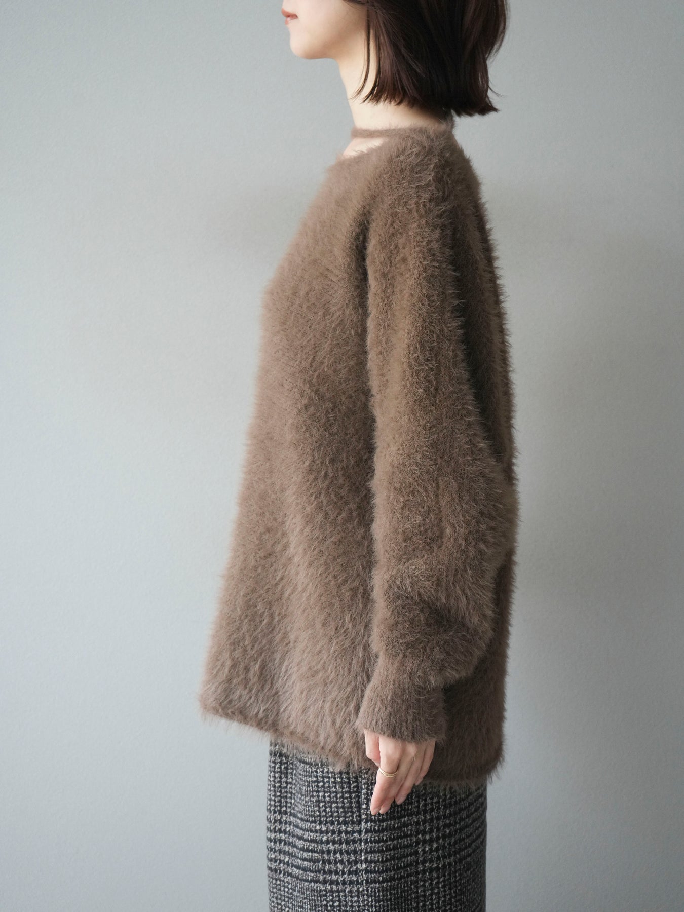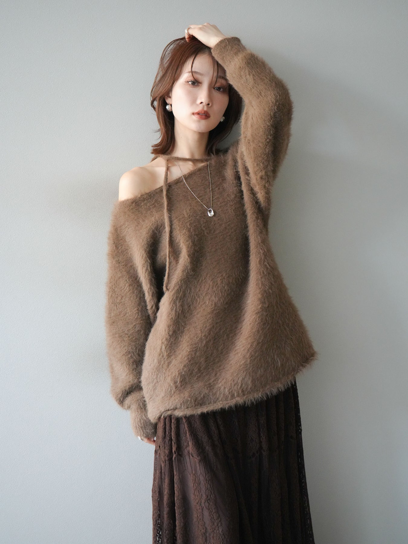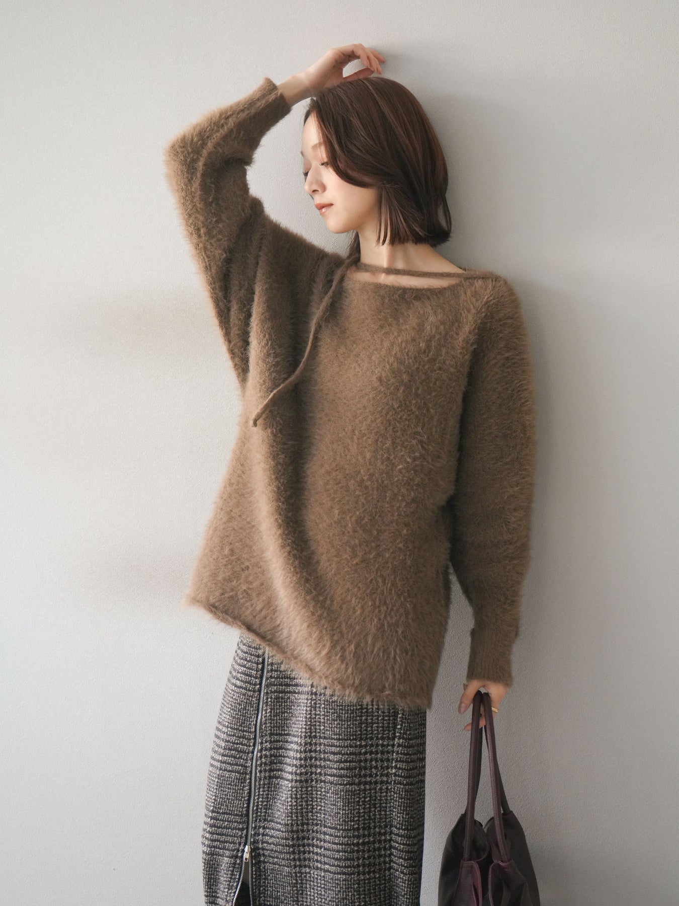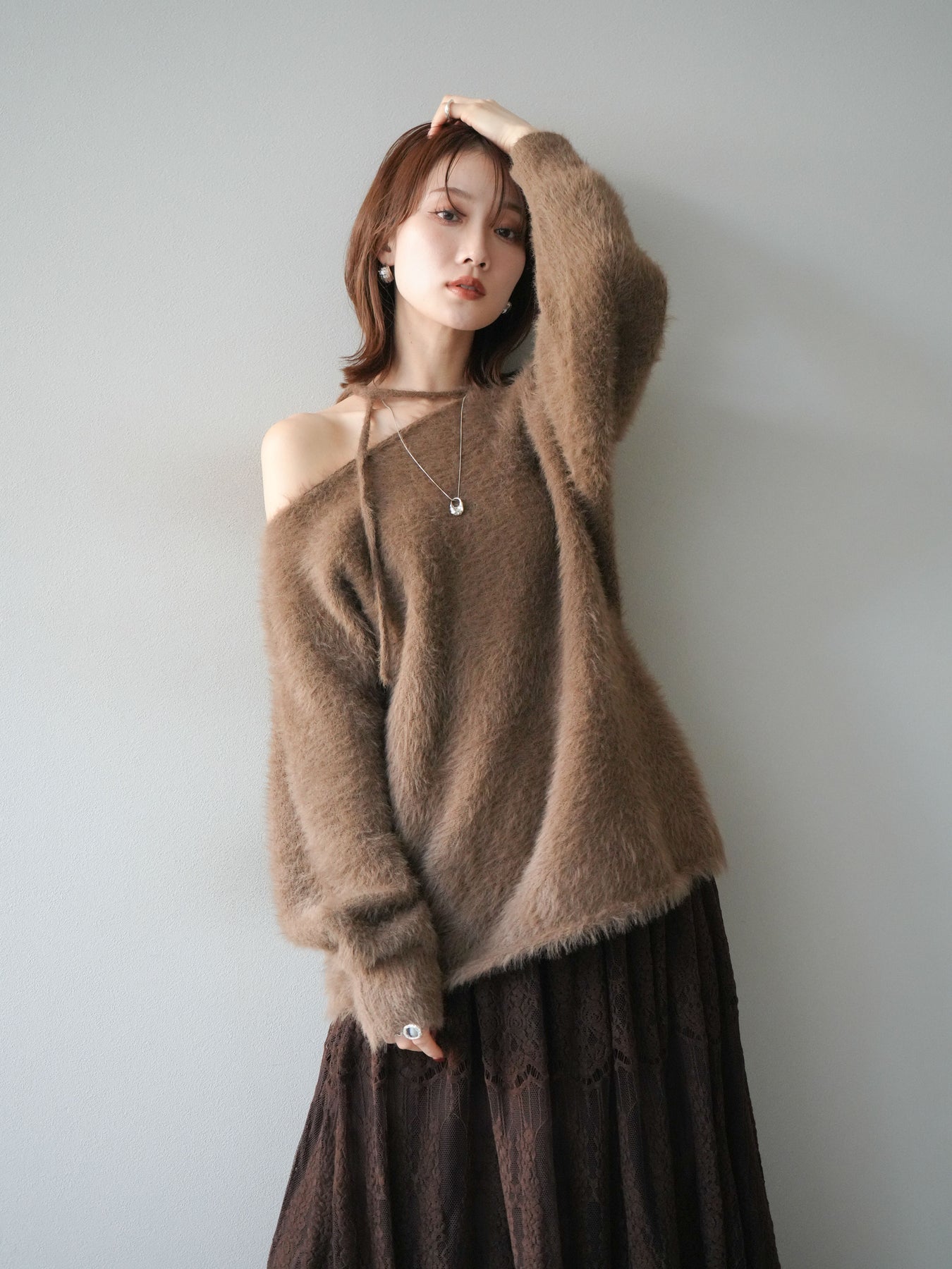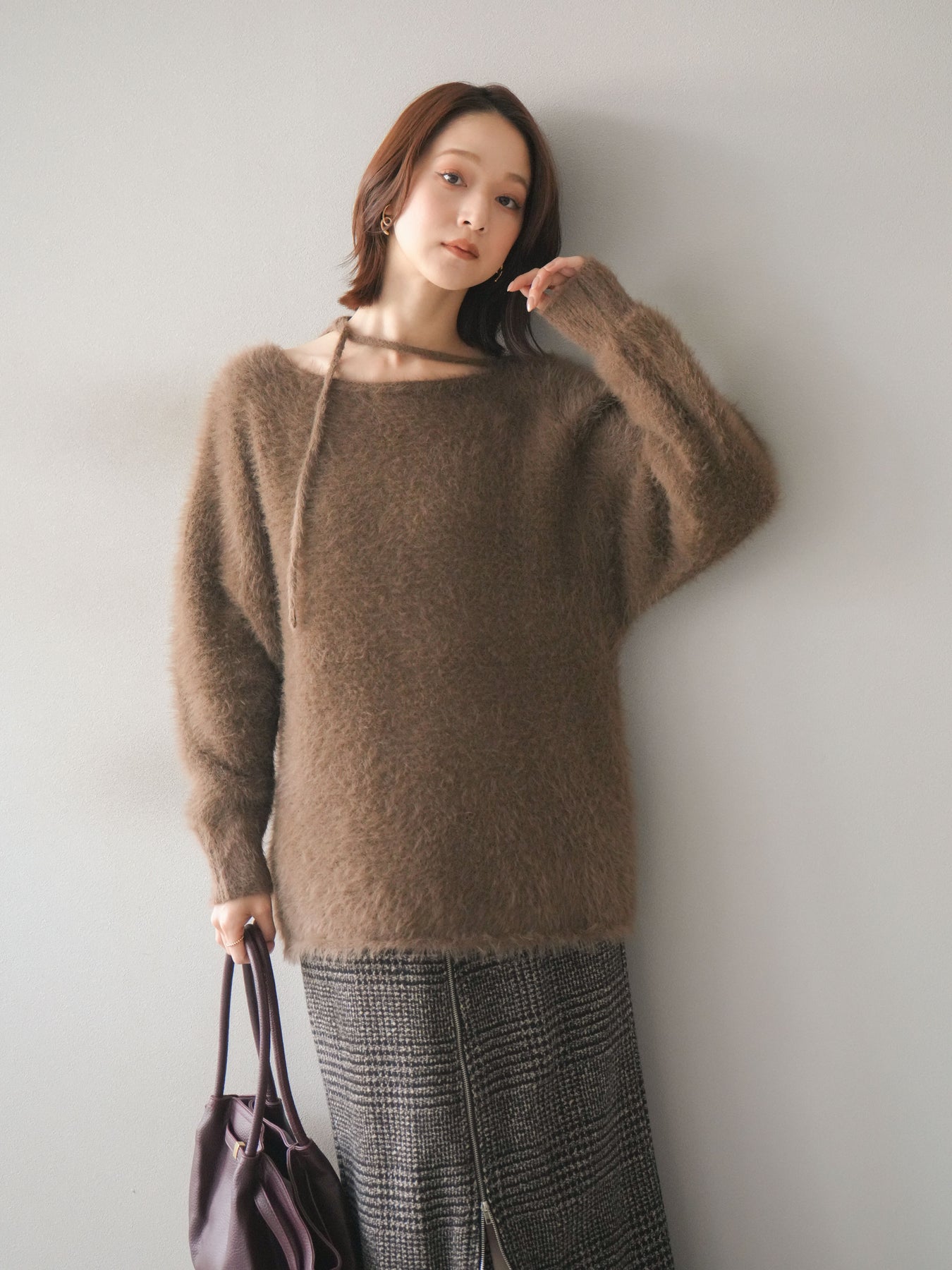 ふわふわとしたシャギー素材が魅力のニットプルオーバー。 柔らかく肌触りの良い風合いで、着るだけでシーズンムードを高めてくれます。 首元には華奢な紐ディテールをあしらい、さりげないポイントに。 ゆったりとしたシルエットが抜け感を演出し、パンツにもスカートにも合わせやすい万能な一枚です。 シンプルながらも存在感のある素材感で、1枚で主役になるアイテムです。 ※ボトムス、キャミソール(インナー)以外の商品は一律でインナーは付属していません。