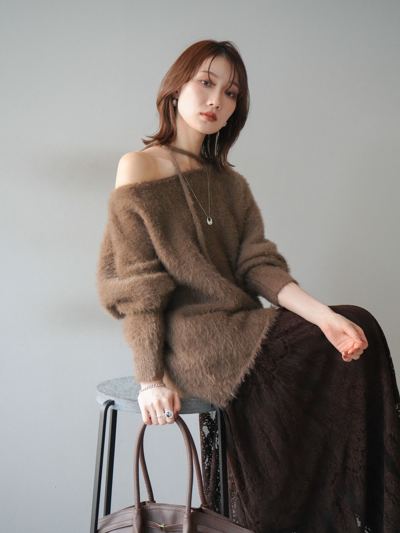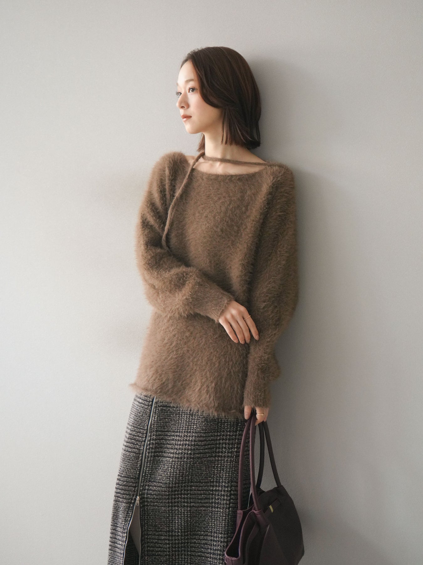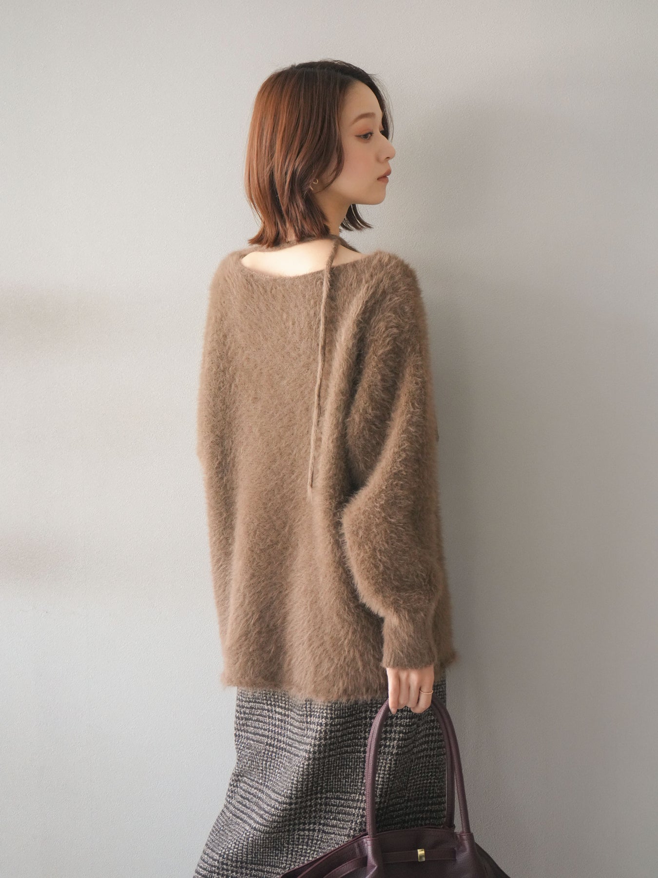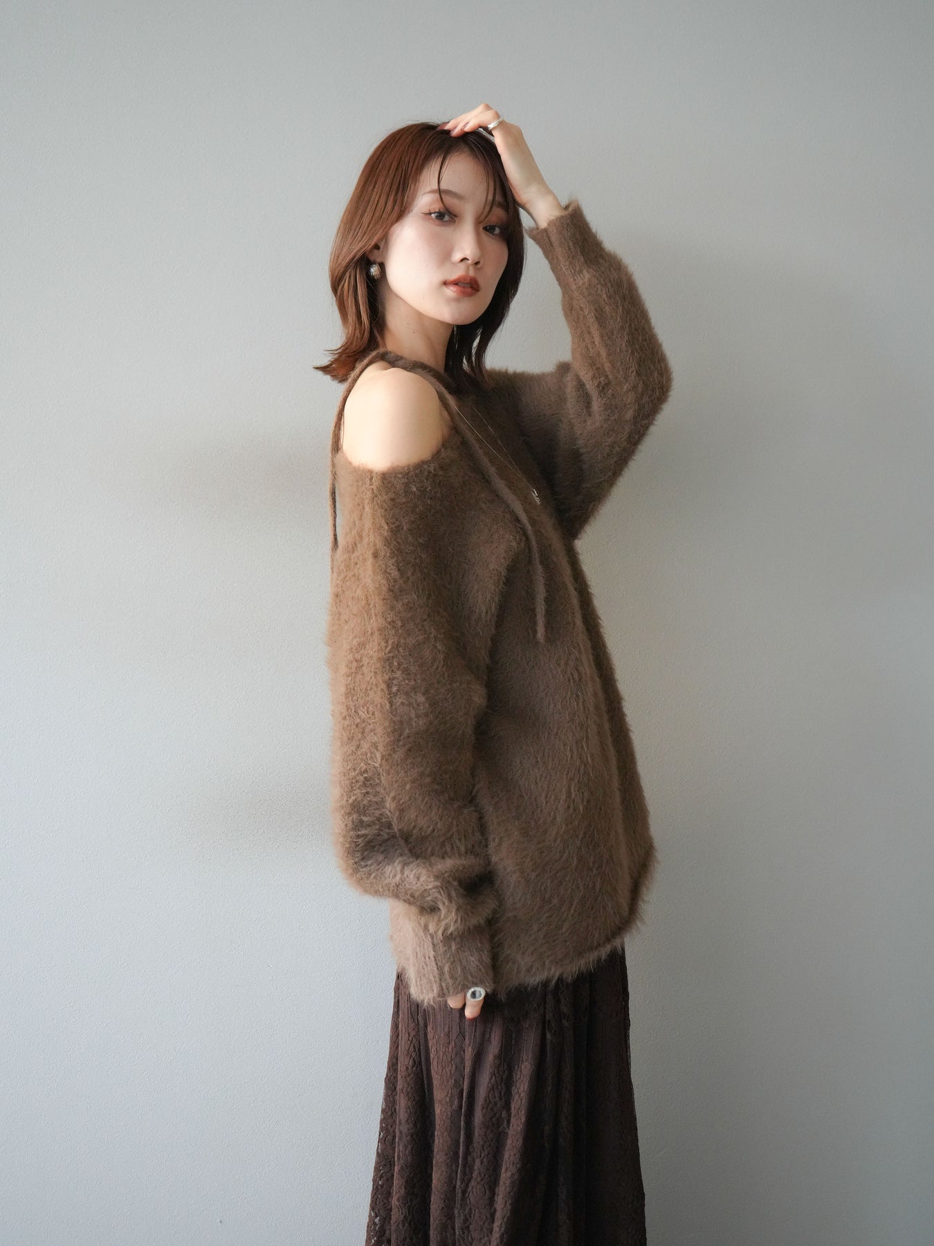 ふわふわとしたシャギー素材が魅力のニットプルオーバー。 柔らかく肌触りの良い風合いで、着るだけでシーズンムードを高めてくれます。 首元には華奢な紐ディテールをあしらい、さりげないポイントに。 ゆったりとしたシルエットが抜け感を演出し、パンツにもスカートにも合わせやすい万能な一枚です。 シンプルながらも存在感のある素材感で、1枚で主役になるアイテムです。 ※ボトムス、キャミソール(インナー)以外の商品は一律でインナーは付属していません。