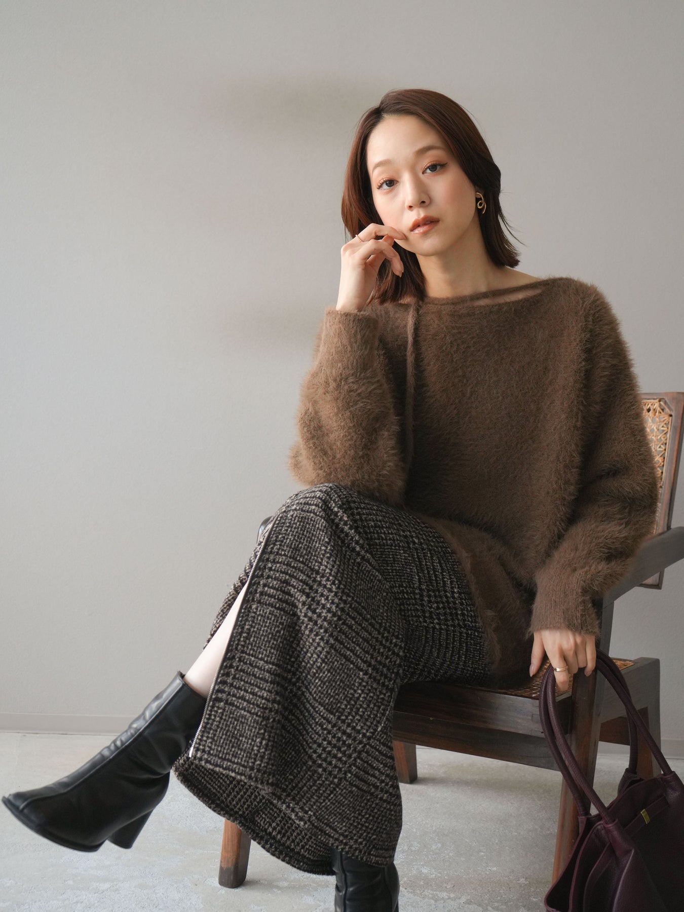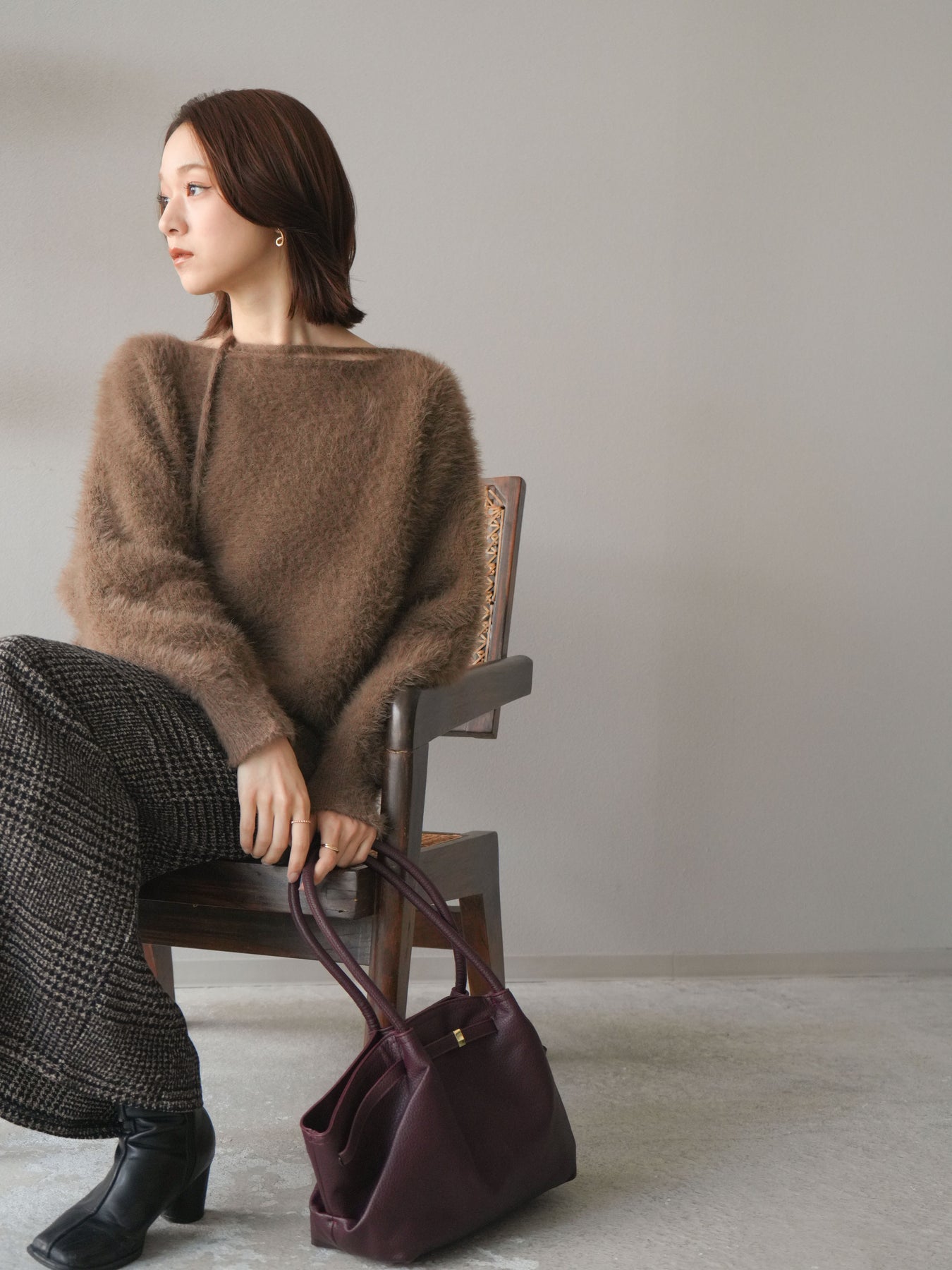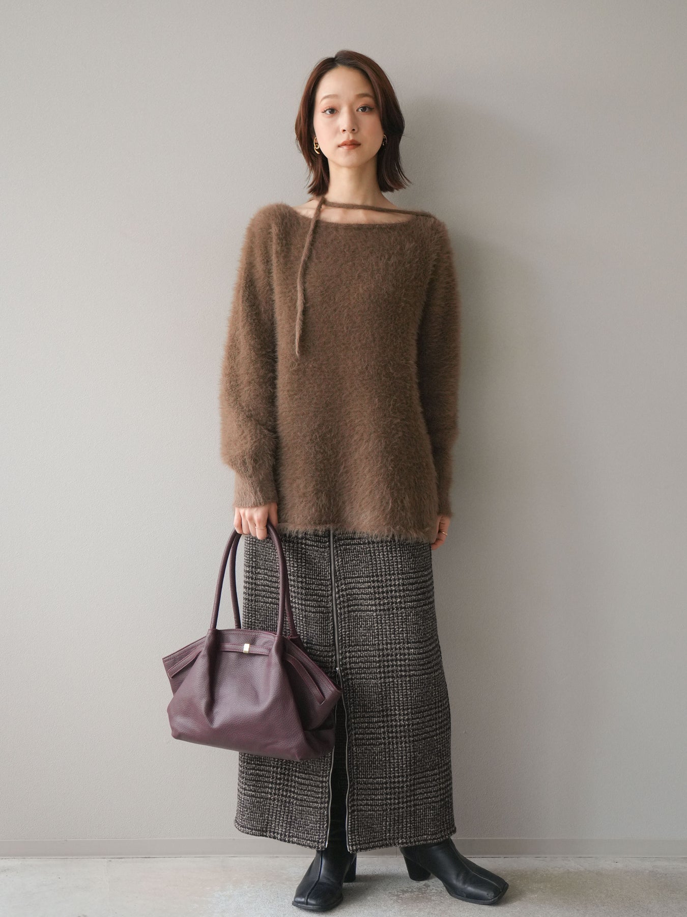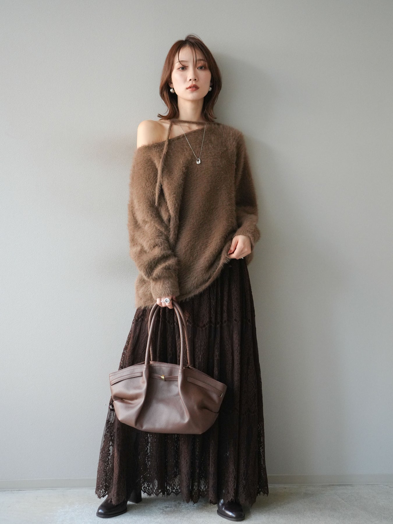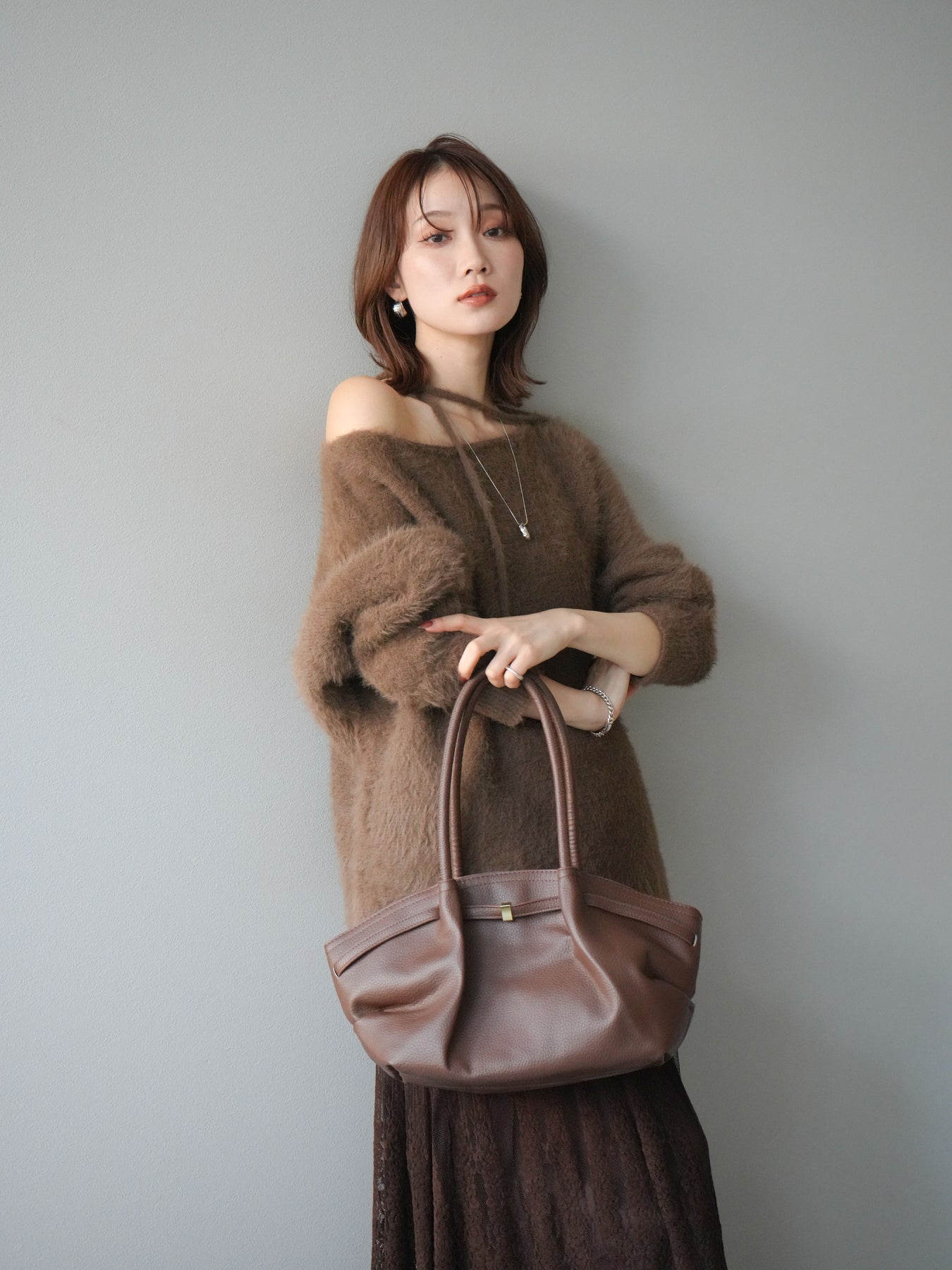 ふわふわとしたシャギー素材が魅力のニットプルオーバー。 柔らかく肌触りの良い風合いで、着るだけでシーズンムードを高めてくれます。 首元には華奢な紐ディテールをあしらい、さりげないポイントに。 ゆったりとしたシルエットが抜け感を演出し、パンツにもスカートにも合わせやすい万能な一枚です。 シンプルながらも存在感のある素材感で、1枚で主役になるアイテムです。 ※ボトムス、キャミソール(インナー)以外の商品は一律でインナーは付属していません。