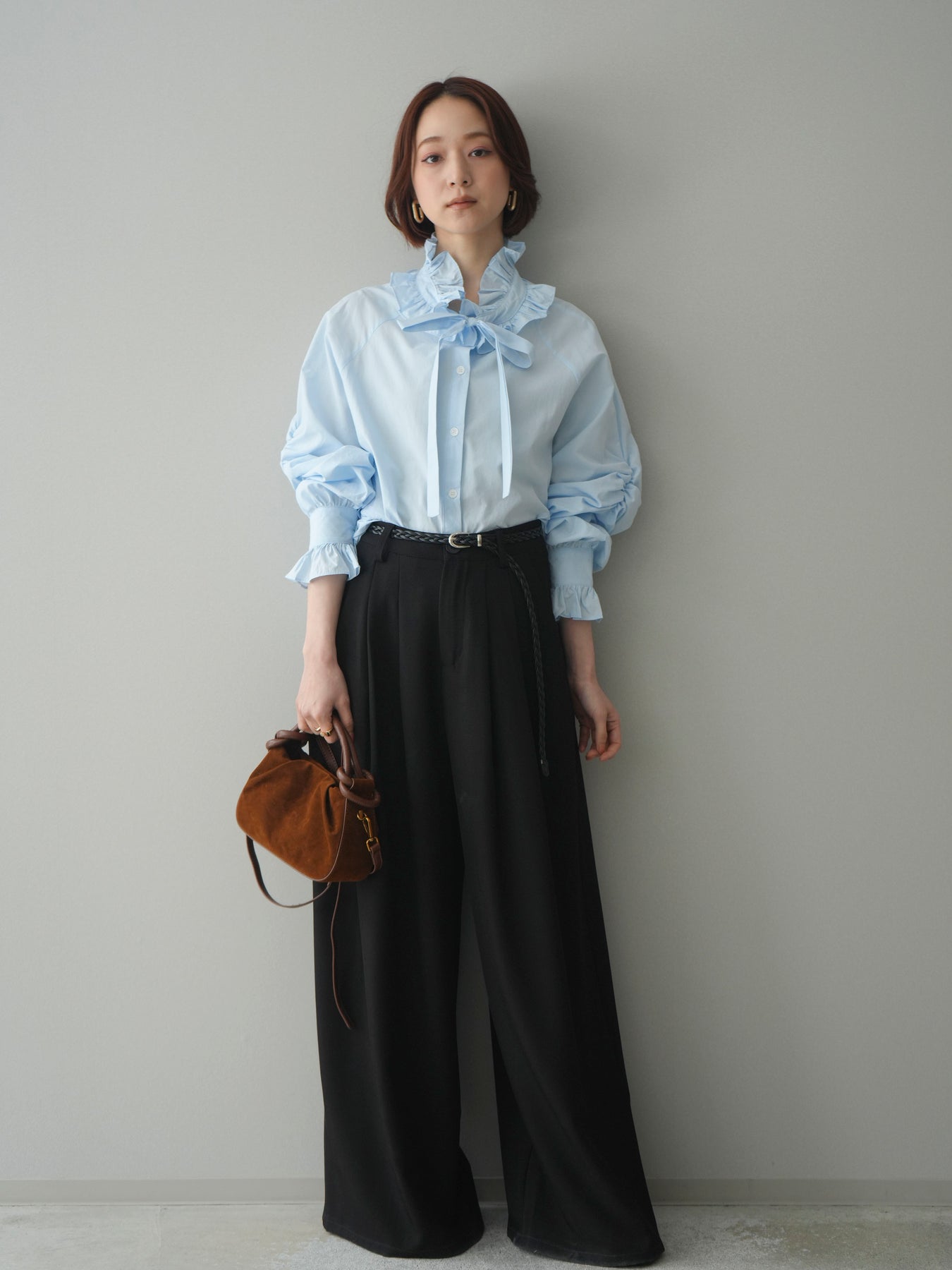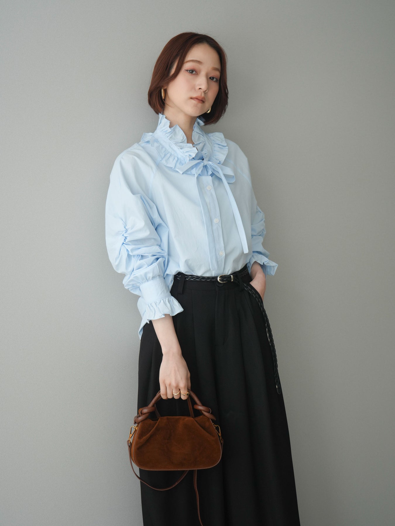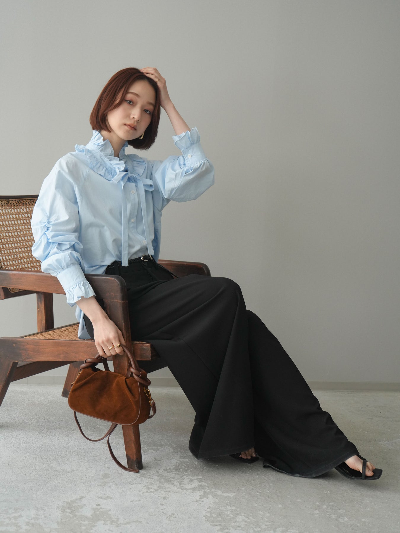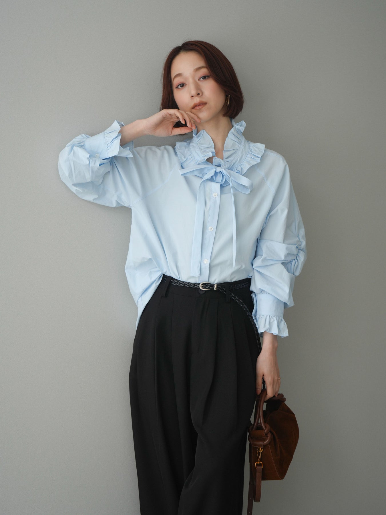 顔まわりを華やかに演出するフリルデザインが印象的なブラウス。ネックラインのギャザーとリボンディテールが柔らかな立体感を生み、上品さの中にさりげない甘さをプラスします。袖にもシャーリングを施し、程よいボリューム感で一枚でも存在感のある仕上がりに。パンツにもスカートにも合わせやすく、オンオフ問わず活躍する着映えアイテムです。 ※ボトムス、キャミソール(インナー)以外の商品は一律でインナーは付属していません