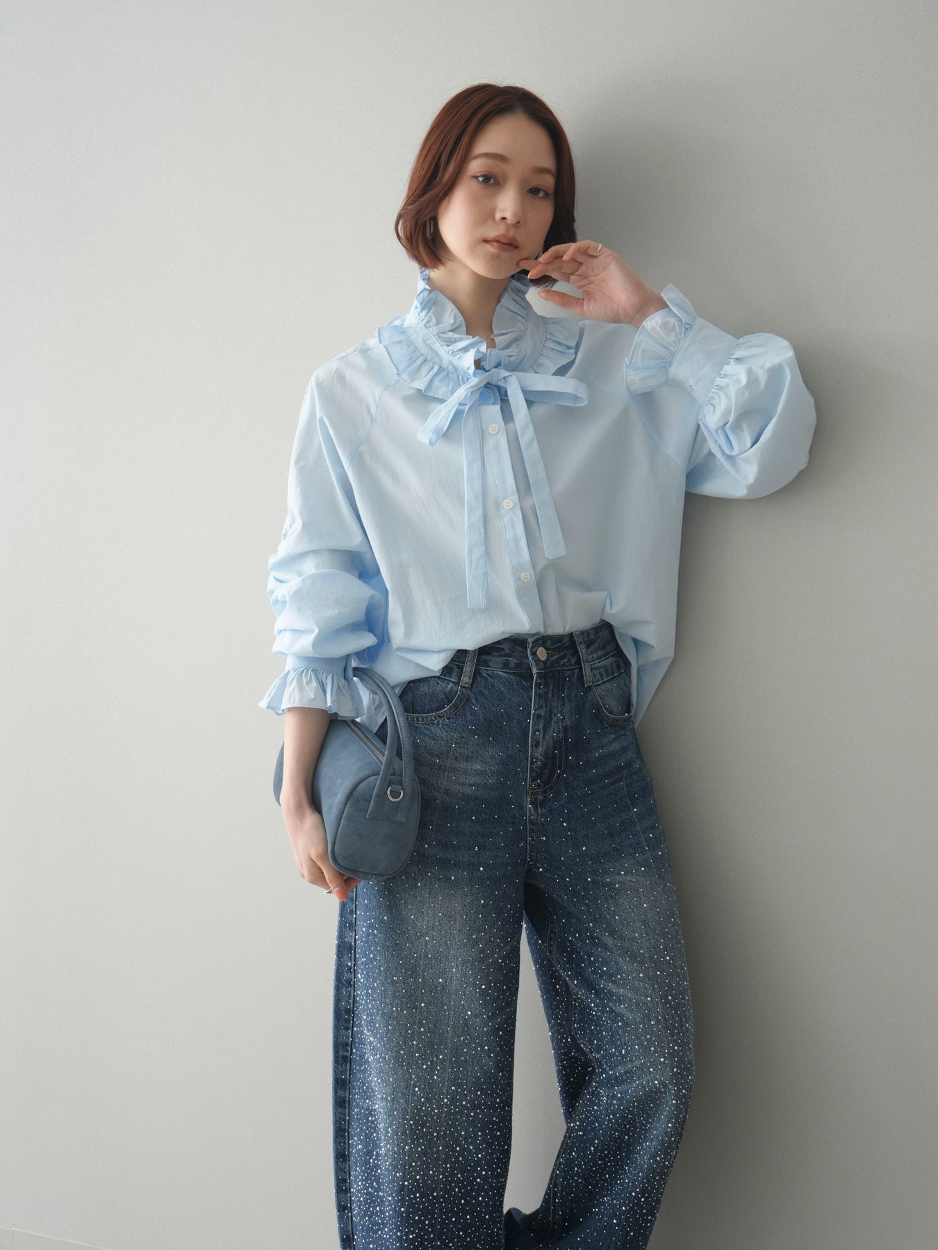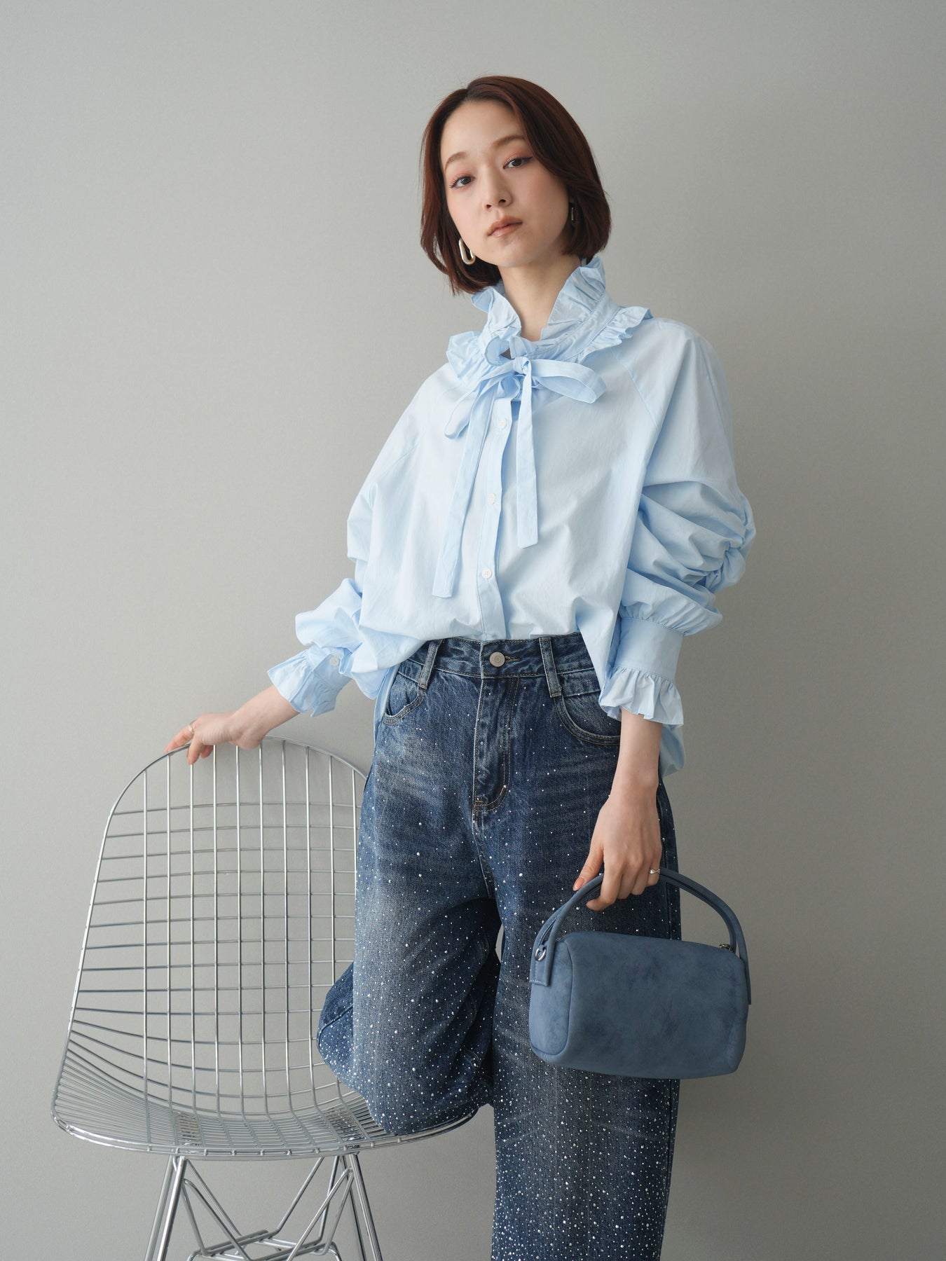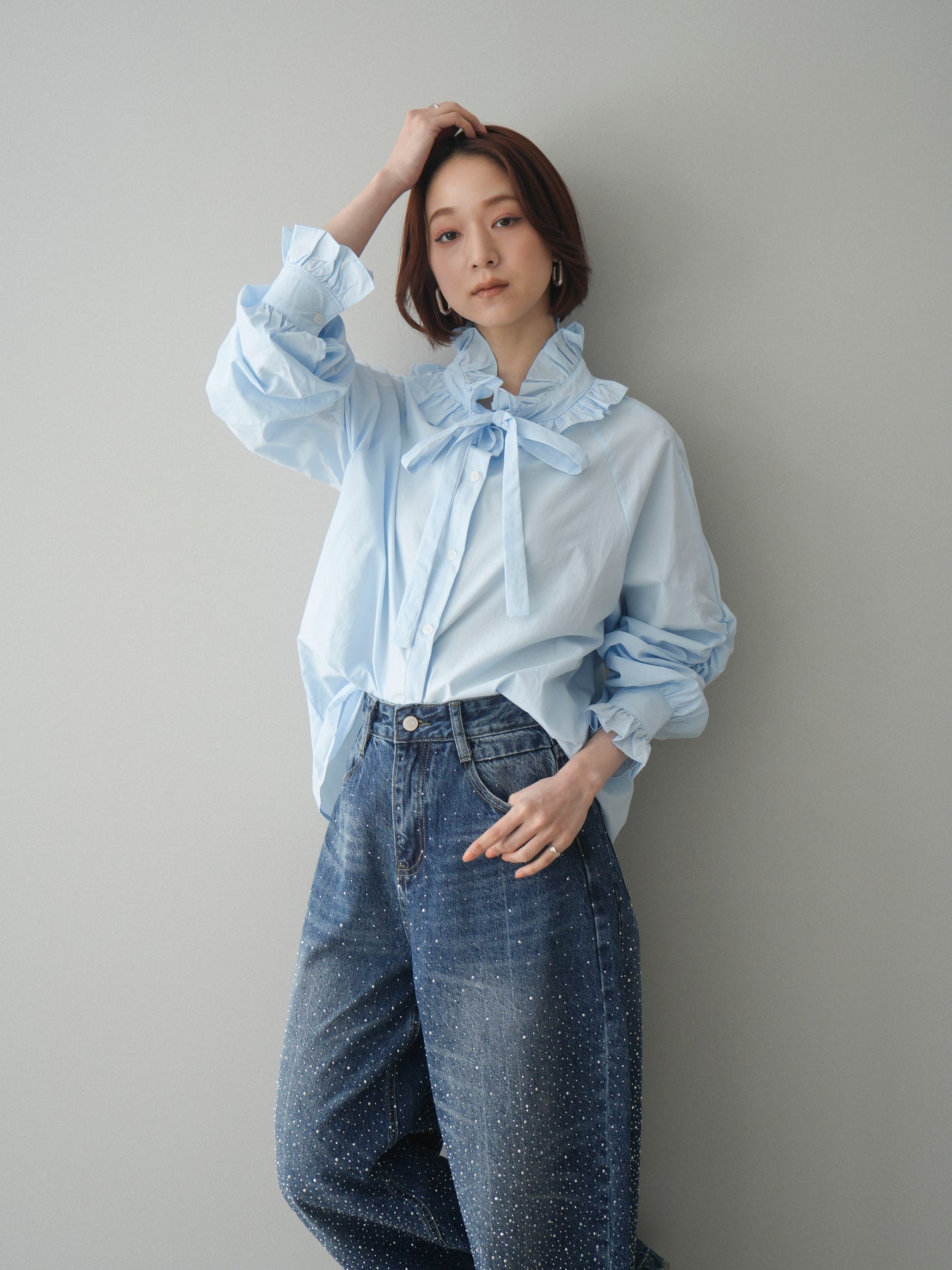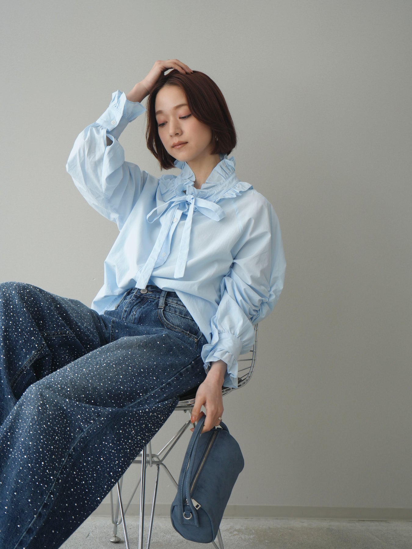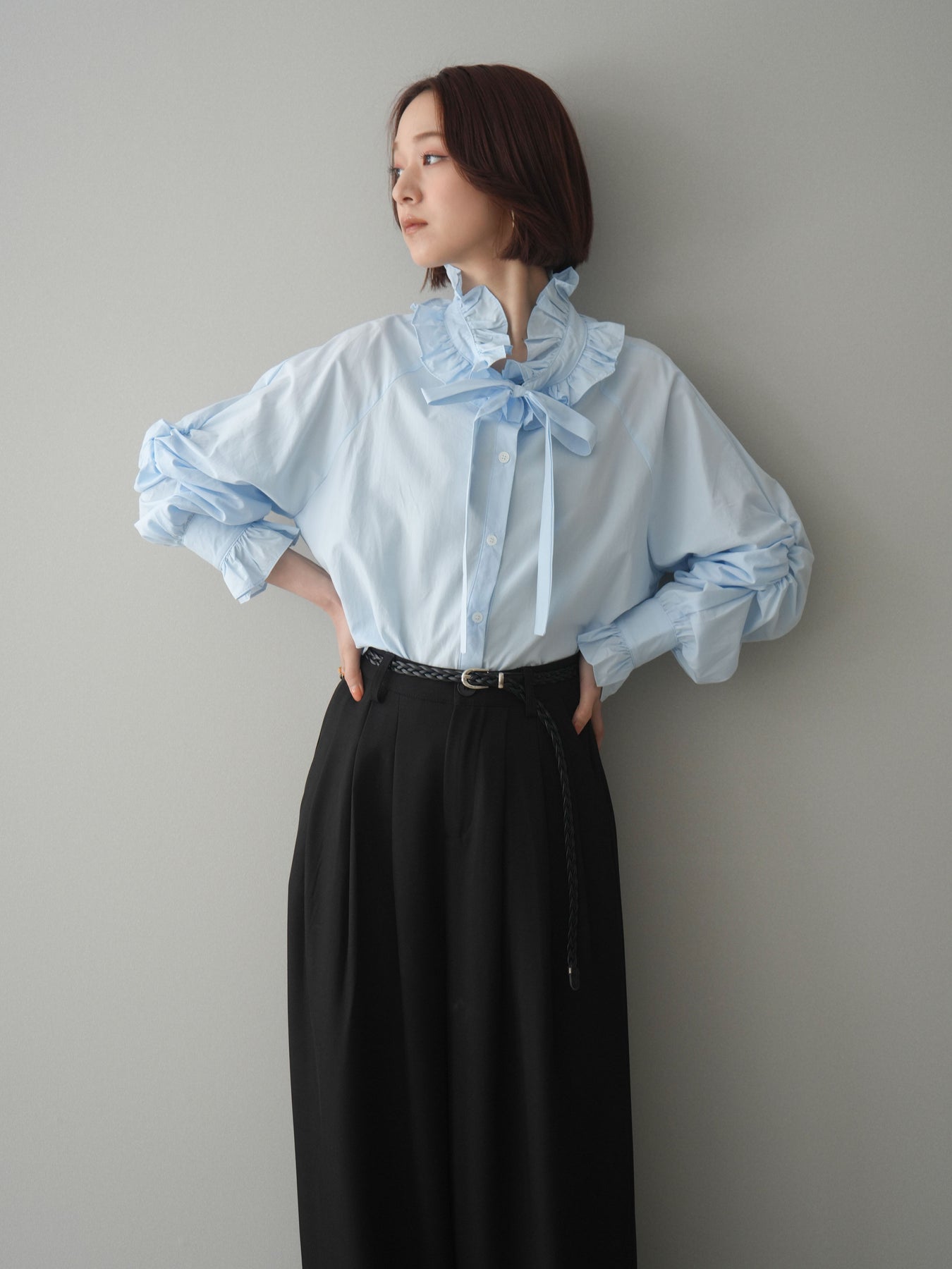 顔まわりを華やかに演出するフリルデザインが印象的なブラウス。ネックラインのギャザーとリボンディテールが柔らかな立体感を生み、上品さの中にさりげない甘さをプラスします。袖にもシャーリングを施し、程よいボリューム感で一枚でも存在感のある仕上がりに。パンツにもスカートにも合わせやすく、オンオフ問わず活躍する着映えアイテムです。 ※ボトムス、キャミソール(インナー)以外の商品は一律でインナーは付属していません