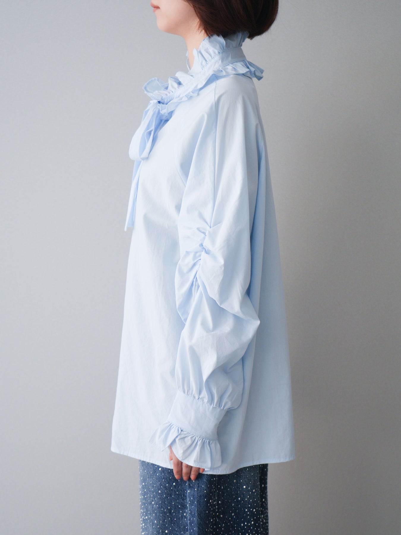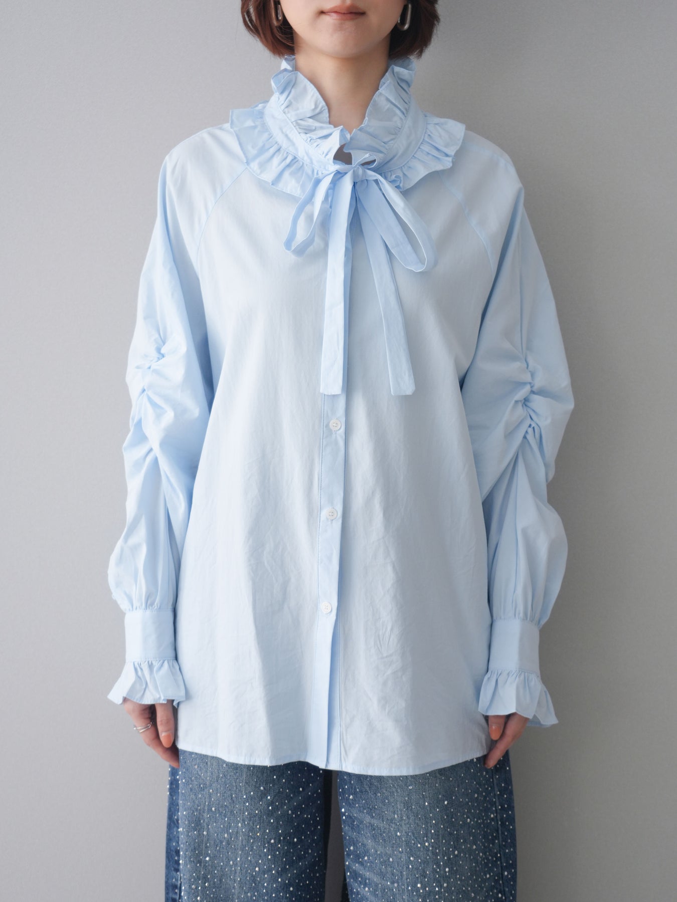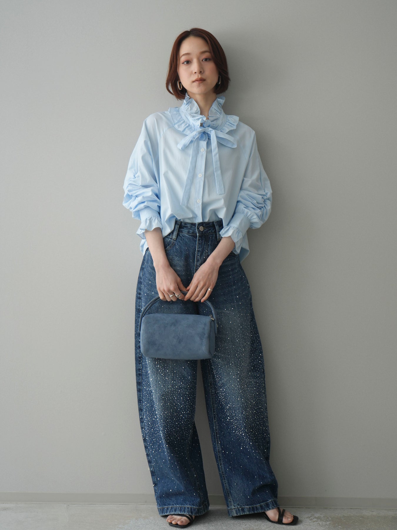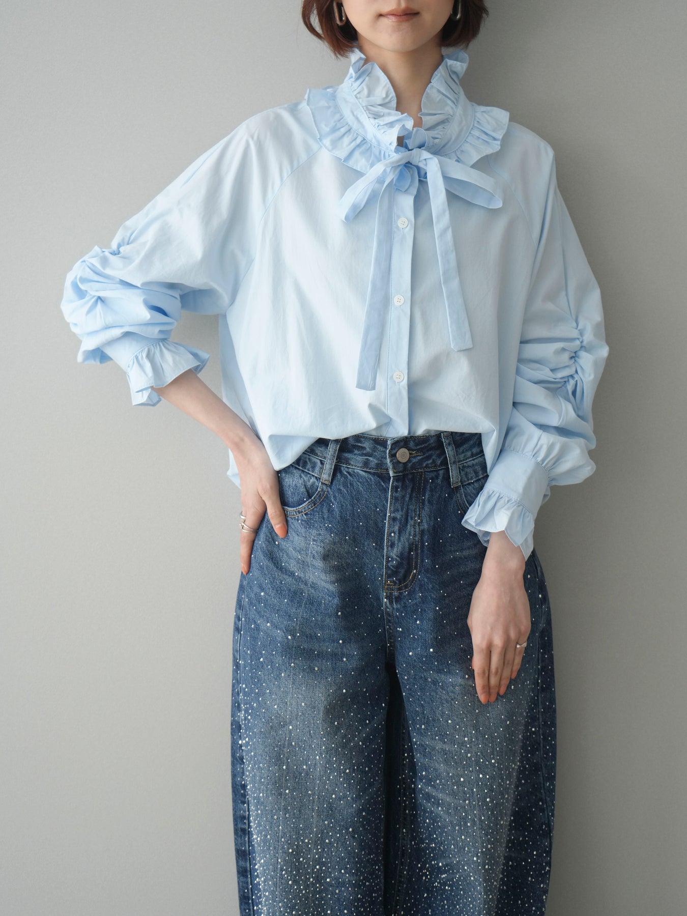 顔まわりを華やかに演出するフリルデザインが印象的なブラウス。ネックラインのギャザーとリボンディテールが柔らかな立体感を生み、上品さの中にさりげない甘さをプラスします。袖にもシャーリングを施し、程よいボリューム感で一枚でも存在感のある仕上がりに。パンツにもスカートにも合わせやすく、オンオフ問わず活躍する着映えアイテムです。 ※ボトムス、キャミソール(インナー)以外の商品は一律でインナーは付属していません