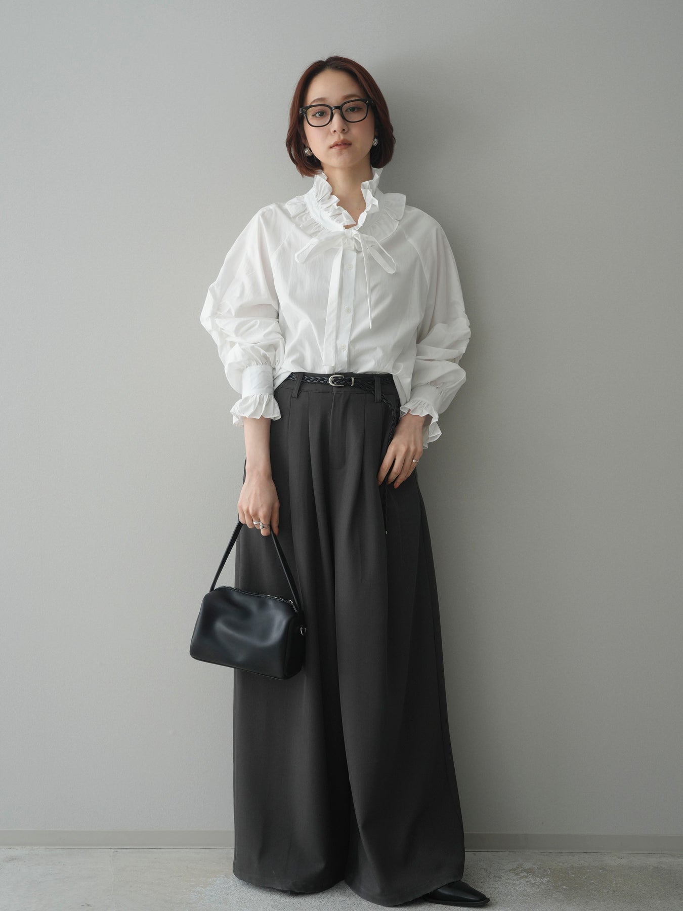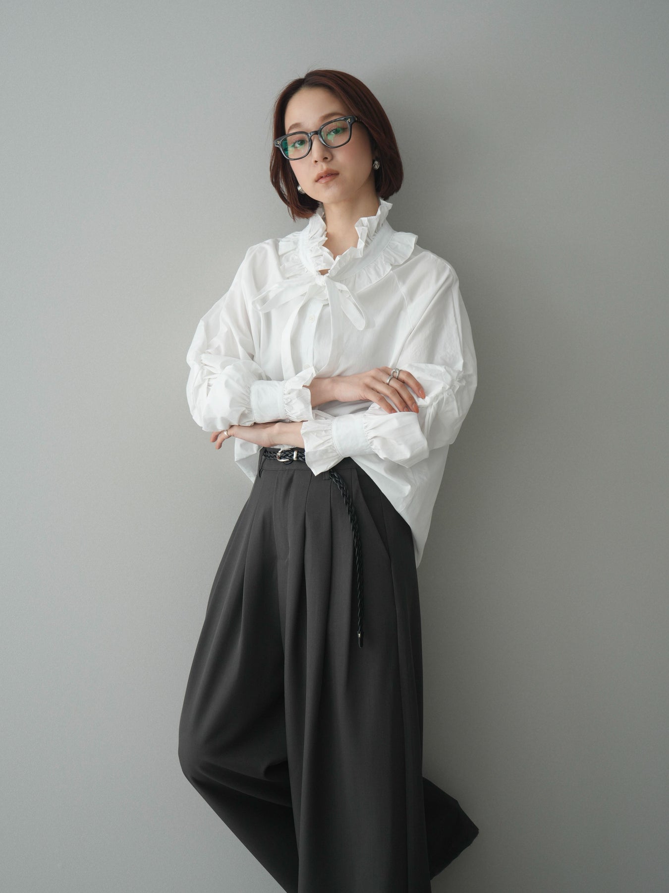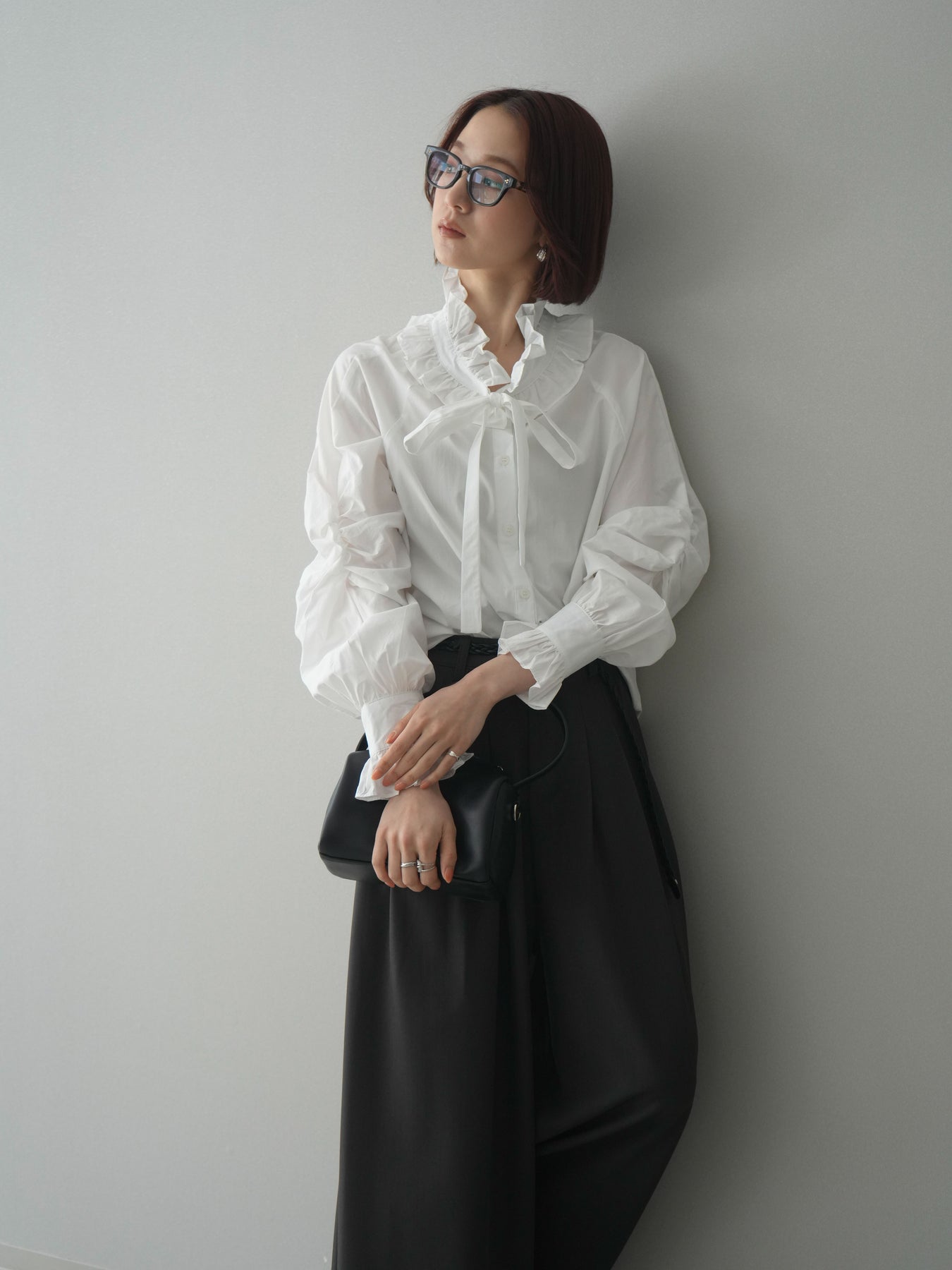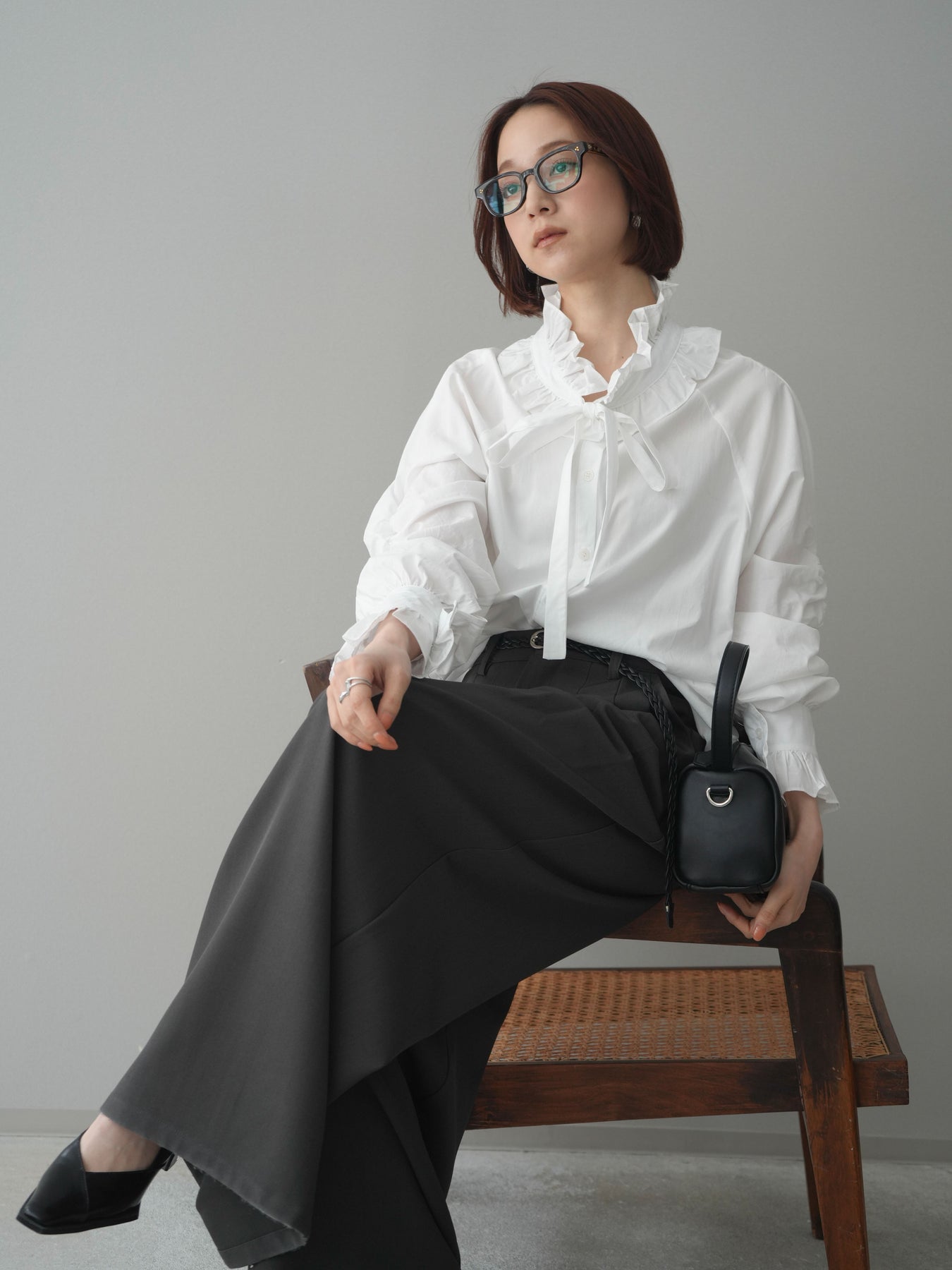 顔まわりを華やかに演出するフリルデザインが印象的なブラウス。ネックラインのギャザーとリボンディテールが柔らかな立体感を生み、上品さの中にさりげない甘さをプラスします。袖にもシャーリングを施し、程よいボリューム感で一枚でも存在感のある仕上がりに。パンツにもスカートにも合わせやすく、オンオフ問わず活躍する着映えアイテムです。 ※ボトムス、キャミソール(インナー)以外の商品は一律でインナーは付属していません