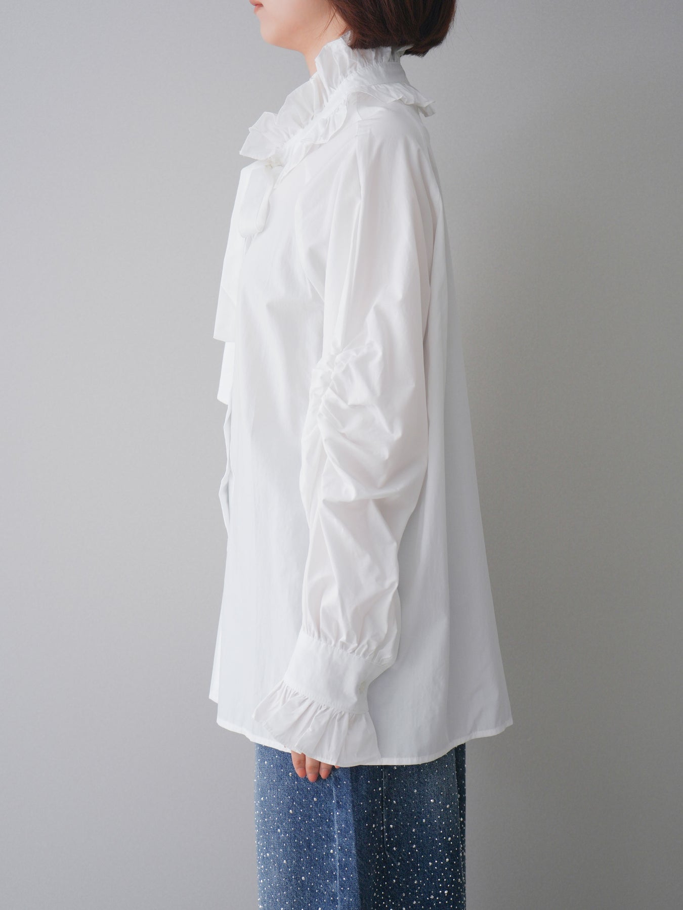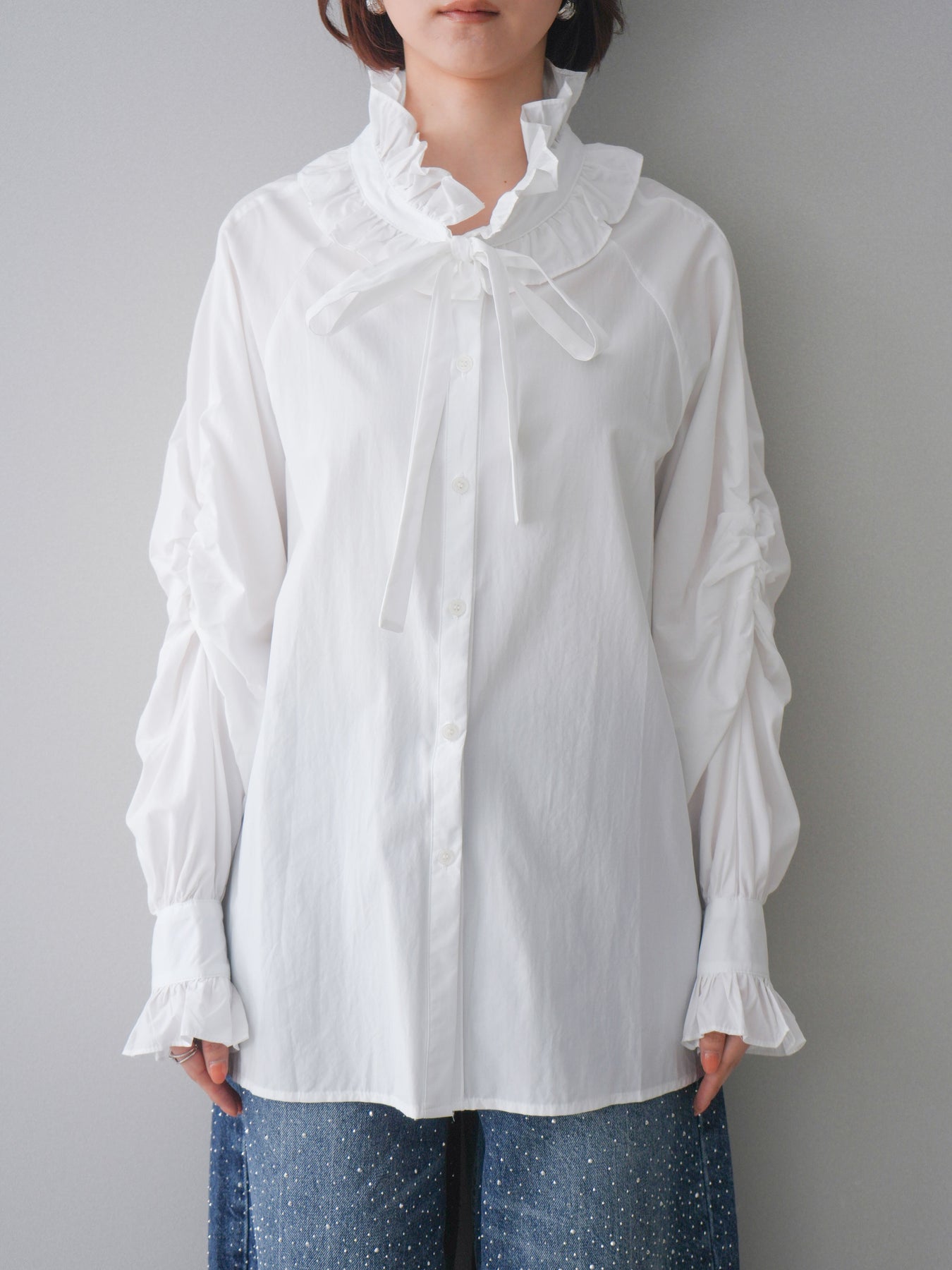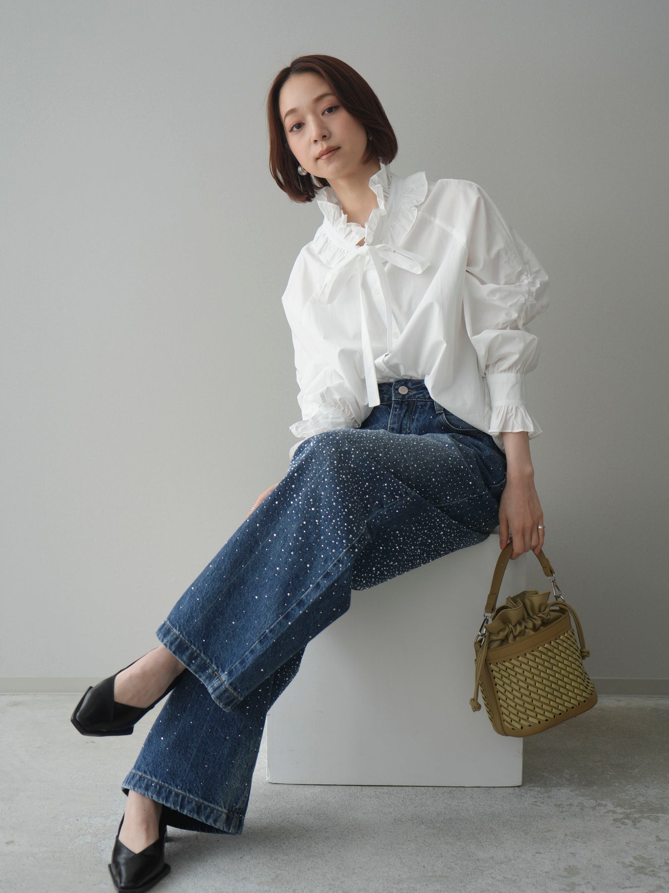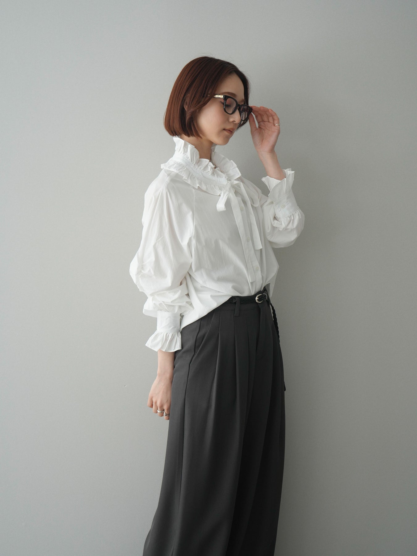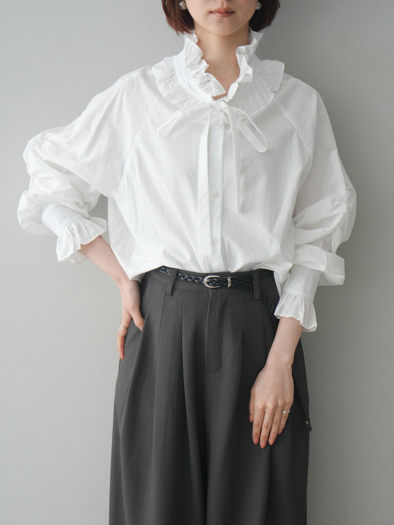 顔まわりを華やかに演出するフリルデザインが印象的なブラウス。ネックラインのギャザーとリボンディテールが柔らかな立体感を生み、上品さの中にさりげない甘さをプラスします。袖にもシャーリングを施し、程よいボリューム感で一枚でも存在感のある仕上がりに。パンツにもスカートにも合わせやすく、オンオフ問わず活躍する着映えアイテムです。 ※ボトムス、キャミソール(インナー)以外の商品は一律でインナーは付属していません