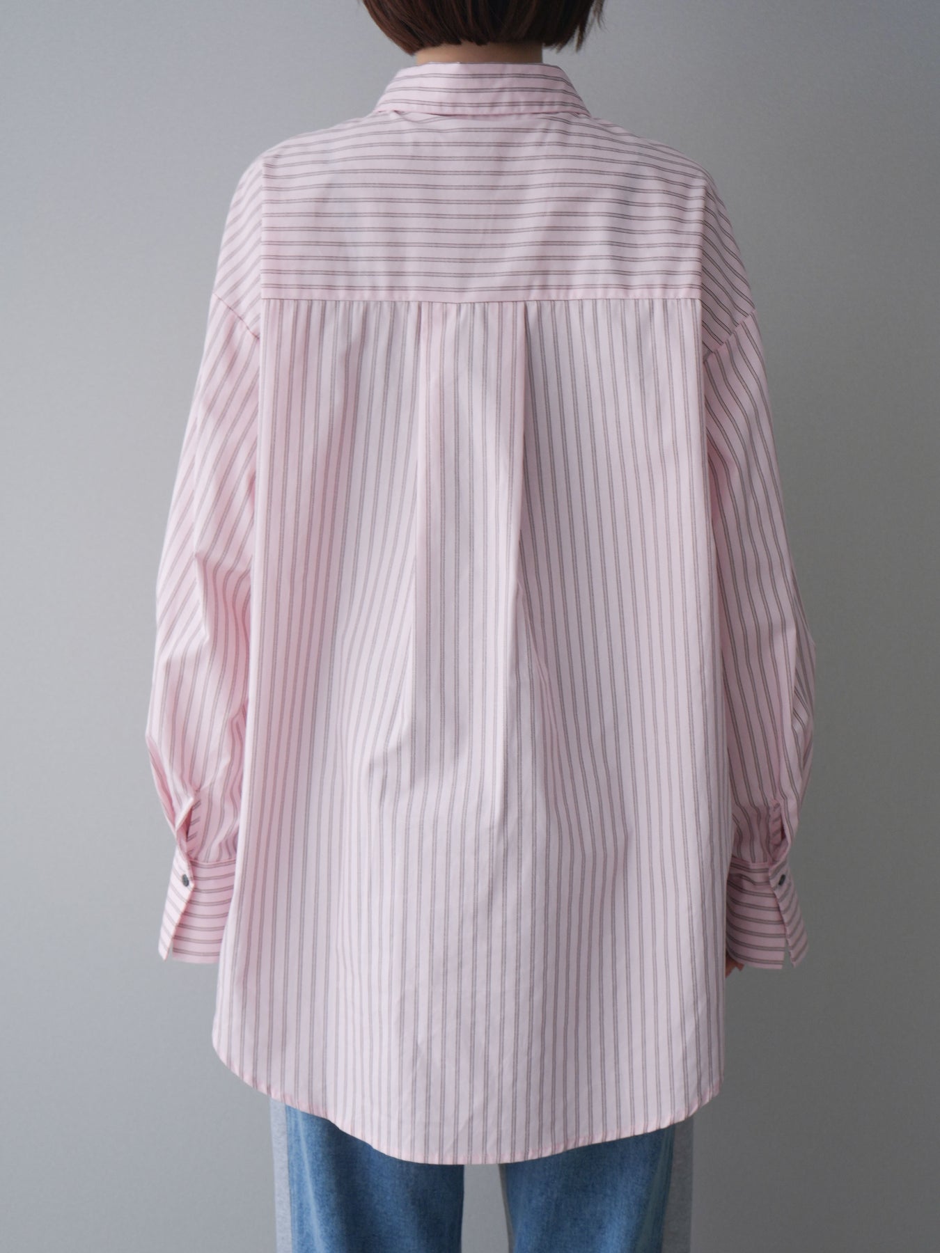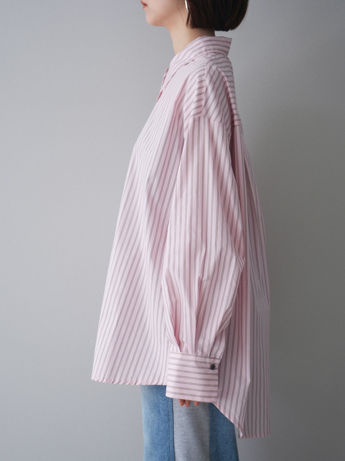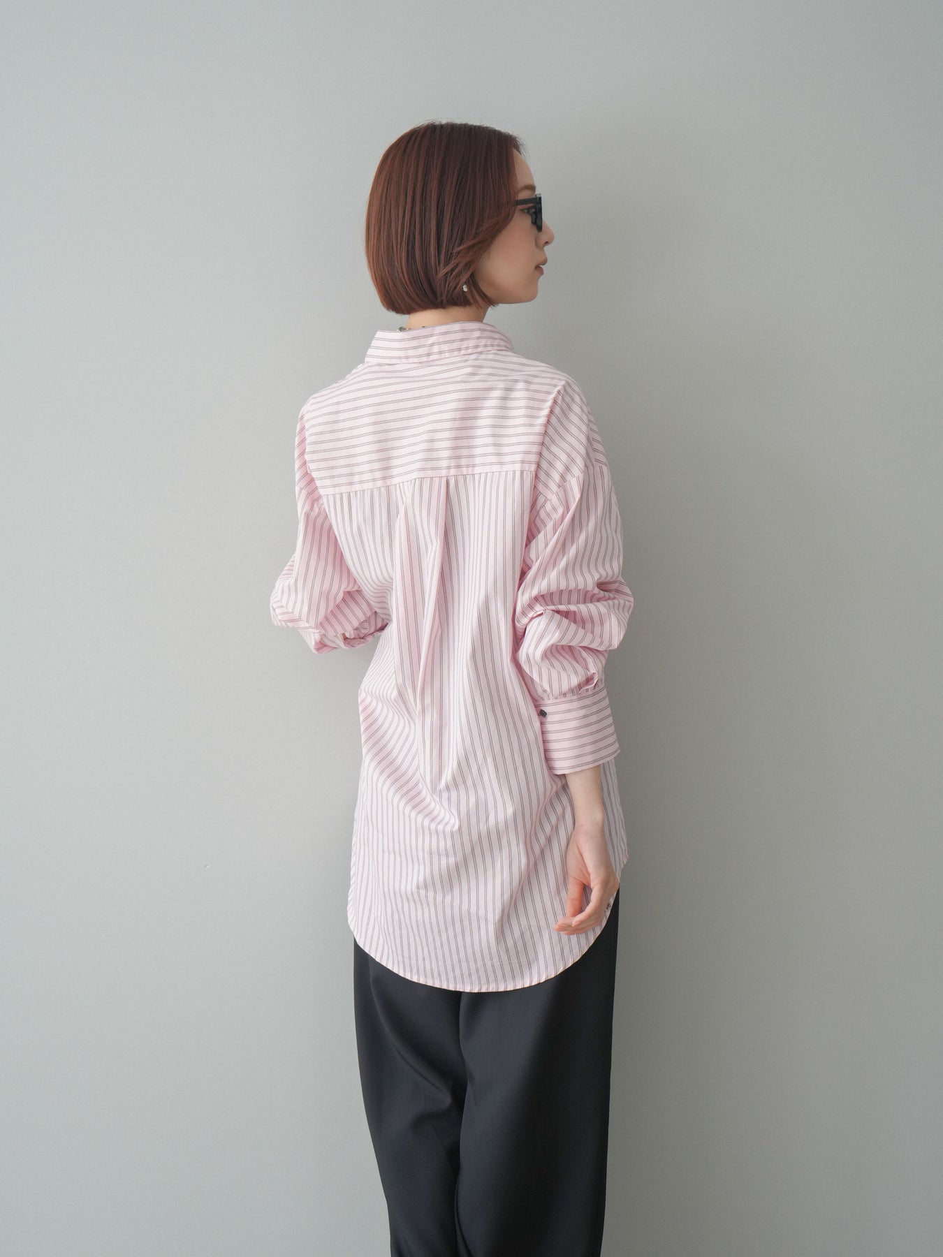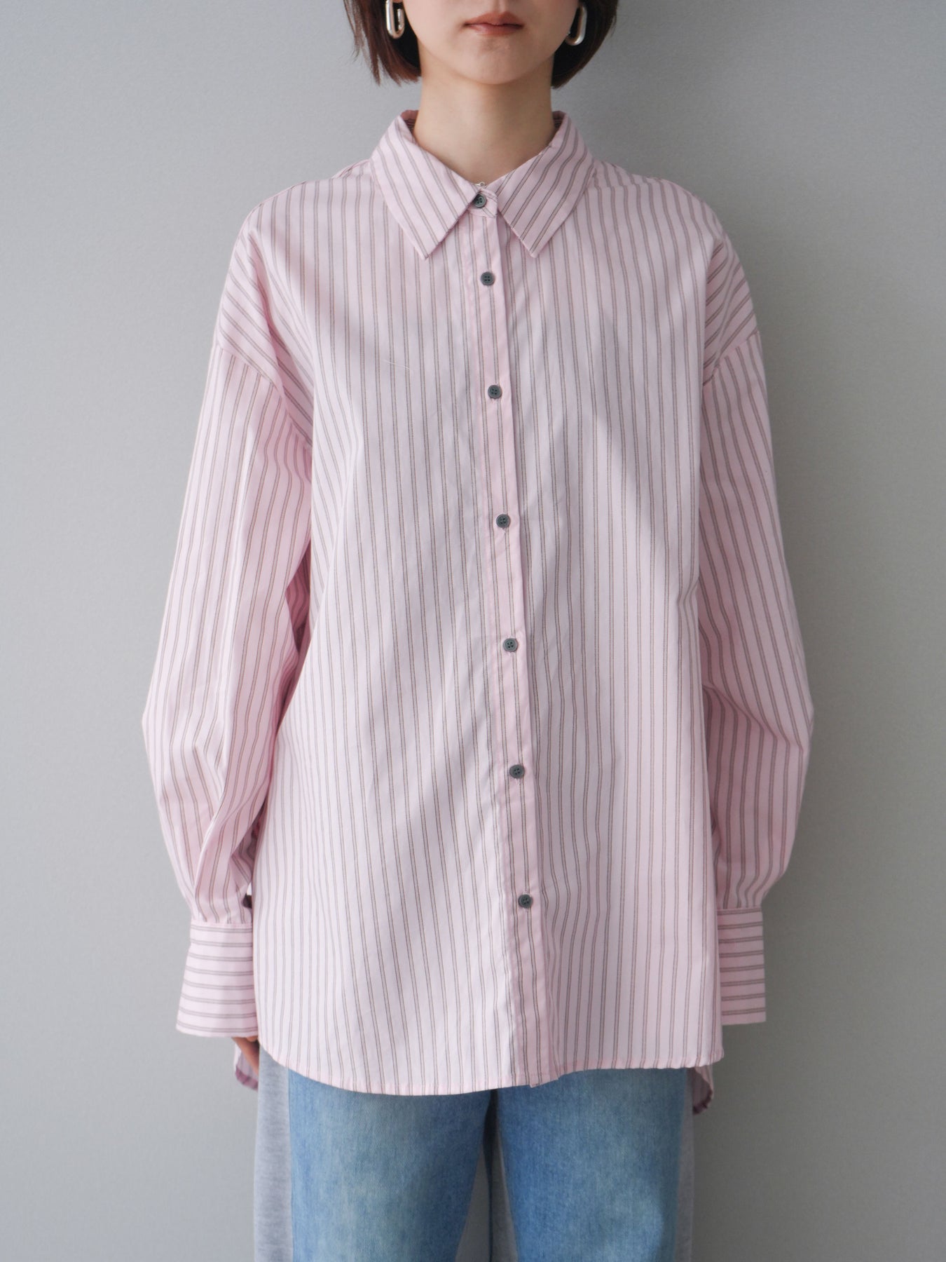 程よくハリのある素材感で仕立てた、ストライプ柄のルーズシャツ。ゆとりのあるシルエットが抜け感を演出し、さらっと羽織るだけでこなれた印象に仕上がります。前後2way仕様で、ベーシックなシャツとしてはもちろん、ボタンをアレンジしてラップ風に着こなすなど表情の変化を楽しめる一枚。ヒップにかかる長めの着丈で、パンツスタイルにもバランスよく合わせていただけます。 ※ボトムス、キャミソール(インナー)以外の商品は一律でインナーは付属していません